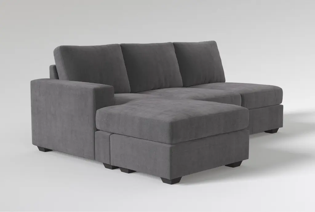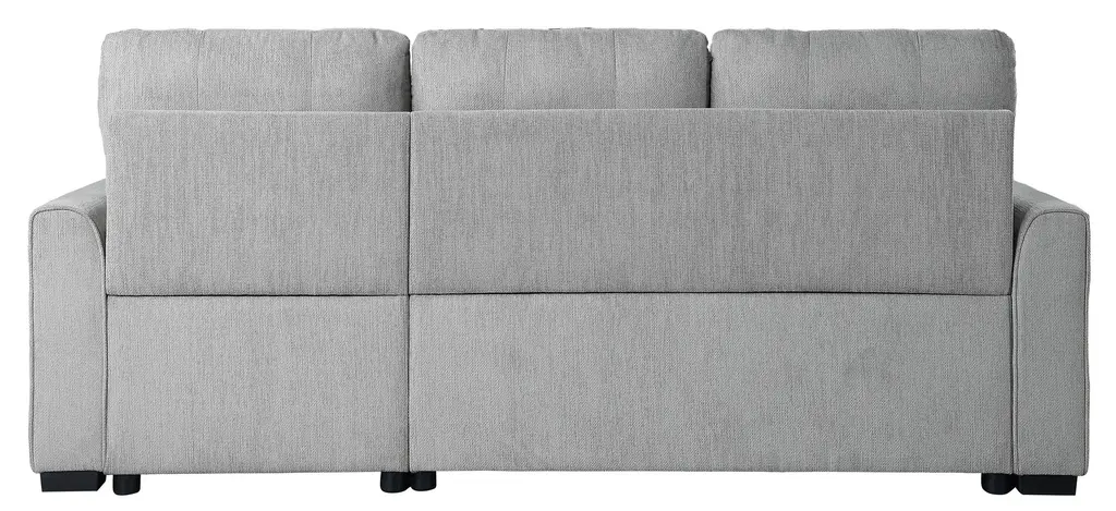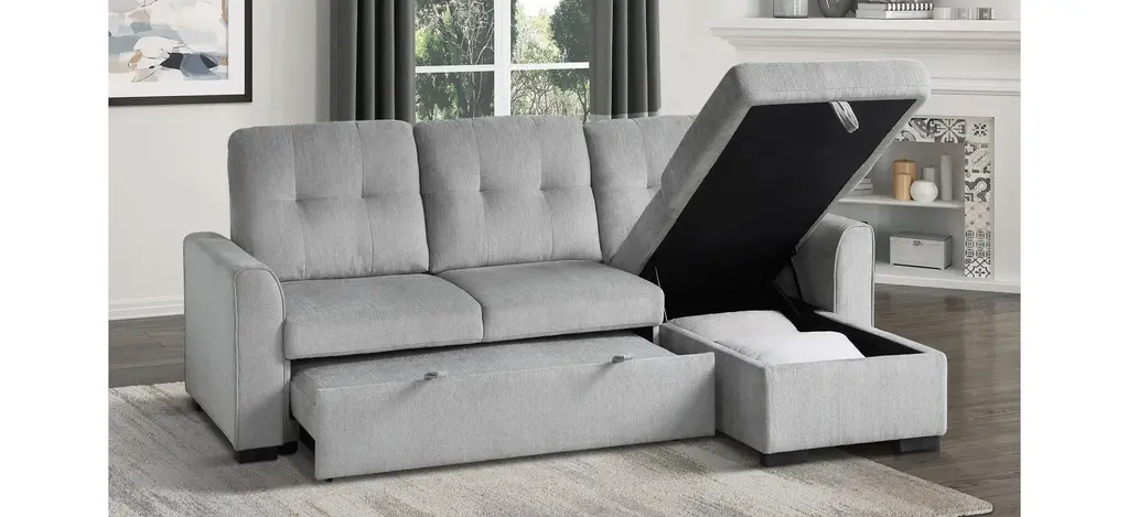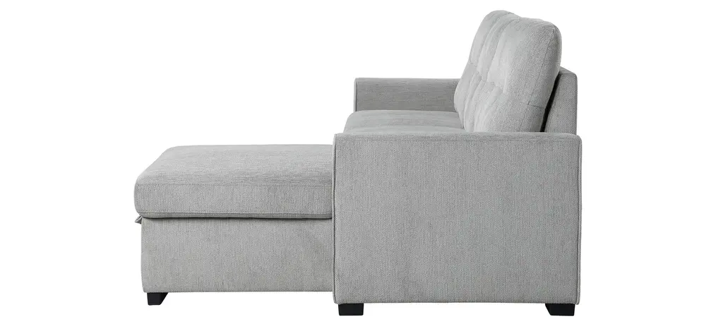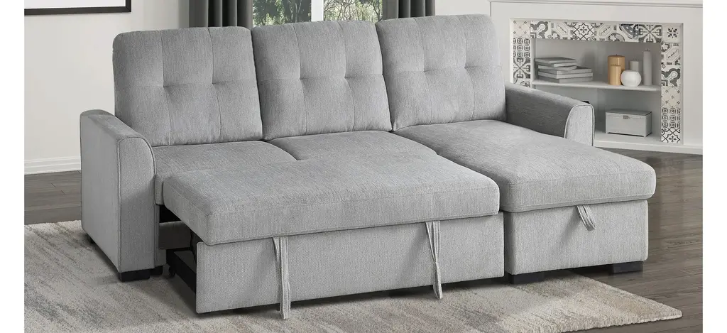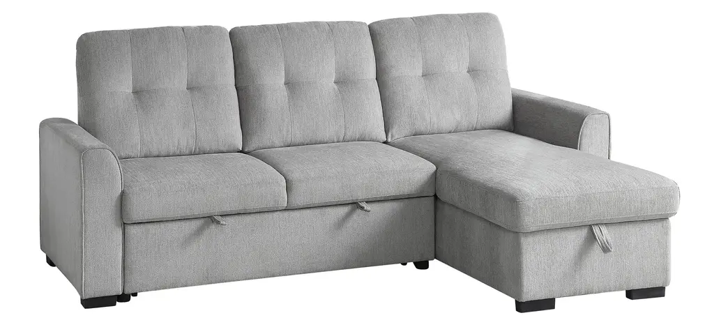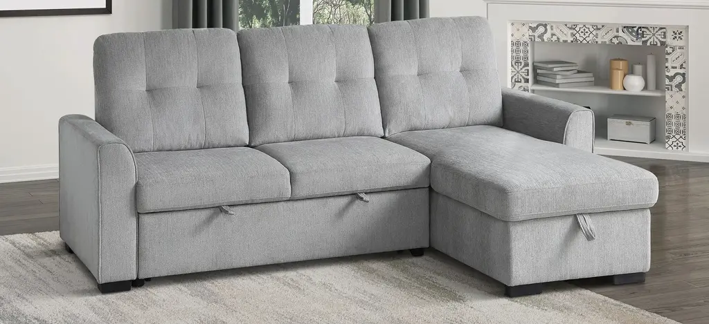 Customizable for your casual living room's available space, the Ember 2-pc. Reversible Sectional w/ Sleeper functionality goes beyond that of a traditional sofa. Covered in light gray chenille, the transitional profile of this seating group is complemented by stitch tufting and track-style arms. Conveniently stored beneath the sofa is a pull-out trundle that rises to create a bed while the top of the attached chaise opens to reveal under-seat storage. The chaise can be configured as right or left side placement based on the needs of your space.