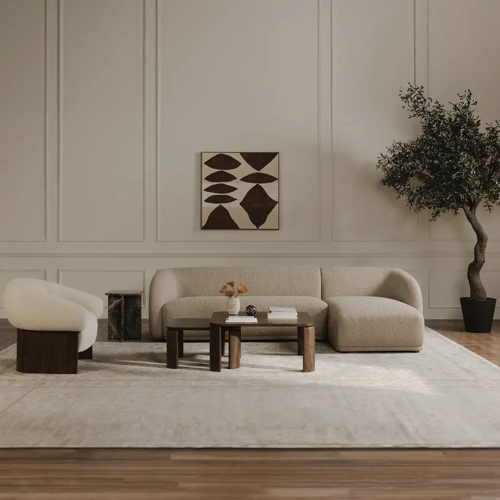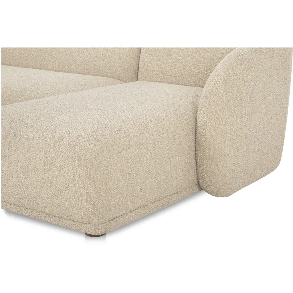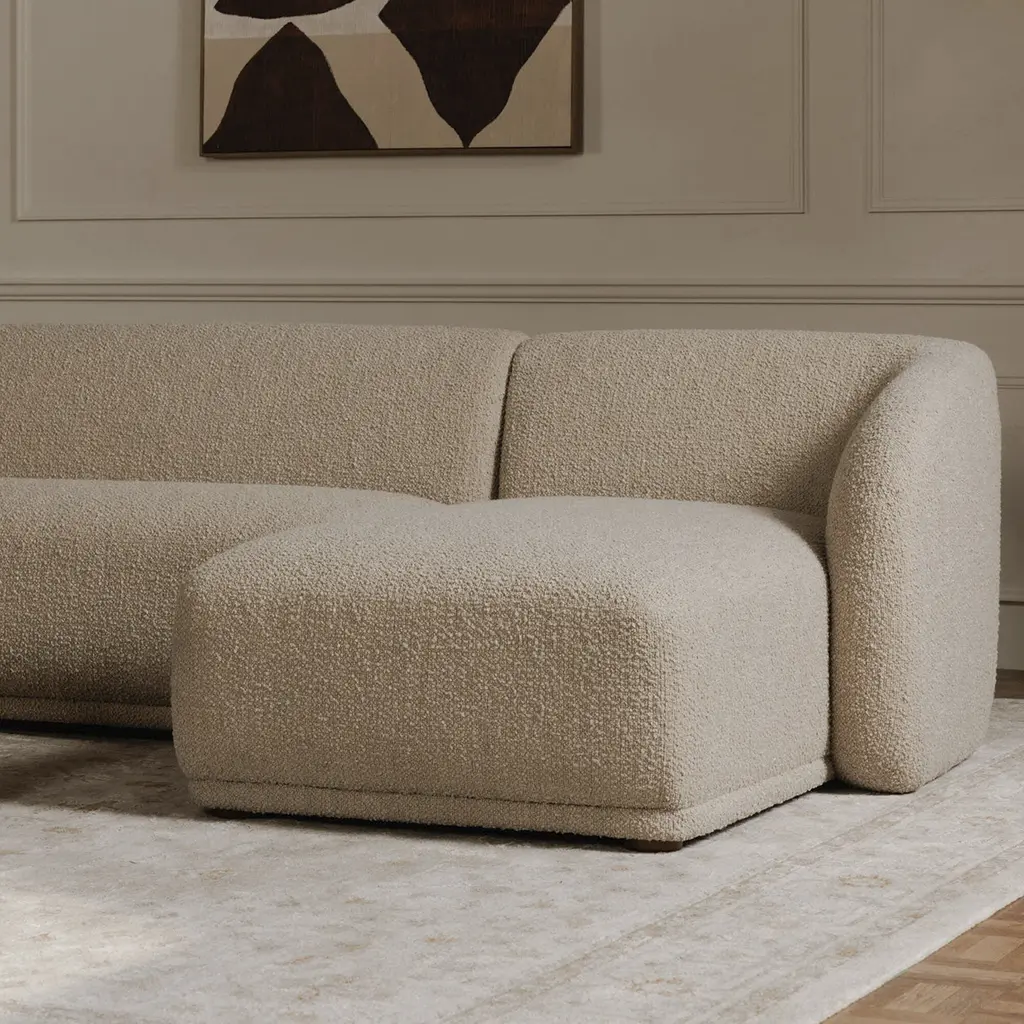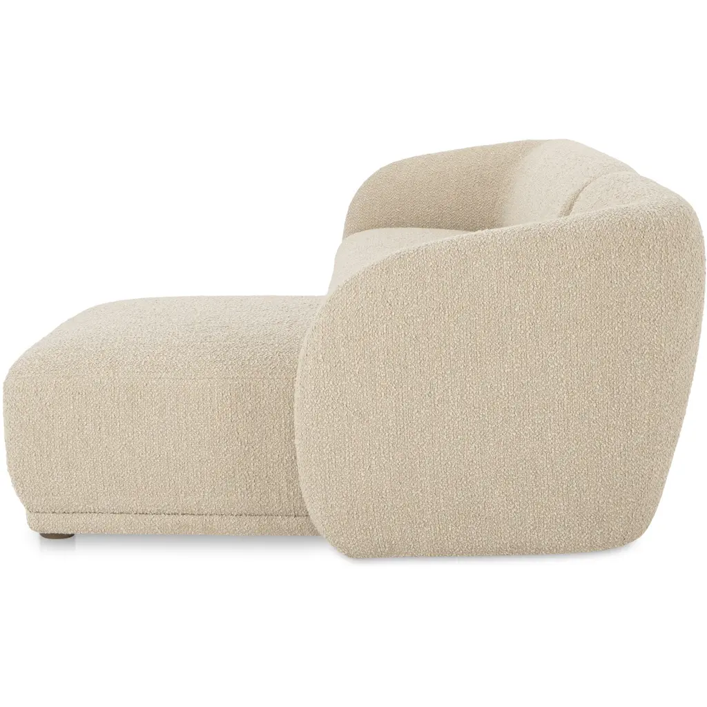 Constructed from solid beech and plywood, the Faye sectional's unique curved back and firm, fixed bench seat rest on petite, rounded rubberwood legs. The exaggerated boucle fabric with a robust 100,000 rub count brings depth and an art deco feel to its contemporary form--a touch of elegance to expansive living.