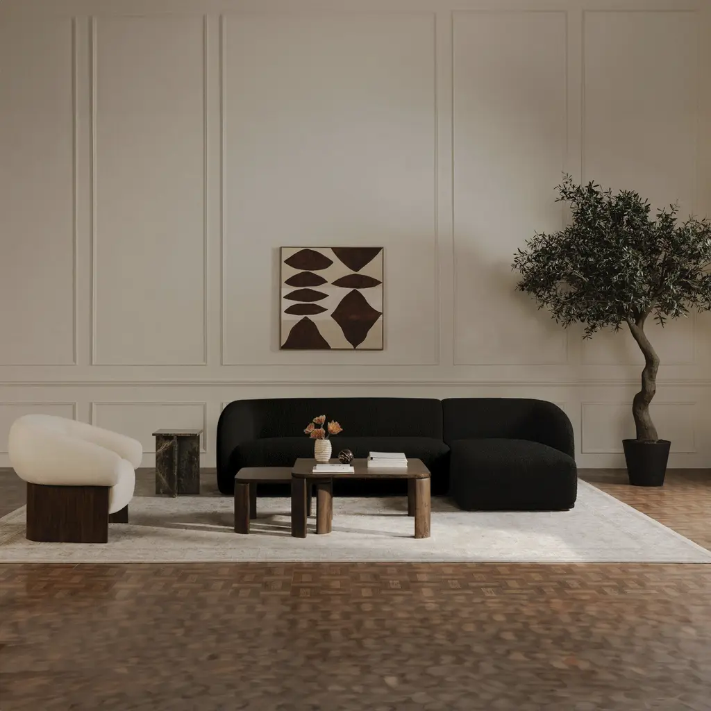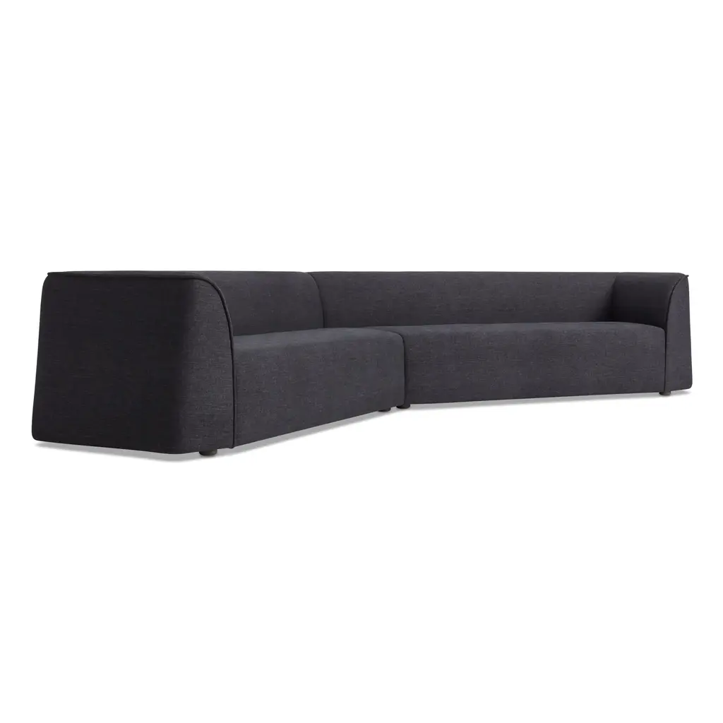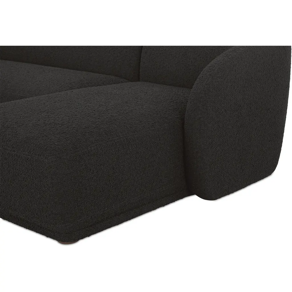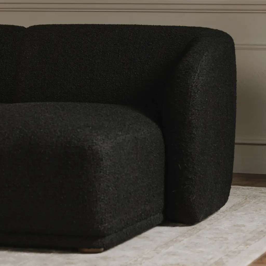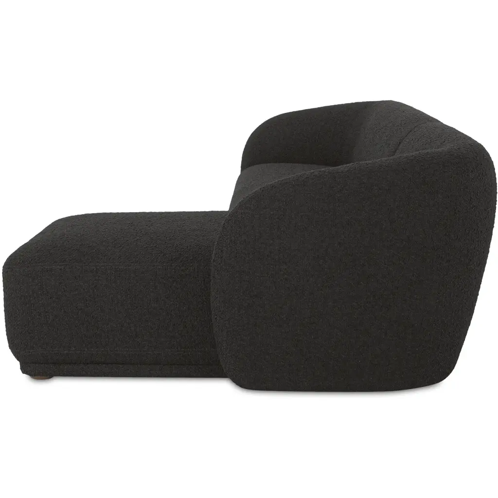 Constructed from solid beech and plywood, the Faye sectional's unique curved back and firm, fixed bench seat rest on petite, rounded rubberwood legs. The exaggerated boucle fabric has a robust 100,000 rub count bringing depth and an art deco feel to its contemporary form--a touch of elegance to expansive living.