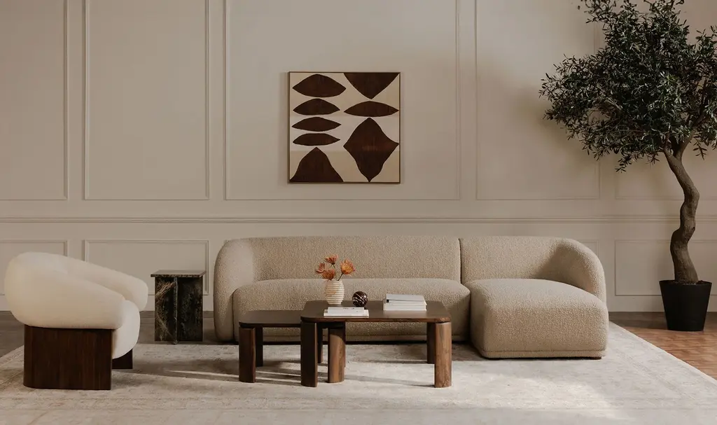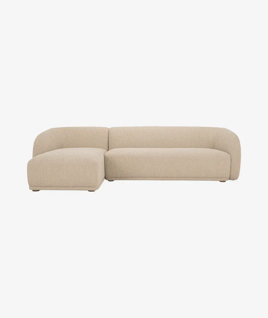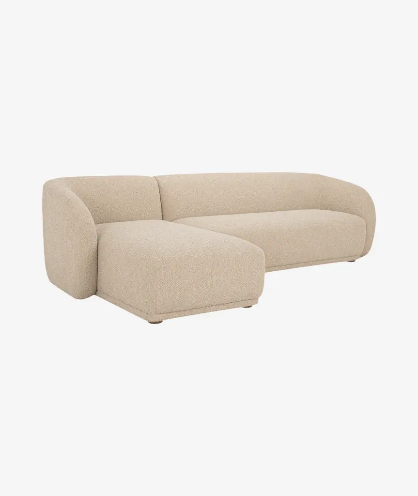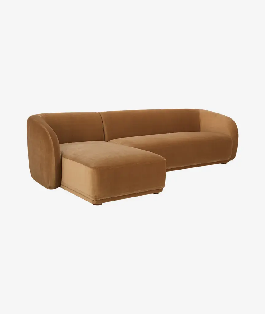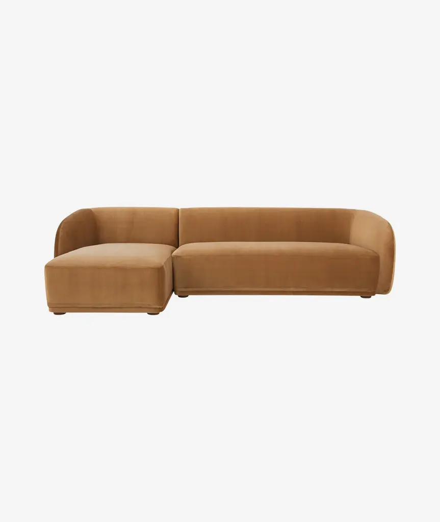 Constructed from solid beech and plywood, the Faye sectional's unique curved back and firm, fixed bench seat rest on petite, rounded rubber wood legs. The neutral tan and faux mohair fabric is denser and more plush than velvet, bringing durability and comfort to its contemporary form - a touch of elegance to expansive living.