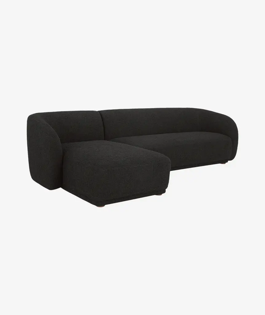 Constructed from solid beech and plywood, the Faye sectional's unique curved back and firm, fixed bench seat rest on petite, rounded rubber wood legs. The neutral tan and faux mohair fabric is denser and more plush than velvet, bringing durability and comfort to its contemporary form - a touch of elegance to expansive living.