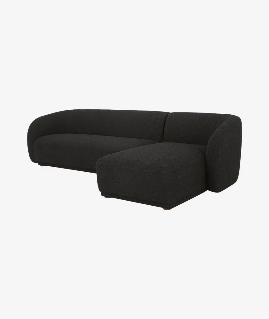 Constructed from solid beech and plywood, the Faye sectional's unique curved back and firm, fixed bench seat rest on petite, rounded rubber wood legs. The neutral tan and faux mohair fabric is denser and more plush than velvet, bringing durability and comfort to its contemporary form - a touch of elegance to expansive living.