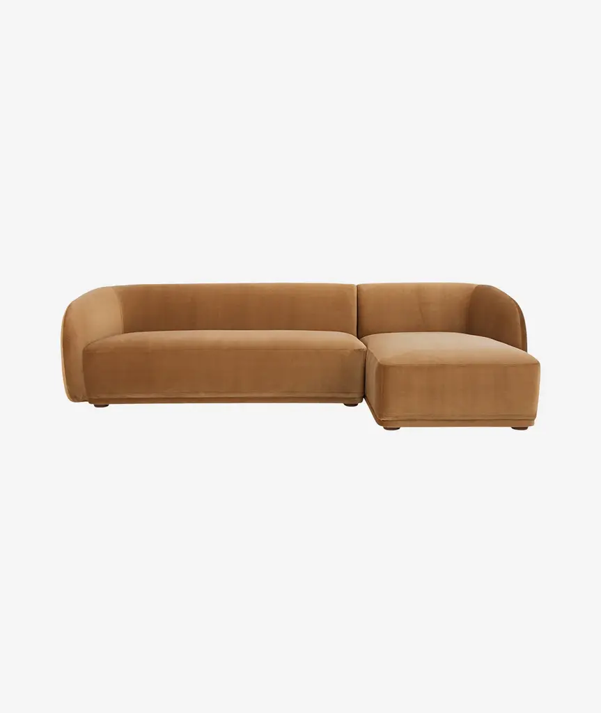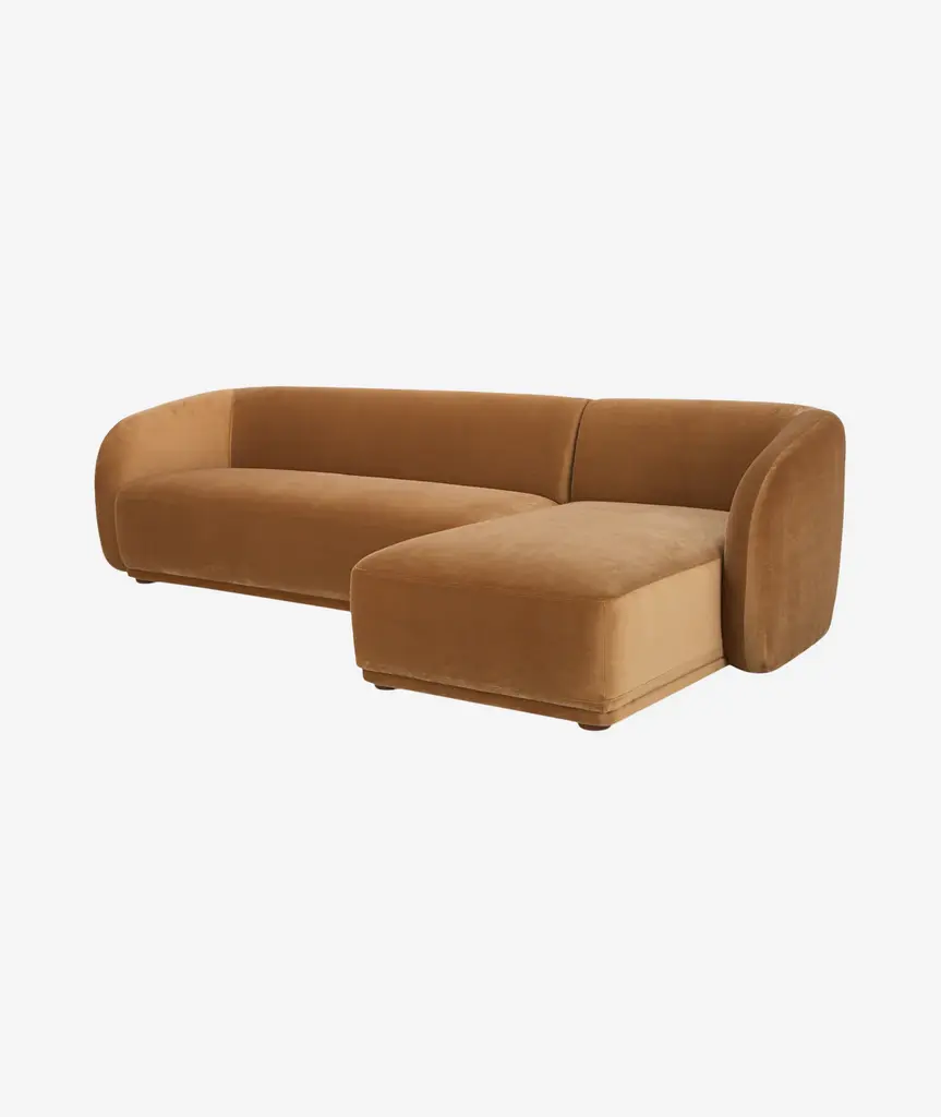 Constructed from solid beech and plywood, the Faye sectional's unique curved back and firm, fixed bench seat rest on petite, rounded rubber wood legs. The neutral tan and faux mohair fabric is denser and more plush than velvet, bringing durability and comfort to its contemporary form - a touch of elegance to expansive living.