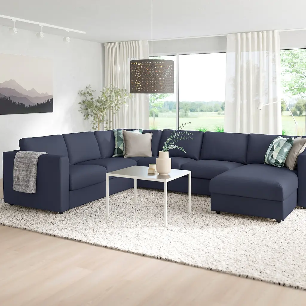 FINNALA Sectional, 5-seat corner - with chaise/Orrsta black-blue. This comfortable sofa has pocket spring seat cushions with high resilience foam and a top layer of wadding. It provides a nice comfort and support for your body while maintaining the shape of the seat cushions.