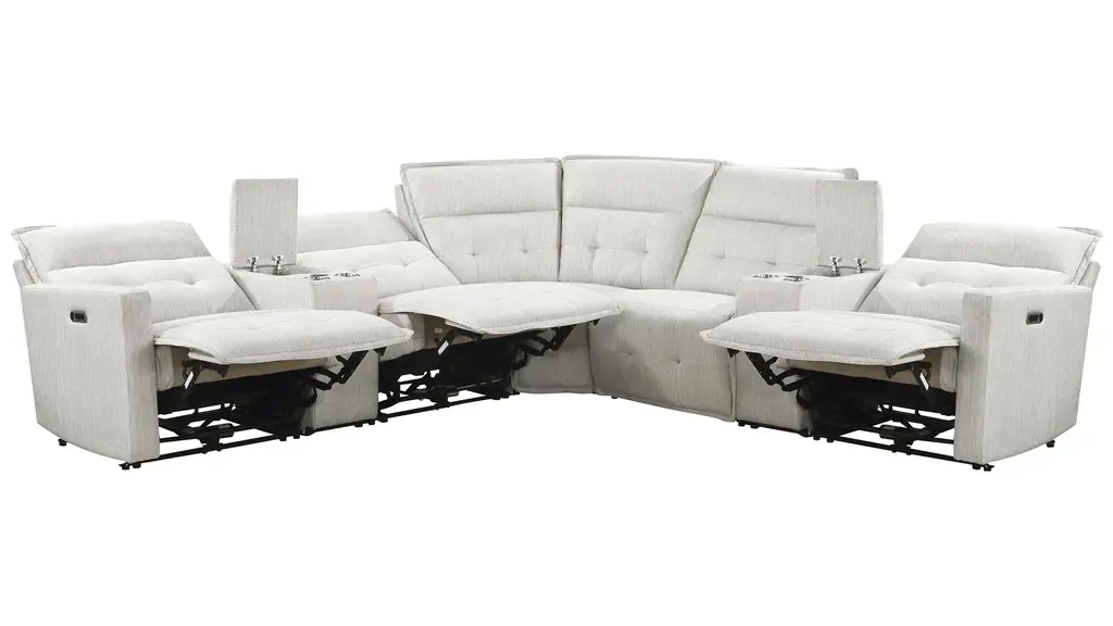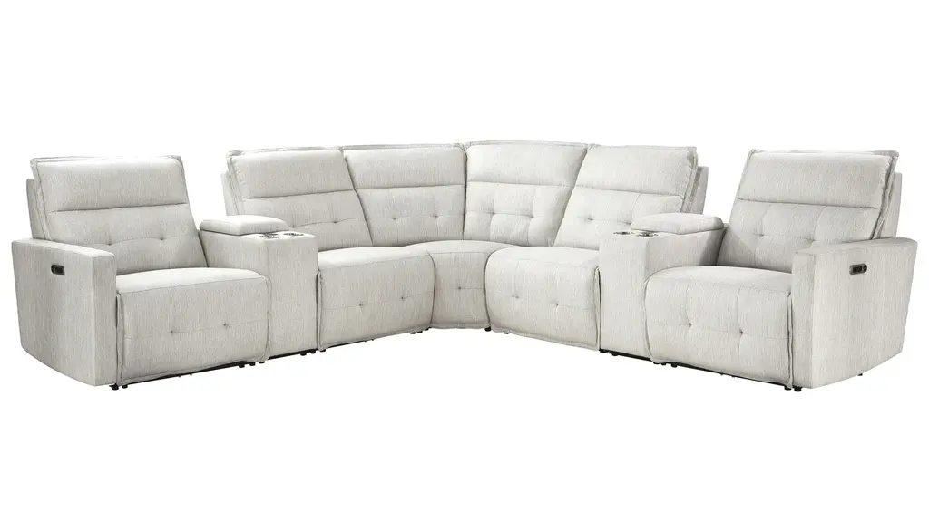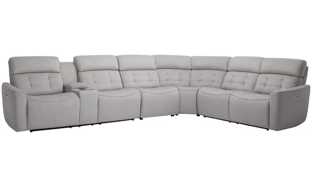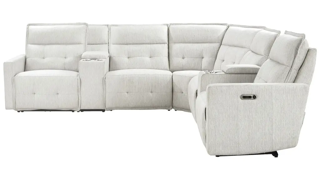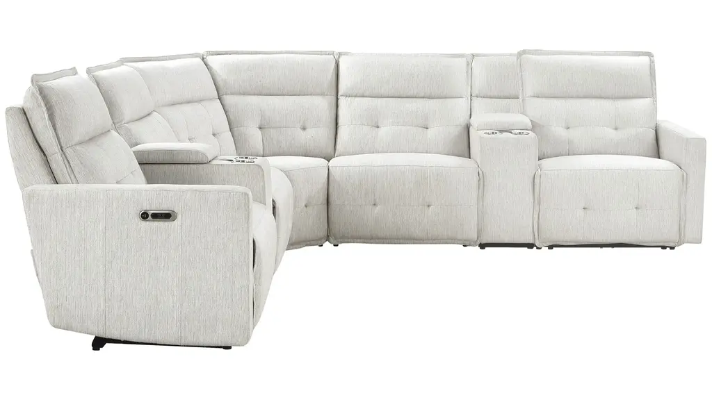With an expanse of seating to fill your living room, the Fitch 7-pc. Power Reclining Sectional lends modern style, function, and comfort to your home. Hemp white textured fabric upholstery covers the collection, it's light hue an airy palette for your decorative preferences. Power-enhanced reclining functions support ease of movement for the reclining chair, power armless chair, and power left and right recliners. The two console units each feature a wireless charging pad, and cupholders while the corner unit anchors the sectional's seating expansion, and the armless chair provides movement-free seating. The seating profile of the collection features knife-edge tailoring, and contour stitching, each element lending to the modern aesthetic.