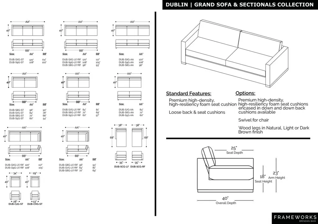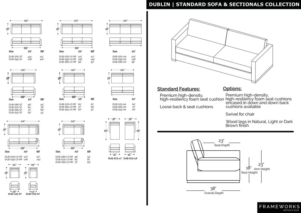 The Dublin low leg sofa and sectional take inspiration and form from southwestern architecture, with its narrow and defined track arm. The profile is uniquely captured by the wood sled leg that runs the length of the silhouette. The sofa has a deep but perfectly crowned seat cushion which creates an elegant seating experience.Product will require buyers own material to be used (COM) The Dublin frame is exclusive to the collection. Upholstery brand, Frameworks, exclusive to Brendan Bass.