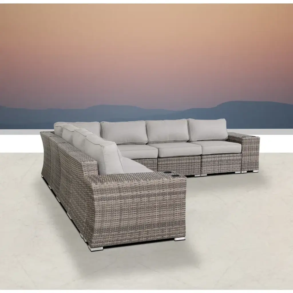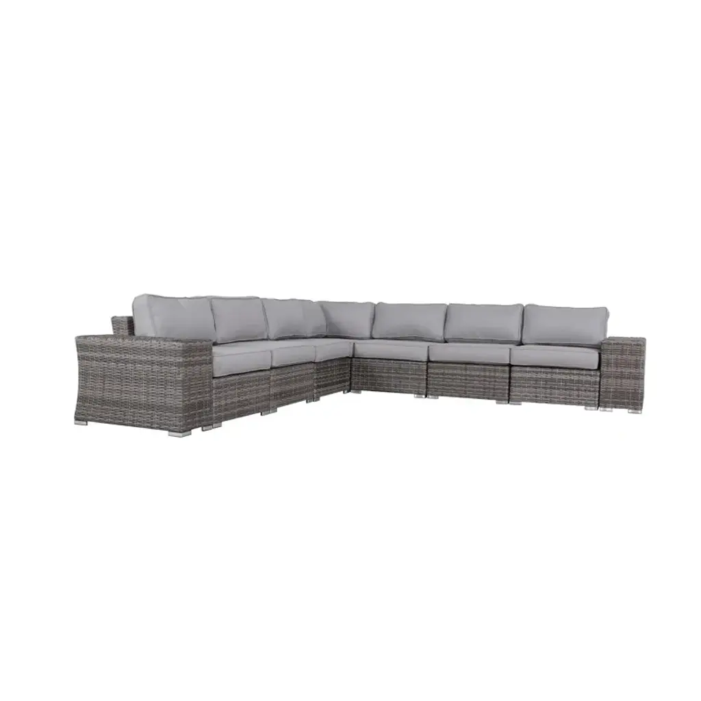 About This Product Upgrade your outdoor space with this spacious and stylish patio sectional sofa, designed for comfort and durability. Featuring a rustproof aluminum frame wrapped in weather-resistant wicker rattan, this modern sectional offers excellent resistance to water, UV rays, mildew, and fading. Its generous size provides seating for up to seven people, perfect for entertaining guests or enjoying a relaxing afternoon outdoors. The plush cushions come with removable, machine-washable covers for easy maintenance. Fully assembled for your convenience, this sectional creates an inviting setting for effortless outdoor relaxation. Key Features Rustproof Aluminum Frame: Lightweight and durable. Weather-Resistant Wicker: Resists water, UV rays, mildew, and fading. Marine-Grade Olefin Fabric: Cushions are designed for year-round use. Interlocking Clips: Keep furniture pieces securely in place. Scratch-Free Nylon Feet: Protect your flooring. Commercial-Grade Construction: Built for lasting use. Fully Assembled: No setup required, just open and enjoy. Specifications Overall Dimensions: 26' H x 130' W x 130' D Cushions: 5' H x 28' W x 28' D, Back Cushion Thickness: 7' Seat Height (Without Cushion): 13' Weight Capacity: 2,100 lbs. Overall Weight: 241 lbs. Product Details Seating Capacity: 7 Cushions Included: 15 (Water, UV, and Weather Resistant) Removable, Machine-Washable Cushion Covers: Olefin fabric for easy cleaning. Modular Design: Reversible, with flexible arrangement options. Seating Outer Frame Material: Wicker Foam Density: 1.6 lbs./cu. ft., Open Cell Foam Included Items: Sofa, sectional, chair, cushions, and a cup holder. Durability Resistant to rust, weather, UV rays, mold, and mildew for year-round use. We love that this larger patio sectional sofa combines comfort and durability to elevate your outdoor living space. The sofa features a sturdy aluminum frame and is beautifully wrapped in wicker rattan, providing both a modern look and excellent resistance to water, UV rays, mildew, and fading. With its generous size, it offers ample seating space for you and your guests for six people. It comes with cushions, each sporting removable covers for easy cleaning and maintenance.