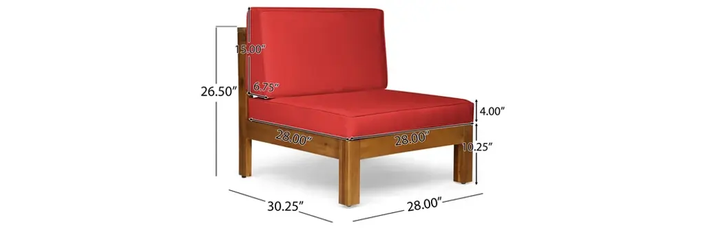 For the host or hostess looking to make a statement at every backyard get-together, a configurable outdoor sectional sofa set is an indispensable element of any outdoor furniture set-up. This fully modular assemblage seats five and is truly extravagant - featuring solid acacia wood frames and plush outdoor cushions, you and your guests will never again be in want of a place to rest while making memories at home. A contemporary take on an iconically retro concept.Includes: One (1) Right Arm Chair, One (1) Left Arm Chair, Two (2) Armless Chairs, One (1) Corner ChairFrame Material: Acacia WoodCushion Material: Water Resistant FabricMultiple Color OptionsAssembly RequiredAll Dimensions Exclude Cushion MeasurementsLeft and Right Arm Chair Dimensions: 30.25 inches deep x 30.25 inches wide x 26.50 inches highLeft and Right Arm Chair Seat Dimensions: 28.00 inches deep x 28.00 inches wide x 10.25 inches highCorner Chair Dimensions: 30.25 inches deep x 30.25 inches wide x 26.50 inches highCorner Chair Seat Dimensions: 28.00 inches deep x 28.00 inches x 10.25 inches highArmless Chair Dimensions: 30.25 inches deep x 28.00 inches wide x 26.50 inches highArmless Chair Seat Dimensions: 28.00 inches deep x 28.00 inches wide x 10.25 inches highSeat Cushion Thickness: 4.00 inchesWeight Capacity: 400 lbs per seat