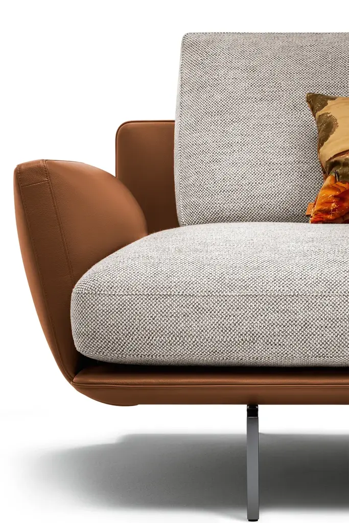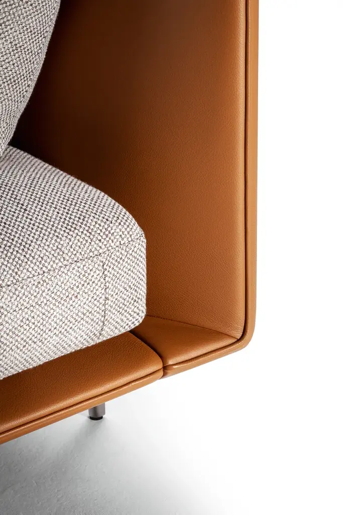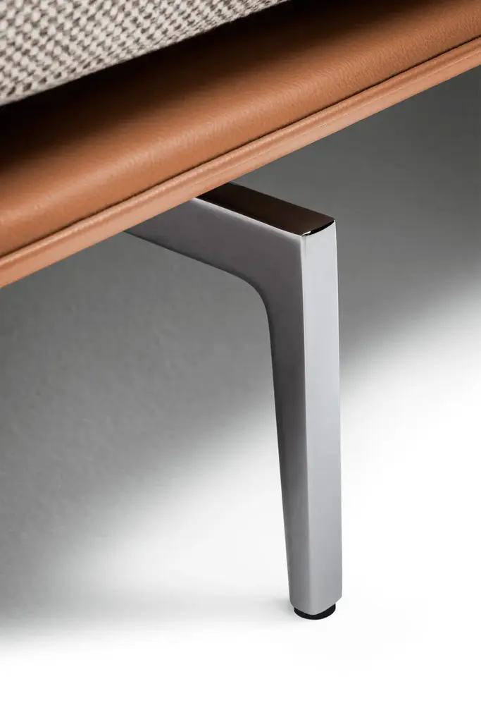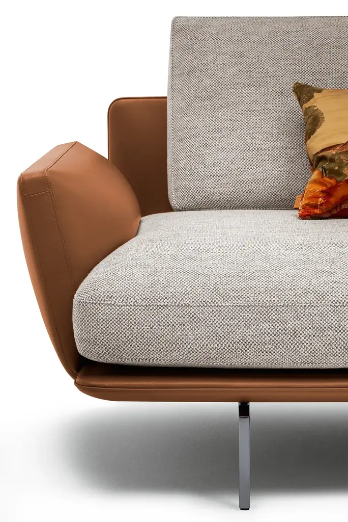 After Let it Be and Come Together, designed for Poltrona Frau in 2017 and 2018 respectively, Ludovica and Roberto Palomba have designed Get Back, a seating system that once again pays homage to the Beatles. Get Back is inspired by the refrain, “Get back, get back, get back to where you once belonged”. A playfully schematic text for a project that represents a return to comfort, to a welcoming tailor-made space where you can really feel at home. The Get Back sofa is the product of in-depth research into comfort. Generous, spacious and open lines, reclined backrests that encourage relaxation, numerous modular elements to combine freely in lots of different compositions. A very light overall effect created by the suspended frame, supported by simple aluminium feet. On top, soft cushions and chaise elements with unexpected depth. An alluring invitation to “Get back home” and enjoy the relaxing and convivial atmosphere of your living room. The apparent informality of Get Back conceals its close attention to detail. The seat and backrest merge together in a single, extremely light element decorated with thin piping that makes it look as if it has been designed in pencil. The rounded corners make the surfaces even more inviting and a leather armrest enriched with precious stitching embraces the seat from the side, underlining the softness of its forms. The seat and backrest cushions, padded with soft down, create an interesting contrast with the sculpted surfaces of the frame and underline Poltrona Frau’s leather processing prowess. The backrest structure is made of solid beech and poplar, birch plywood and infill produced from hardboard panels. The frame of the basic structure is made of die-cast aluminium and solid tulip wood for the covered parts. Elements in moulded polyurethane foam are inserted in the ends of the backrests and the corners of the frame. The base and backrest are padded with polyurethane foam while the armrests are padded with polyurethane and polyester padding. The seat spring system consists of interwoven elastic belts. Seat cushion with down padding and stabilising insert in polyurethane foam. Backrest cushion with down padding in separate chambers. Cast aluminium feet with Ruthenium finish and black nylon caps. Get Back can be upholstered completely in Pelle Frau® leather or in a combination of Pelle Frau® leather with fabric seat and backrest cushions.