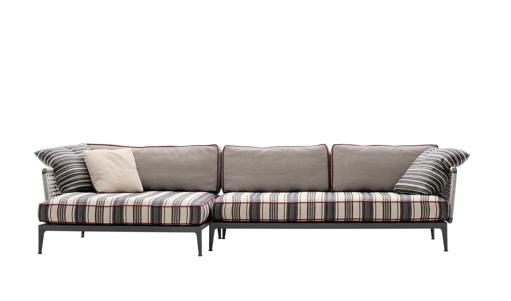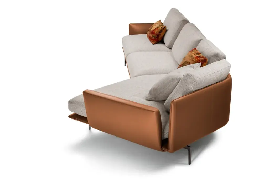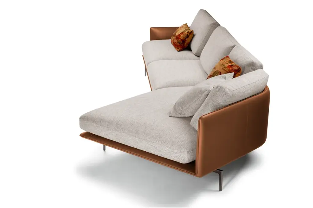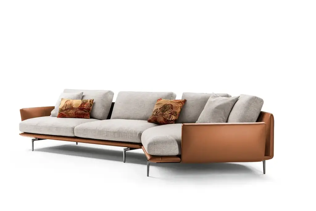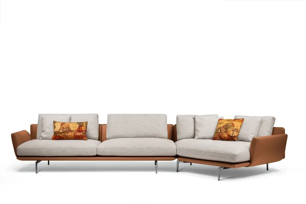 After Let it Be and Come Together, designed for Poltrona Frau in 2017 and 2018 respectively, Ludovica and Roberto Palomba have designed Get Back, a seating system that once again pays homage to the Beatles. Get Back is inspired by the refrain, “Get back, get back, get back to where you once belonged”. A playfully schematic text for a project that represents a return to comfort, to a welcoming tailor-made space where you can really feel at home. The Get Back sofa is the product of in-depth research into comfort. Generous, spacious and open lines, reclined backrests that encourage relaxation, numerous modular elements to combine freely in lots of different compositions. A very light overall effect created by the suspended frame, supported by simple aluminium feet. On top, soft cushions and chaise elements with unexpected depth. An alluring invitation to “Get back home” and enjoy the relaxing and convivial atmosphere of your living room. The apparent informality of Get Back conceals its close attention to detail. The seat and backrest merge together in a single, extremely light element decorated with thin piping that makes it look as if it has been designed in pencil. The rounded corners make the surfaces even more inviting and a leather armrest enriched with precious stitching embraces the seat from the side, underlining the softness of its forms. The seat and backrest cushions, padded with soft down, create an interesting contrast with the sculpted surfaces of the frame and underline Poltrona Frau’s leather processing prowess. The backrest structure is made of solid beech and poplar, birch plywood and infill produced from hardboard panels. The frame of the basic structure is made of die-cast aluminium and solid tulip wood for the covered parts. Elements in moulded polyurethane foam are inserted in the ends of the backrests and the corners of the frame. The base and backrest are padded with polyurethane foam while the armrests are padded with polyurethane and polyester padding. The seat spring system consists of interwoven elastic belts. Seat cushion with down padding and stabilising insert in polyurethane foam. Backrest cushion with down padding in separate chambers. Cast aluminium feet with Ruthenium finish and black nylon caps. Get Back can be upholstered completely in Pelle Frau® leather or in a combination of Pelle Frau® leather with fabric seat and backrest cushions.