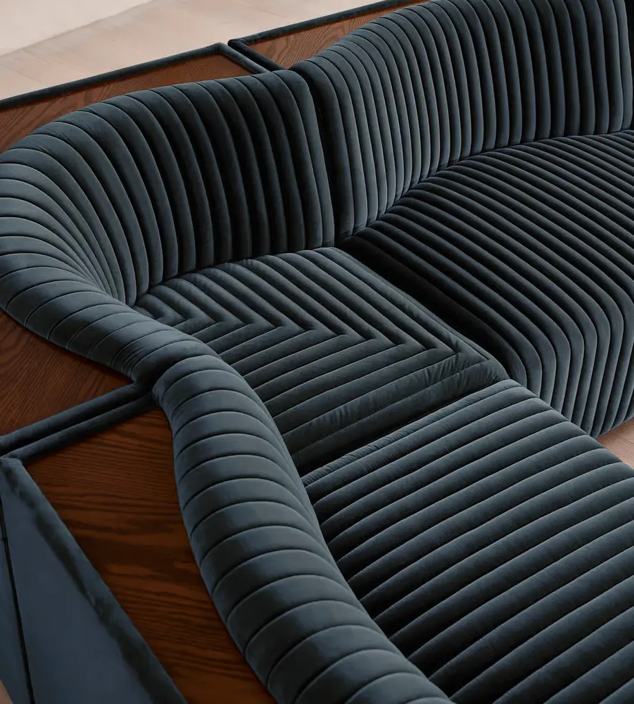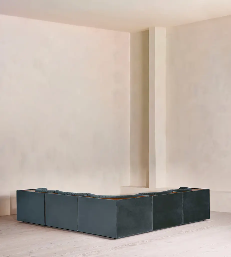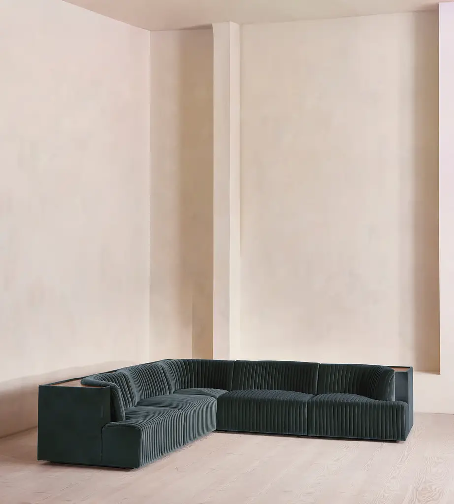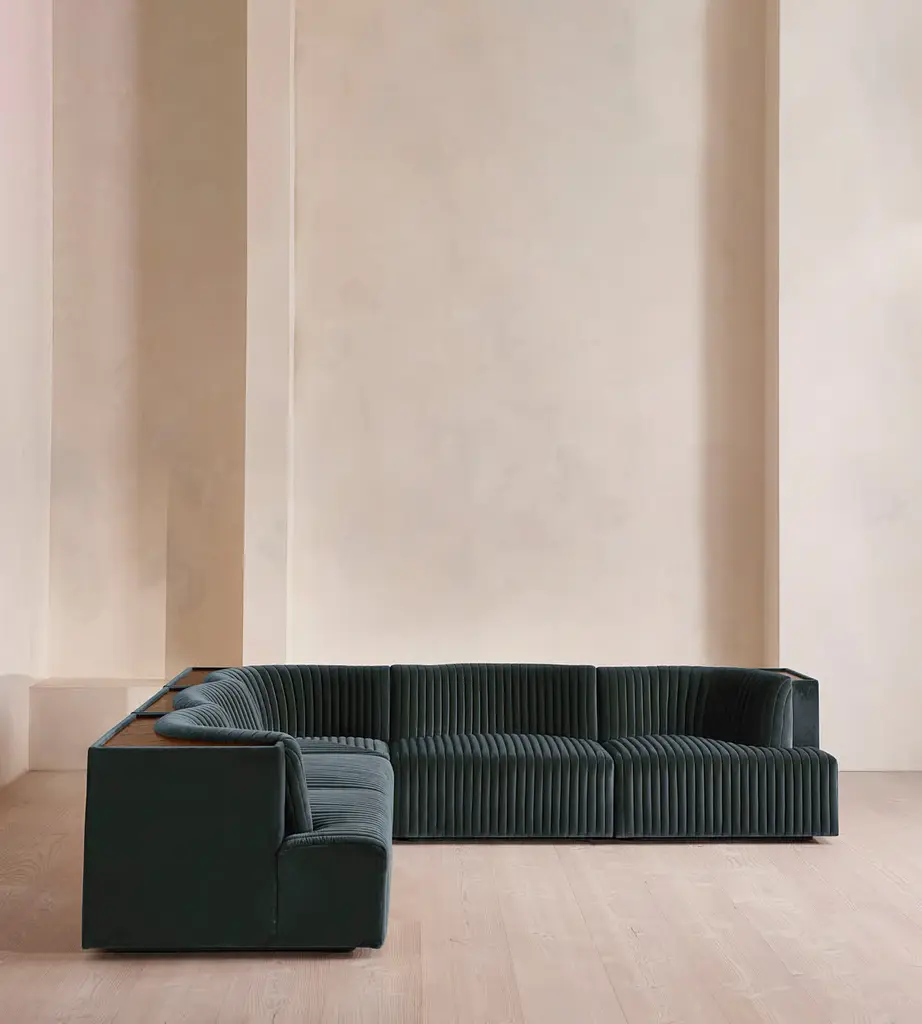 Channeled velvet upholstery in bespoke shades is mixed with a multi-functional oak inlay shelf made to perch drinks, lamps and other decor on. Filled with curved silhouettes and tactile materials, the interiors of 180 House inspired the design of our Hamish sofa. Made to order in your choice of bespoke color, its silhouette is defined by channeled velvet upholstery and a wavy backrest, finished with a shelf to perch lamps or drinks on. Choose between three and four-seater or corner configurations to create a layout that's specially built for your space.