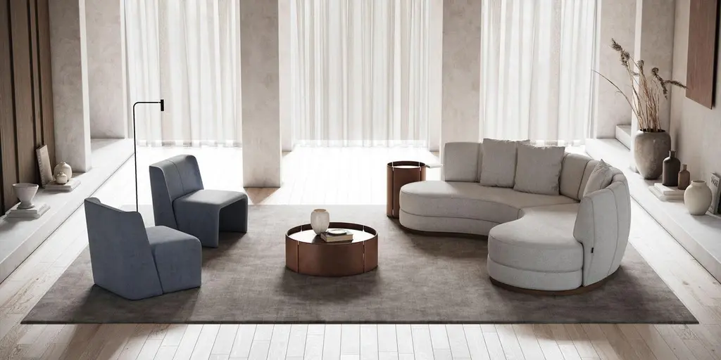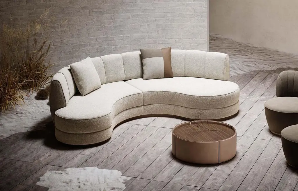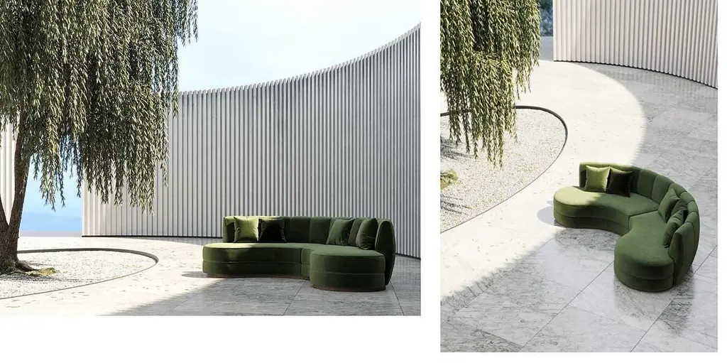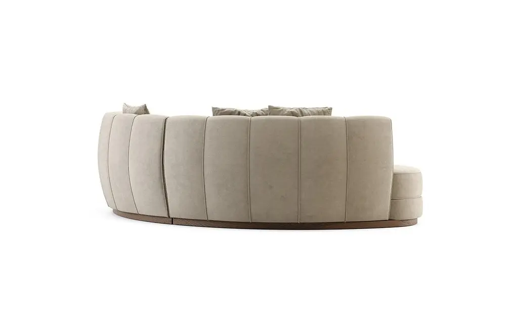 Mid-Century Modern inspired sectional sofa featuring curved design with luxurious light grey velvet fabric. Supported by walnut stained wood base.The velvet suggested on this sofa is stain resistant and water repellent. This sofa is suitable for residential and hospitality use.Standard dimensions:293 cm x 157 cm x 84 cmWood finish: Dark stained Walnut Finish.3 cushions are included with the sofa.Other options: COM/COLother velvet colorsother wood finishes for the baseContact us to enquire about COM/COL production, requirements and material shipping instructions.Please contact us if you have any questions about customization and pricing. We will be glad to check with the factory’s technical team if sizes, finishes, and colors can be customized. We do our best to expedite production and to ship and deliver product within the listed lead time, however current lead times might be longer due to global shipping backlog and delays. These delays are out of our control and cannot be a reason to cancel an order.Our pricing includes all costs for international shipping to the U.S., as well as duties and customs clearance fees. Please be aware that local delivery within the U.S. is not included. We offer white glove, front door, and warehouse delivery options. For shipments outside the U.S., kindly reach out to us for a detailed quote.