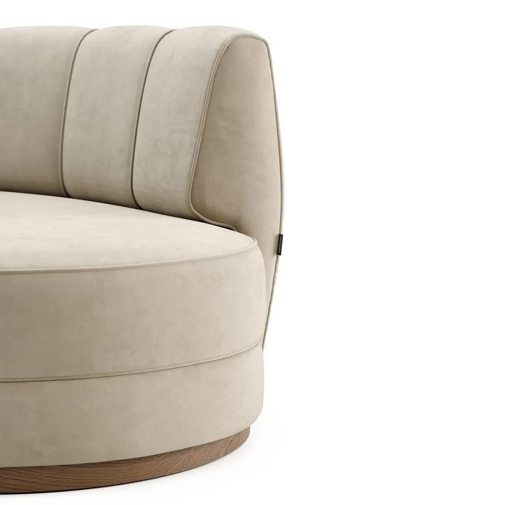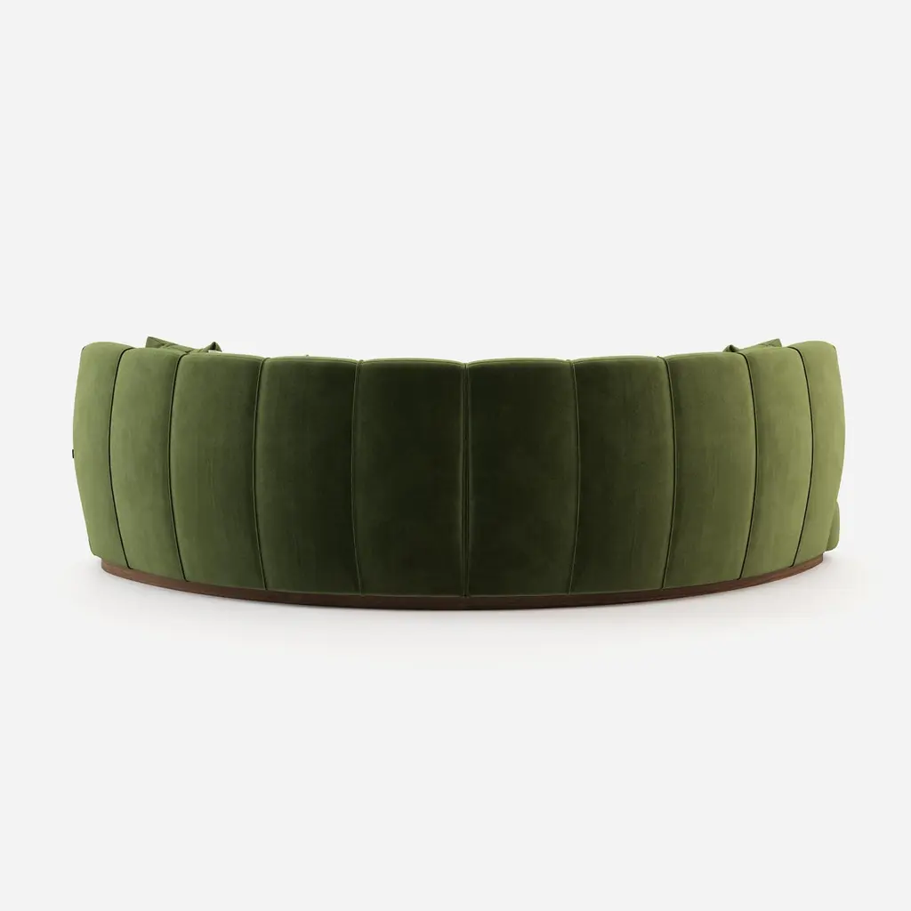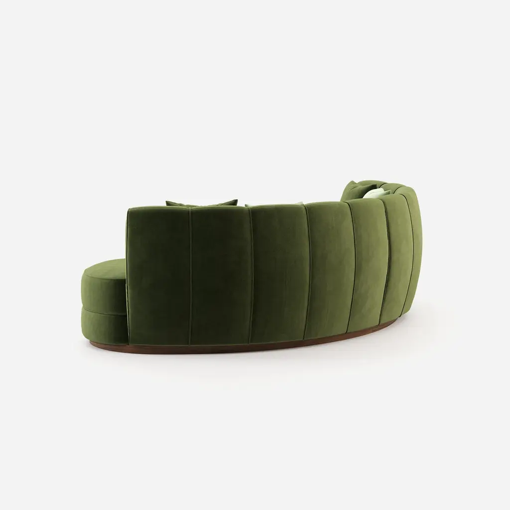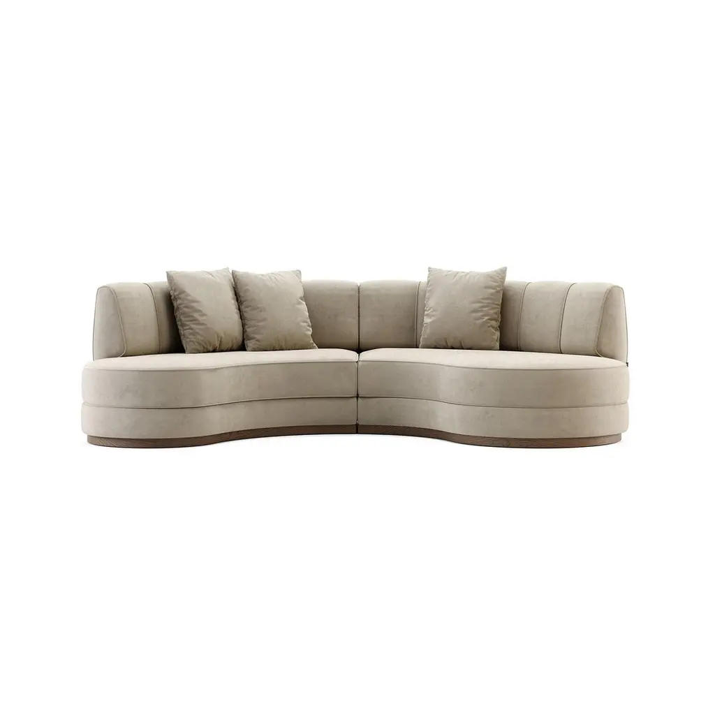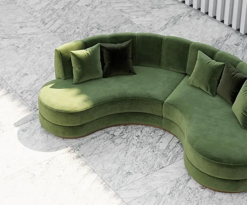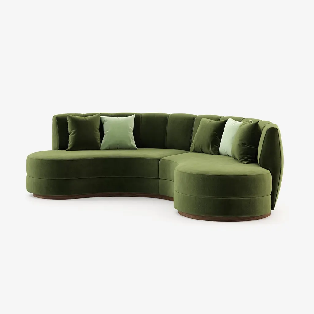 Mid-Century Modern inspired sectional sofa featuring curved design with luxurious mustard yellow velvet fabric. Supported by walnut base.Standard dimensions:293 cm x 157 cm x 84 cmFinishes:Fabrics: cotton velvet reference, mustard yellowFinishes: walnut wood matte base3 cushions includedCOM and COL are also available.Contact us to enquire about COM/COL production, requirements and material shipping instructions.Please contact us if you have any questions about customization and pricing. We will be glad to check with the factory’s technical team if sizes, finishes, and colors can be customized. We do our best to expedite production and to ship and deliver product within the listed lead time, however current lead times might be longer due to global shipping backlog and delays. These delays are out of our control and cannot be a reason to cancel an order.Our pricing includes all costs for international shipping to the U.S., as well as duties and customs clearance fees. Please be aware that local delivery within the U.S. is not included. We offer white glove, front door, and warehouse delivery options. For shipments outside the U.S., kindly reach out to us for a detailed quote.