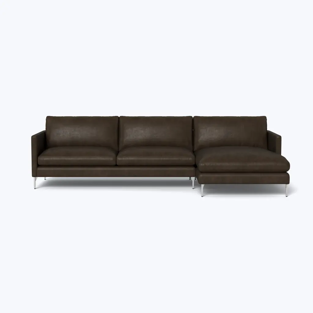 The Hannah Leather Sectional, exclusively from ABC Carpet & Home, combines the timeless appeal of leather with modern design, creating a luxurious centerpiece for any living space. The rich leather upholstery not only offers a sophisticated look but also develops a beautiful patina over time, giving the piece character as it ages. Natural markings, textures, and a soft sheen enhance the leather's unique charm, making the Hannah Sectional a stylish and durable choice for your home. Available in left arm facing or right arm facing configurations, this 124-inch sectional offers ample room for solo lounging or socializing with friends, making it a versatile addition to any space. The beauty of leather lies in its ability to age gracefully, gaining a rich patina as it’s used over time. As the leather softens, it showcases natural variations and markings, creating a distinctive and well-loved appearance that only enhances its elegance. This sectional’s premium leather upholstery not only looks stunning but also provides long-lasting durability, ensuring that the Hannah Leather Sectional remains a treasured part of your home for years to come. Crafted with a sustainably sourced Goodwood frame, the Hannah Leather Sectional exemplifies eco-conscious craftsmanship, ensuring it’s built to last. The modern design is enhanced by its streamlined, airy silhouette and slim track arms, lending a refined and contemporary touch to your living room or den. You can further personalize the look by choosing between polished brass or steel legs, which add a sleek and modern element to the sectional. With seven premium leather finishes available, you can tailor this piece to match your aesthetic while enjoying the luxurious look and feel of fine leather. Beyond its striking design, the Hannah Leather Sectional is crafted for comfort. Its deep, plush seating invites relaxation, making it the perfect spot for lounging or hosting guests. Whether you’re watching a movie, enjoying a nap, or having a gathering with friends, this sectional offers both luxury and practicality. Handcrafted to order and delivered to your home within 8-10 weeks, every detail of the Hannah Leather Sectional is meticulously crafted to ensure the highest level of quality and comfort. For a cohesive look, pair the Hannah Leather Sectional with other pieces from the Hannah Collection, including the ottoman or lounge chair, to create a beautifully curated living space. The Hannah Leather Sectional offers the perfect combination of modern design, timeless leather appeal, and unmatched comfort, making it an essential piece for any contemporary home.