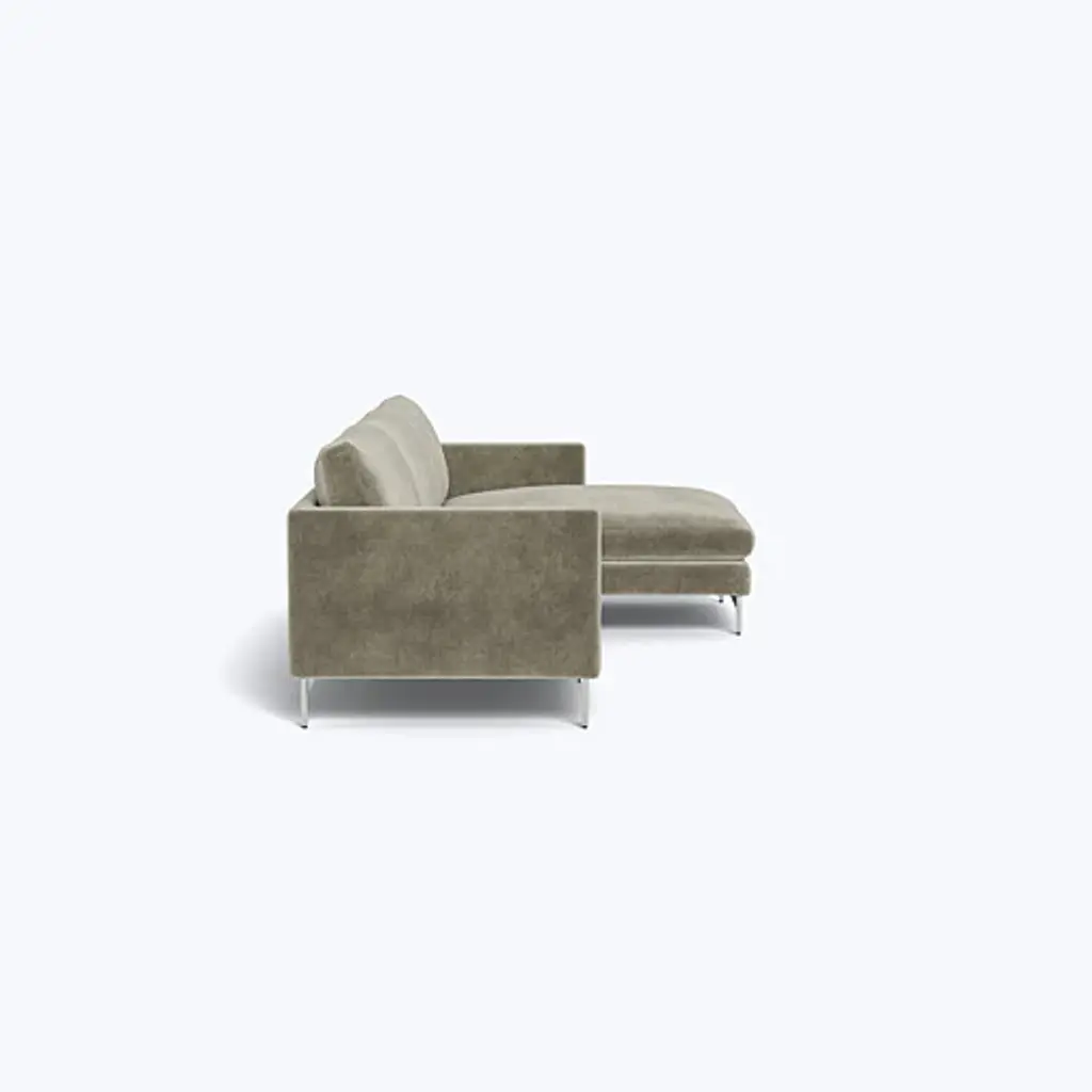 The Hannah Sectional, exclusively from ABC Carpet & Home, combines modern elegance with ultimate comfort, making it the perfect centerpiece for any living space. Available as either a left arm facing or right arm facing configuration, this sectional is designed to fit seamlessly into your home, offering both style and versatility. The expansive 124-inch Sectional offers the perfect spot to stretch out solo for a nap or gather with friends for laid-back lounging.Crafted with a sustainably sourced Goodwood frame, the Hannah Sectional exemplifies eco-conscious craftsmanship and long-lasting quality. Its slim track arms and sleek silhouette add a refined, contemporary touch to your living room or den. Choose between polished brass or steel legs to enhance the sectional’s modern appeal, and select from over 80 customizable fabric options—including plush velvets, soft linens, performance blends, and premium leather—to create a piece that suits your personal style.Whether you’re creating a cozy space to relax or need a stylish sectional for entertaining, the Hannah Sectional is handcrafted to order and delivered within 8-10 weeks, ensuring luxury and comfort in every detail. Pair it with other pieces from the Hannah Collection, such as the ottoman or lounge chair, to create a look that works perfectly with your lifestyle.