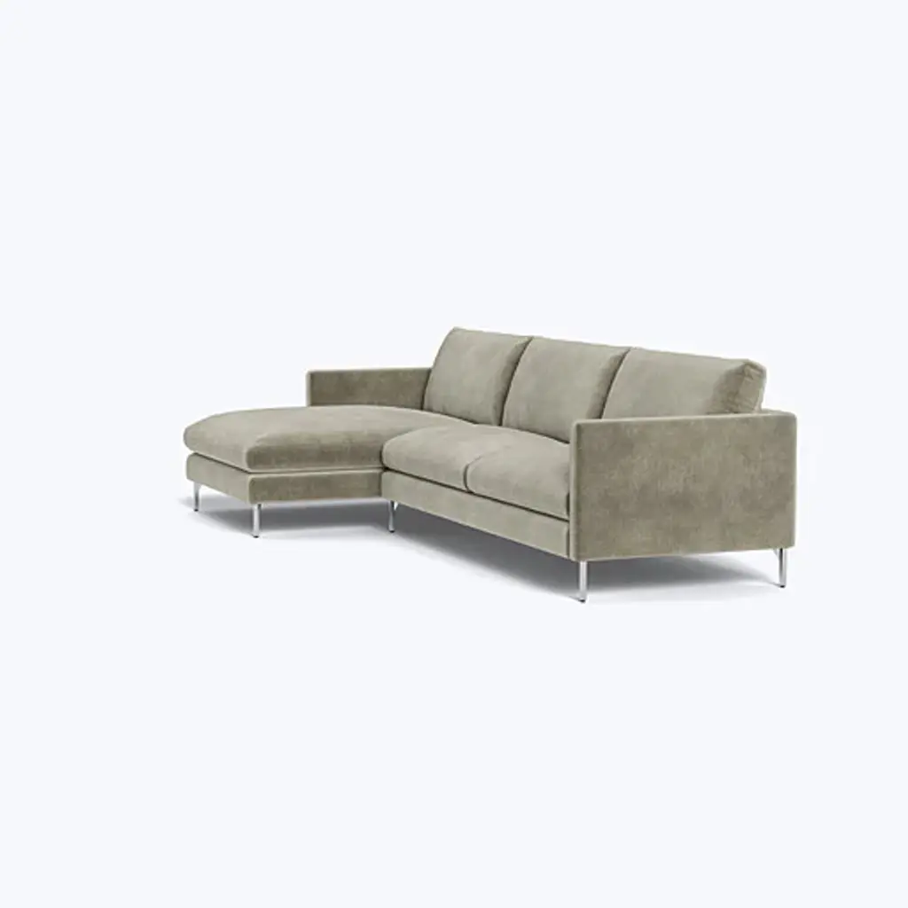 The Hannah Sectional, exclusively from ABC Carpet & Home, combines modern elegance with ultimate comfort, making it the perfect centerpiece for any living space. Available as either a left arm facing or right arm facing configuration, this sectional is designed to fit seamlessly into your home, offering both style and versatility. The expansive 124-inch Sectional offers the perfect spot to stretch out solo for a nap or gather with friends for laid-back lounging.Crafted with a sustainably sourced Goodwood frame, the Hannah Sectional exemplifies eco-conscious craftsmanship and long-lasting quality. Its slim track arms and sleek silhouette add a refined, contemporary touch to your living room or den. Choose between polished brass or steel legs to enhance the sectional’s modern appeal, and select from over 80 customizable fabric options—including plush velvets, soft linens, performance blends, and premium leather—to create a piece that suits your personal style.Whether you’re creating a cozy space to relax or need a stylish sectional for entertaining, the Hannah Sectional is handcrafted to order and delivered within 8-10 weeks, ensuring luxury and comfort in every detail. Pair it with other pieces from the Hannah Collection, such as the ottoman or lounge chair, to create a look that works perfectly with your lifestyle.