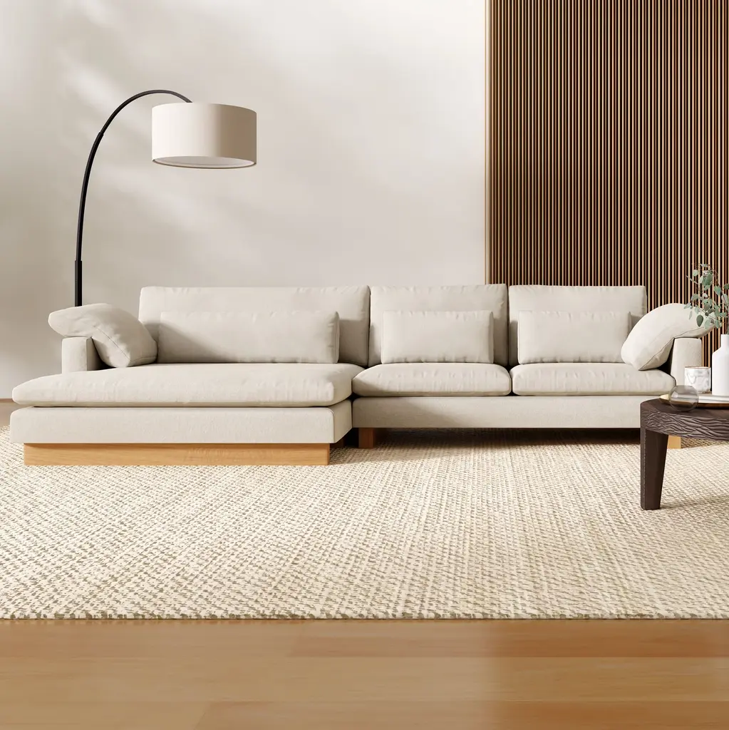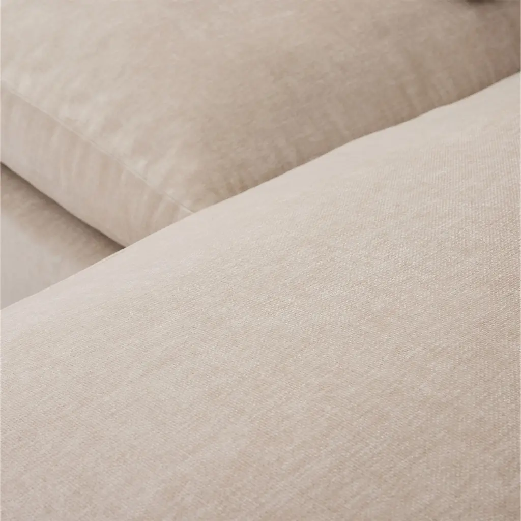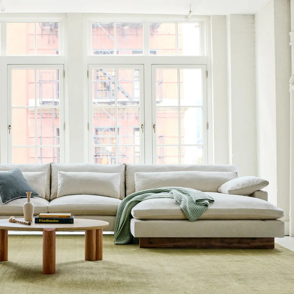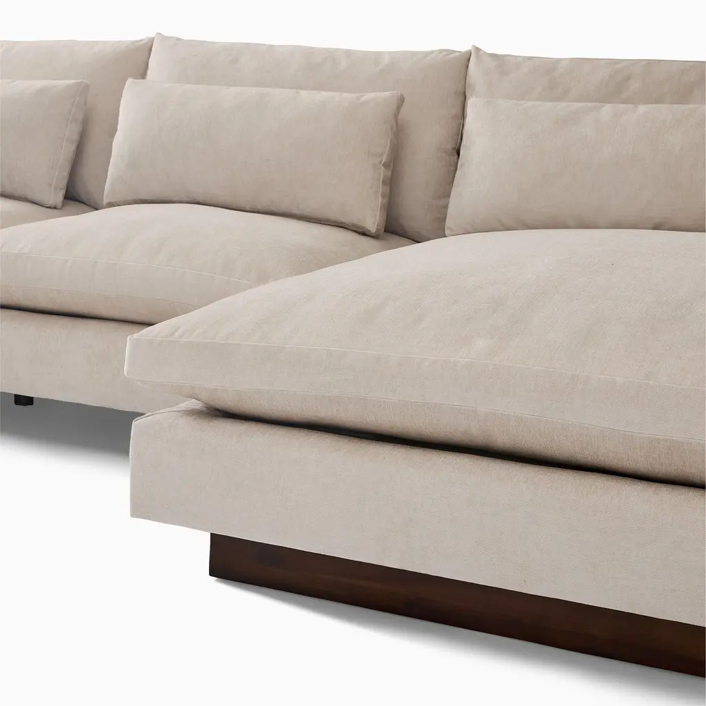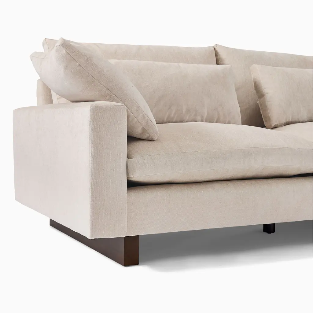 This modern sectional is all about comfort. Pillowy-soft cushions top the spacious body. Kiln-dried, clean-lined frame has reinforced joinery. Hand-built frames with hand-finished upholstery.