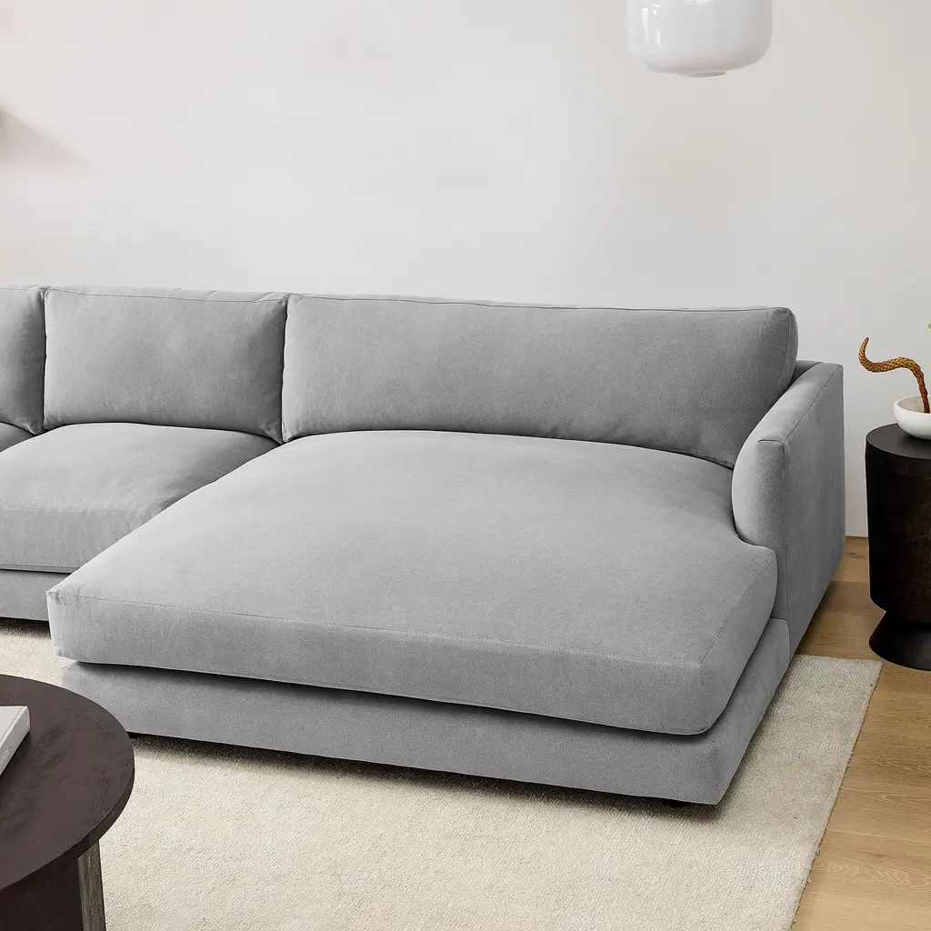 It's casual, low-slung & loungy. Everyone will fight over the extra-wide chaise. The sink-right-in seat & padded arms. Hand-built frames with hand-finished upholstery.