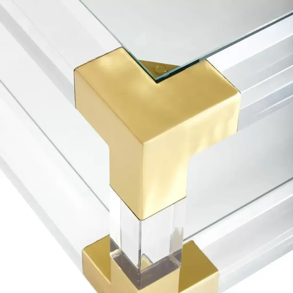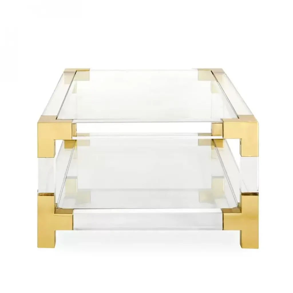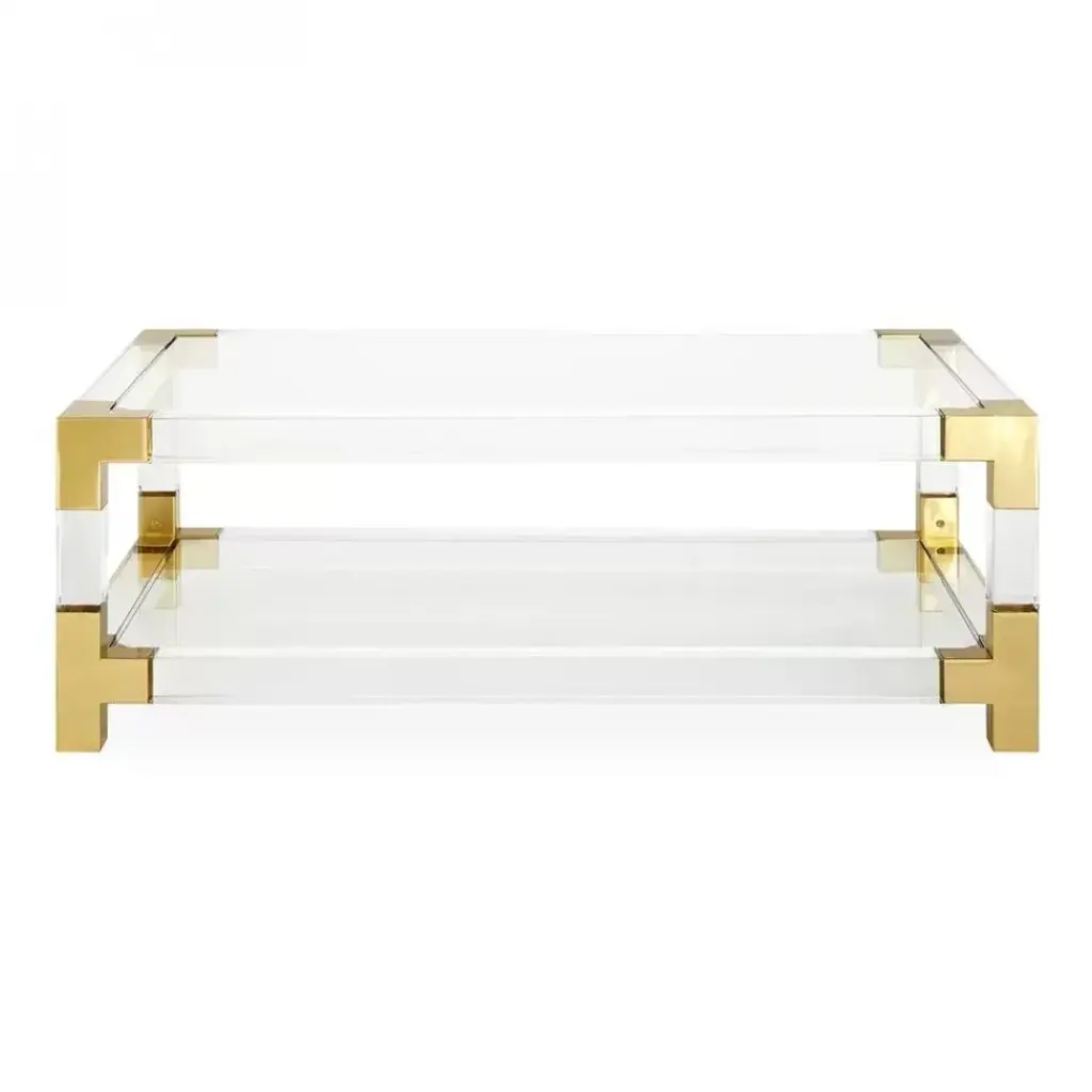 The perfect blend of simplicity and glamour, modern and traditional. In luxe clear acrylic with brushed brass accents, our Jacques Grand Cocktail Table is low and loungey. The perfect size to pair with a sectional or grand sofa. Its second shelf creates plenty of space for storing and styling your favorite books and baubles. Big presence, weightlessly transparent.