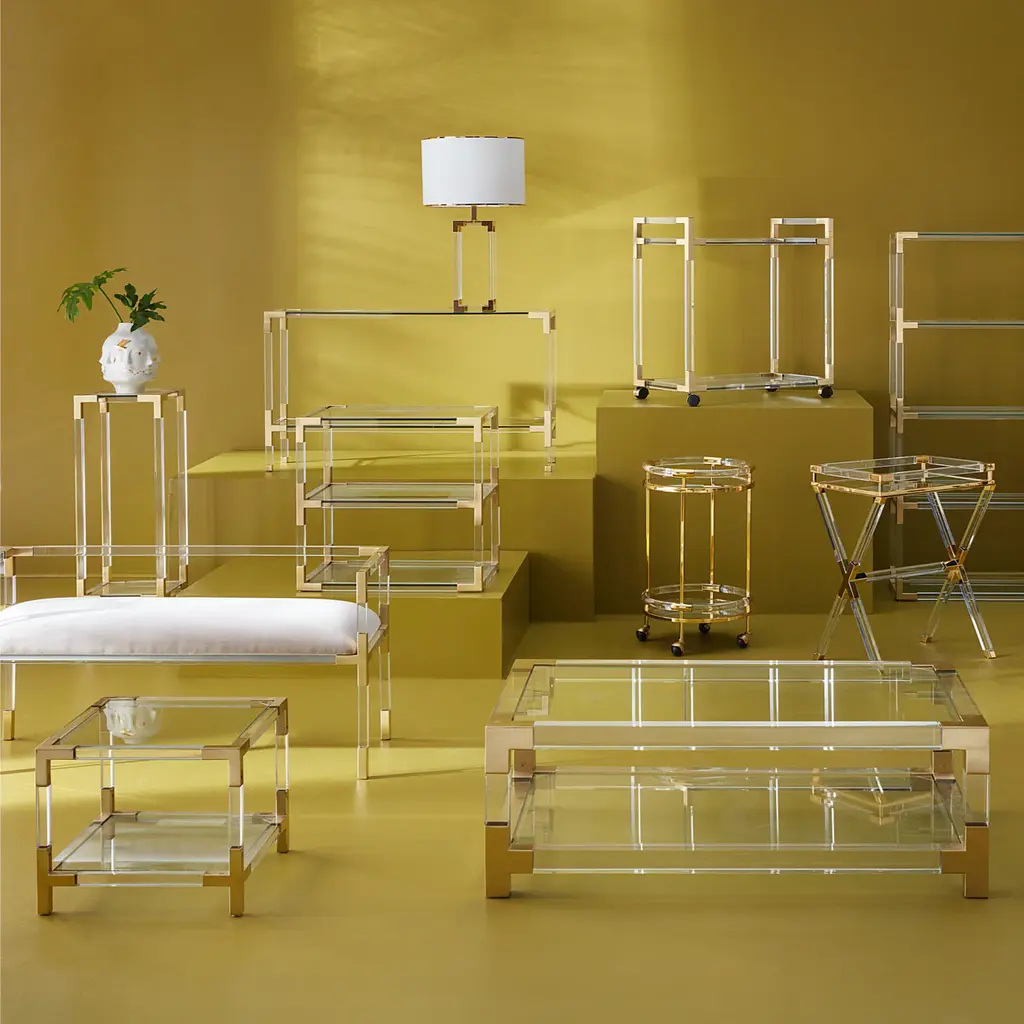 Clearly Cool. In luxe clear acrylic with brushed brass accents, our Jacques Grand Cocktail Table is low and loungey. The perfect size to pair with a sectional or grand sofa. Its second shelf creates plenty of space for storing and styling your favorite books and baubles. The perfect blend of simplicity and glamour, modern and traditional. Big presence, weightlessly transparent.