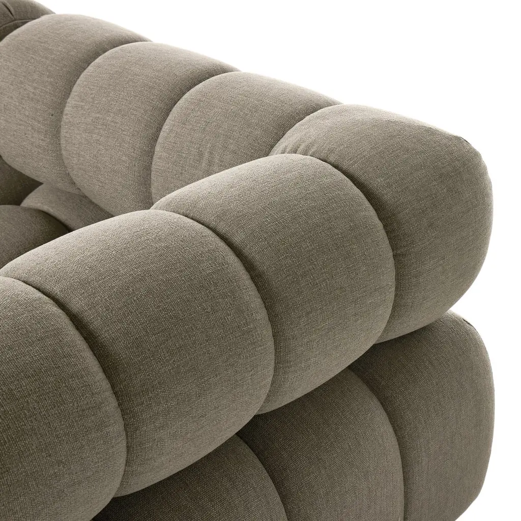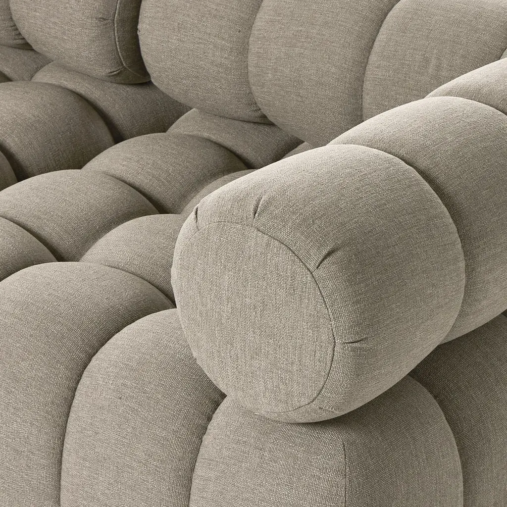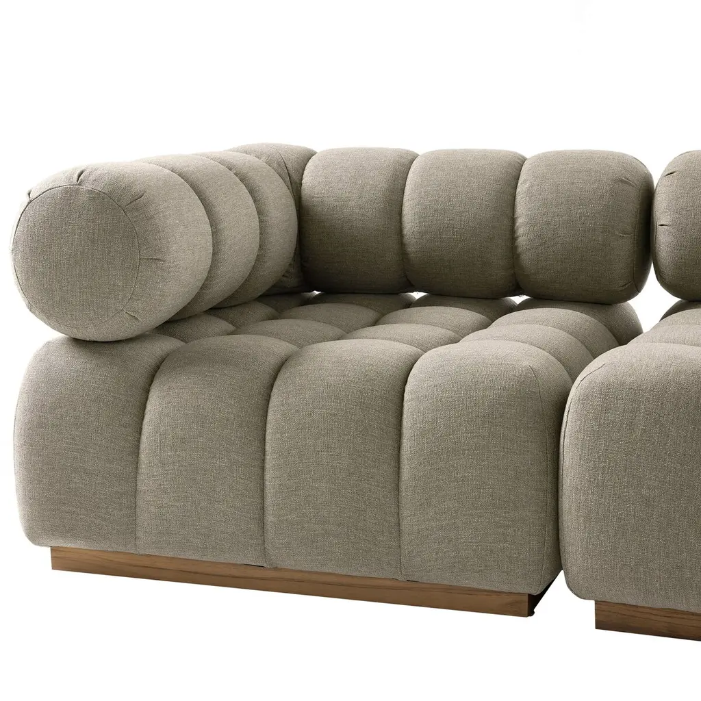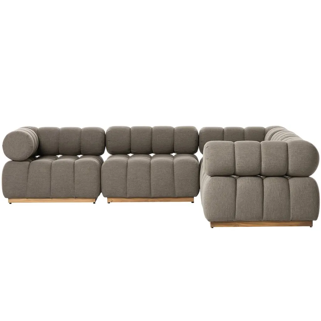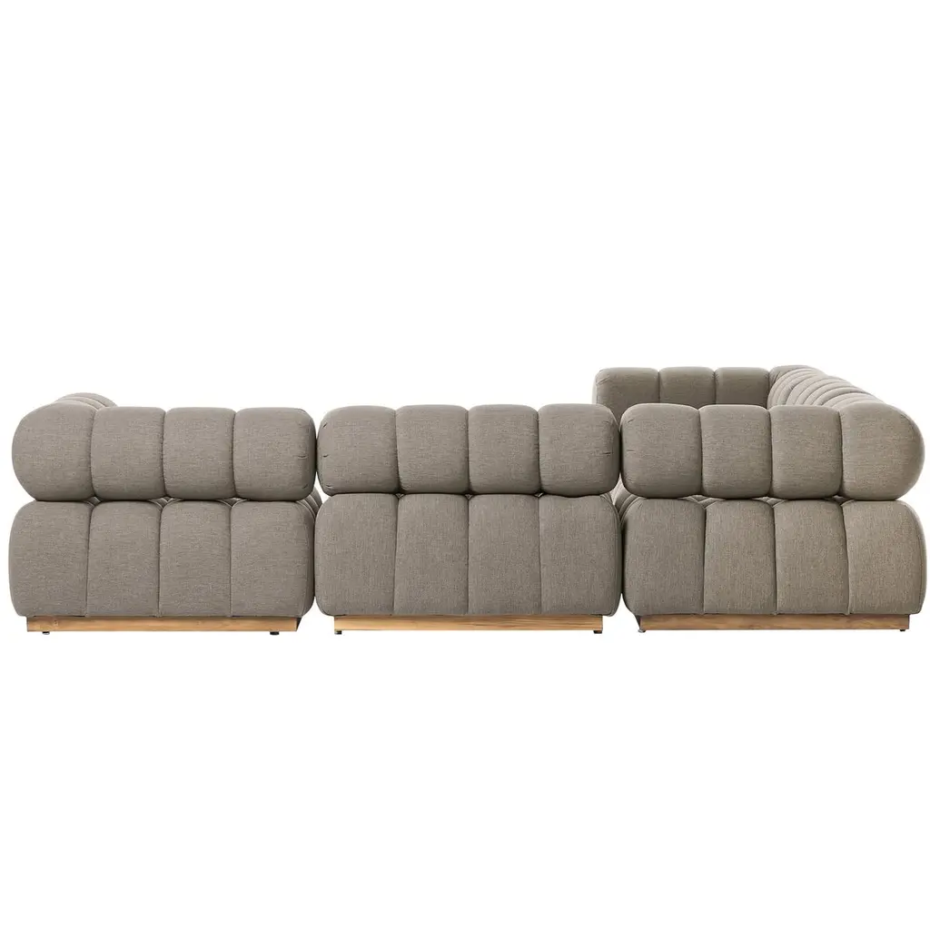 A modern take on mid-century Italian design, soft volume and exaggerated proportions fuse for a sculpted look and playful feel. Atop a plinth-style teak base, outdoor-friendly five-piece sectional features dramatic tufting for a padded sit, indoors and out. Sustainably made with zero waste, luxurious Italian upholstery places a new and unique spin on indoor/outdoor seating, offering soft, durable fabric that's highly resistant to sun, stains, mold and abrasion. Cover or store indoors during inclement weather and when not in use.