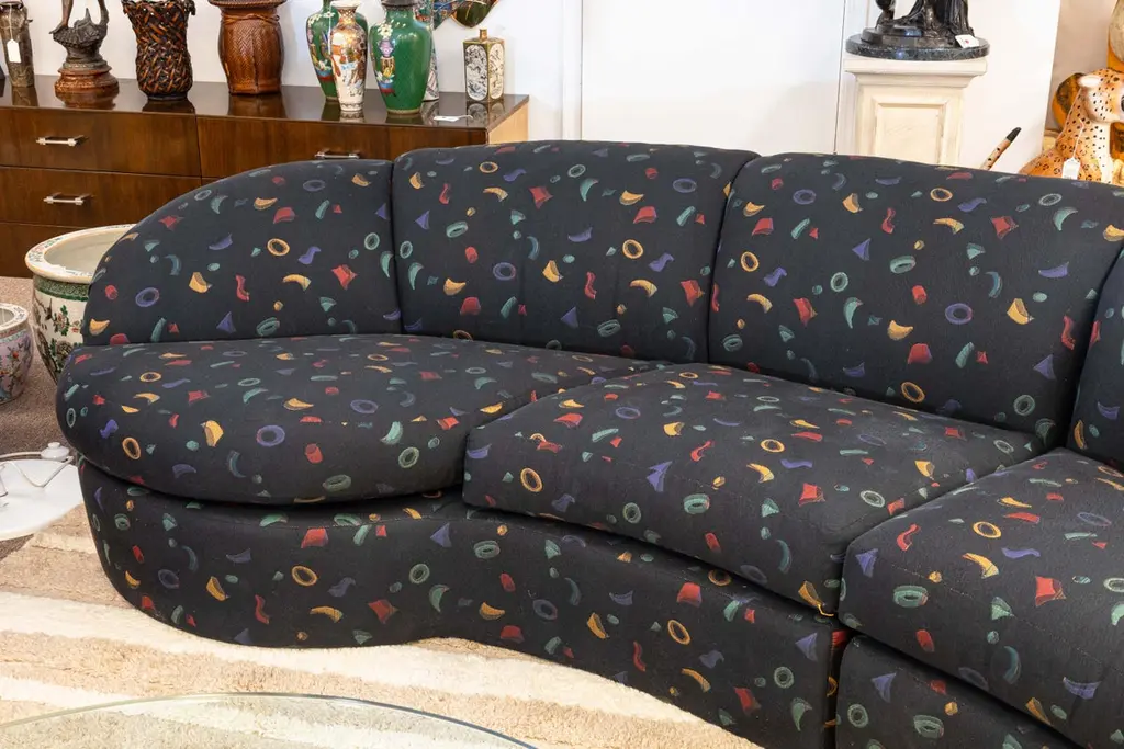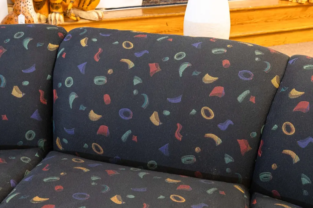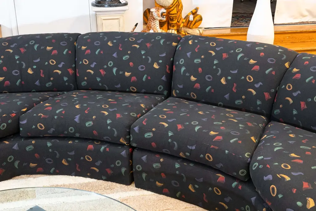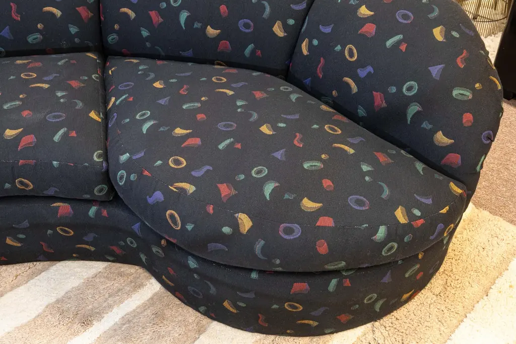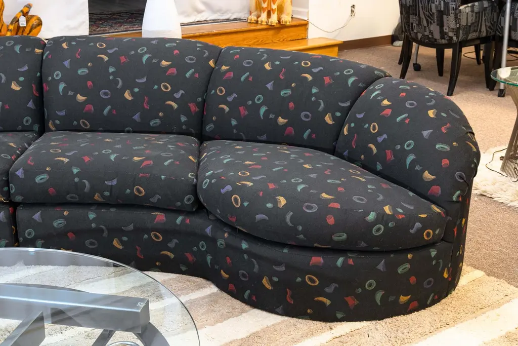 A John Mascheroni for Swaim 1980s two piece sofa. This stunning two piece sofa is designed by John Mascheroni, a prominent furniture designer throughout the 1980s and 90s. This piece was produced by Swaim Furniture Company in the late 1980s in partnership with Mascheroni. This piece features a very clean, modern design, with a curving two piece design. It features sloping arms on either side, tufted back cushions, and removable seat cushions with clips and zip on fabric upholstery. The fabric on this sofa is the star of the show, with a black base color, and multicolored abstract print designs across. A very awesome 1980s design that can blend with a variety of spaces and styles. This sofa is in very good condition. The Swaim logo can be seen stitched throughout the sofa underneath the cushions as pictured above. This piece measures 28.5 inches tall, approximately 125 inches long, and 45 inches deep. It has a seat height of 16 inches, a seat depth of 21 inches, and a back height of 13 inches.