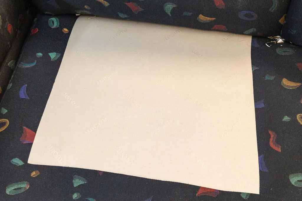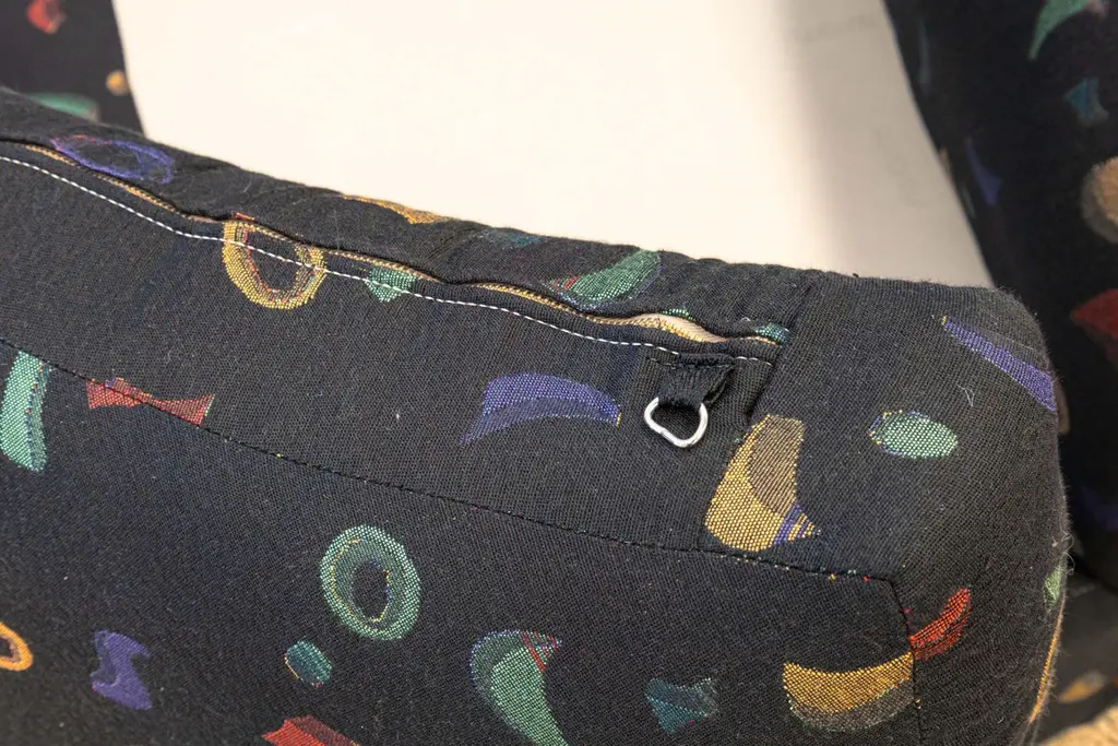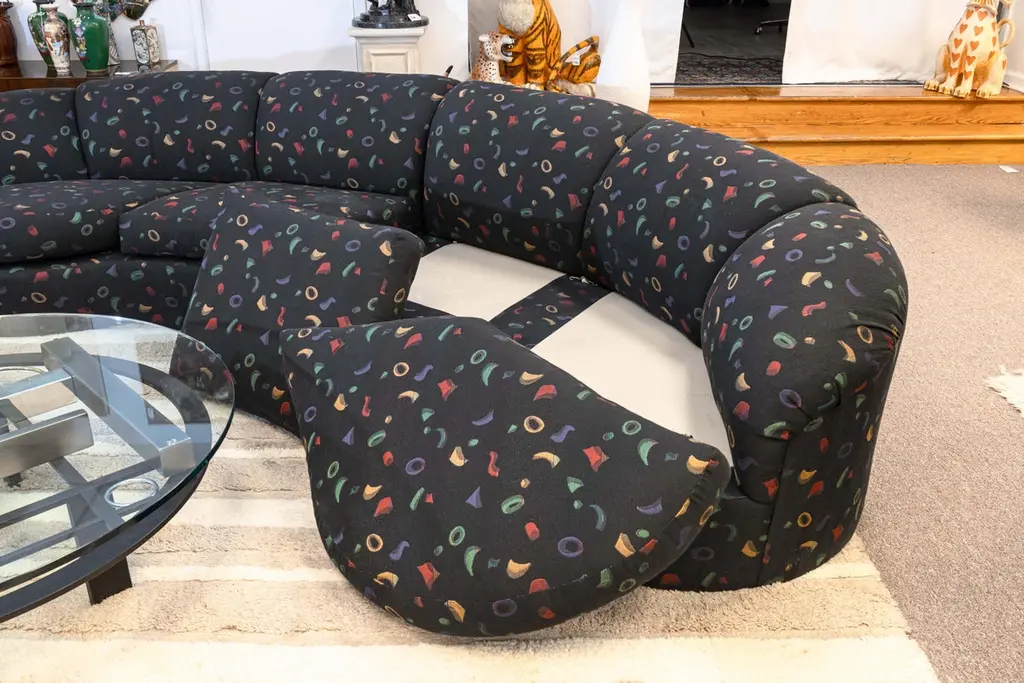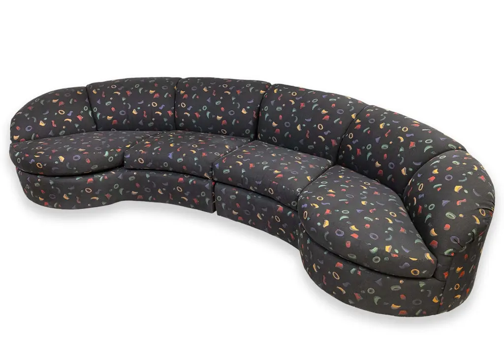 A John Mascheroni for Swaim 1980s two piece sofa. This stunning two piece sofa is designed by John Mascheroni, a prominent furniture designer throughout the 1980s and 90s. This piece was produced by Swaim Furniture Company in the late 1980s in partnership with Mascheroni. This piece features a very clean, modern design, with a curving two piece design. It features sloping arms on either side, tufted back cushions, and removable seat cushions with clips and zip on fabric upholstery. The fabric on this sofa is the star of the show, with a black base color, and multicolored abstract print designs across. A very awesome 1980s design that can blend with a variety of spaces and styles. This sofa is in very good condition. The Swaim logo can be seen stitched throughout the sofa underneath the cushions as pictured above. This piece measures 28.5 inches tall, approximately 125 inches long, and 45 inches deep. It has a seat height of 16 inches, a seat depth of 21 inches, and a back height of 13 inches.