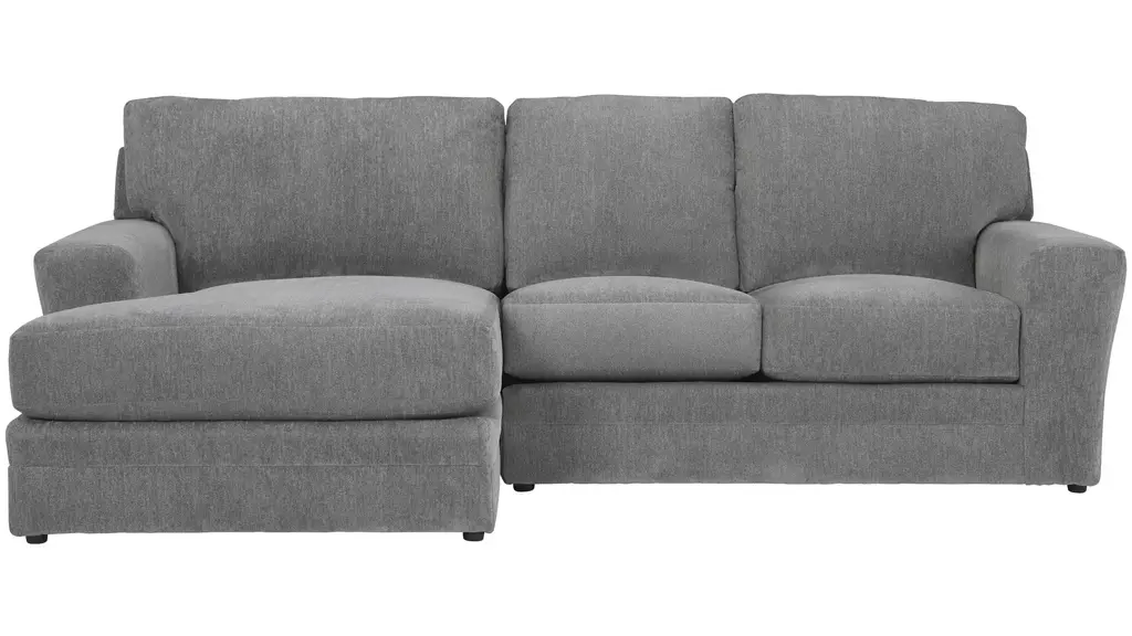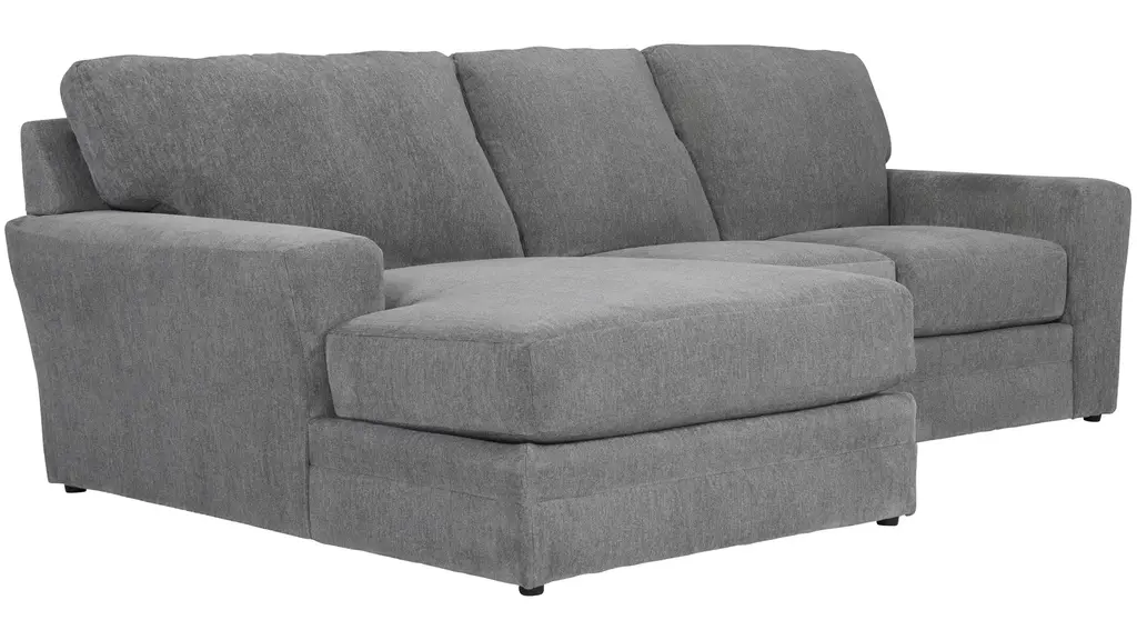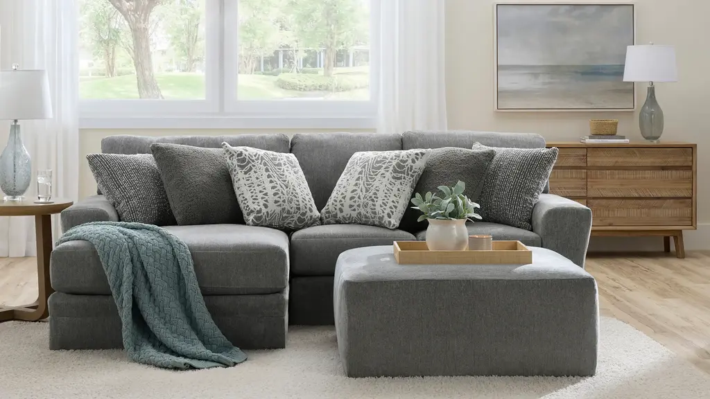 Gather, relax, and sink into comfort with the ultra-plush Kristoff 4-pc. sectional. Upholstered in a soft slate-gray fabric, it's designed for modern lounging with deep seats, supportive cushions, and a wraparound silhouette that invites everyone in. A mix of textured and patterned throw pillows in shades of light gray and ice blue adds visual interest and cozy layers. Whether you're hosting movie night or stretching out solo, this sectional turns your living space into a premium comfort zone. Includes left arm facing chaise and right arm facing loveseat.