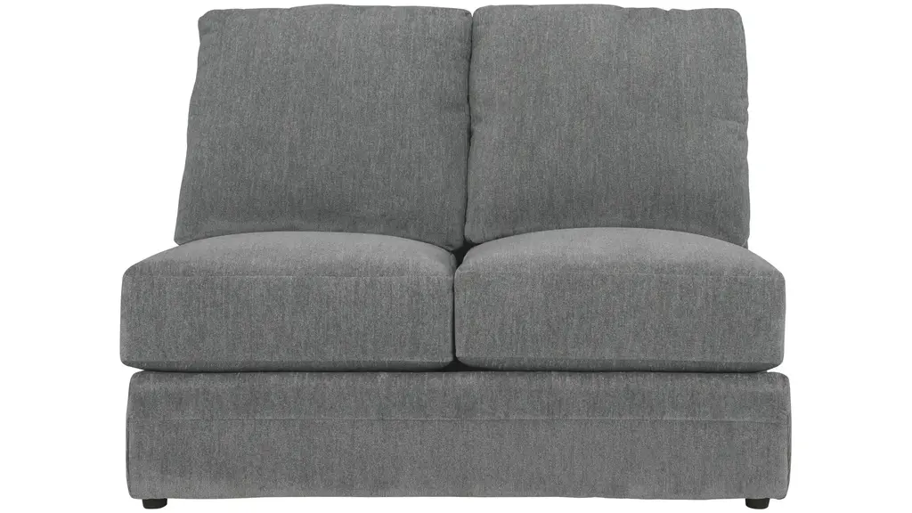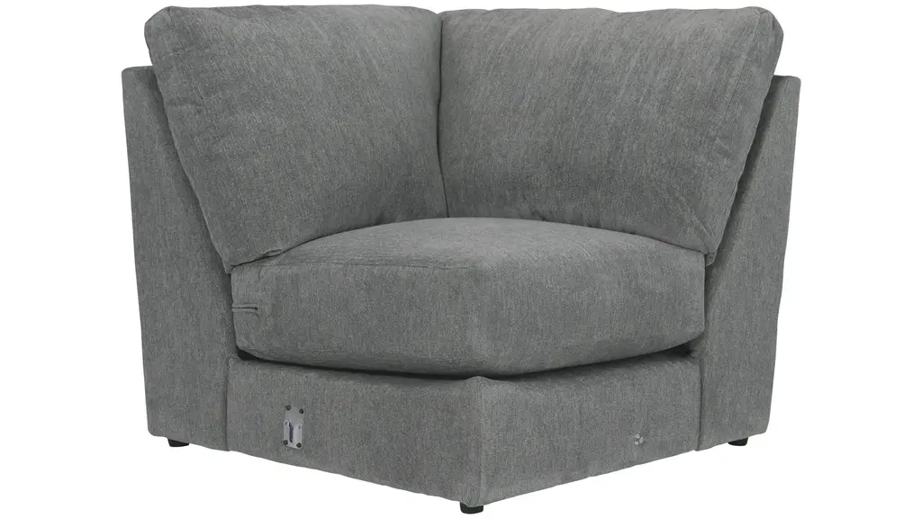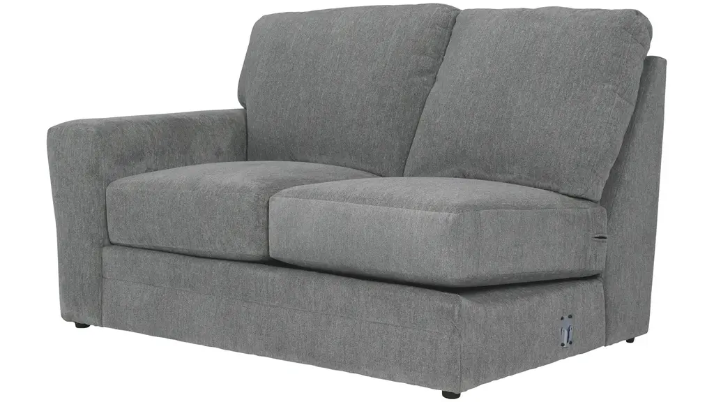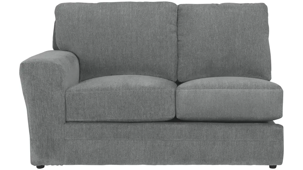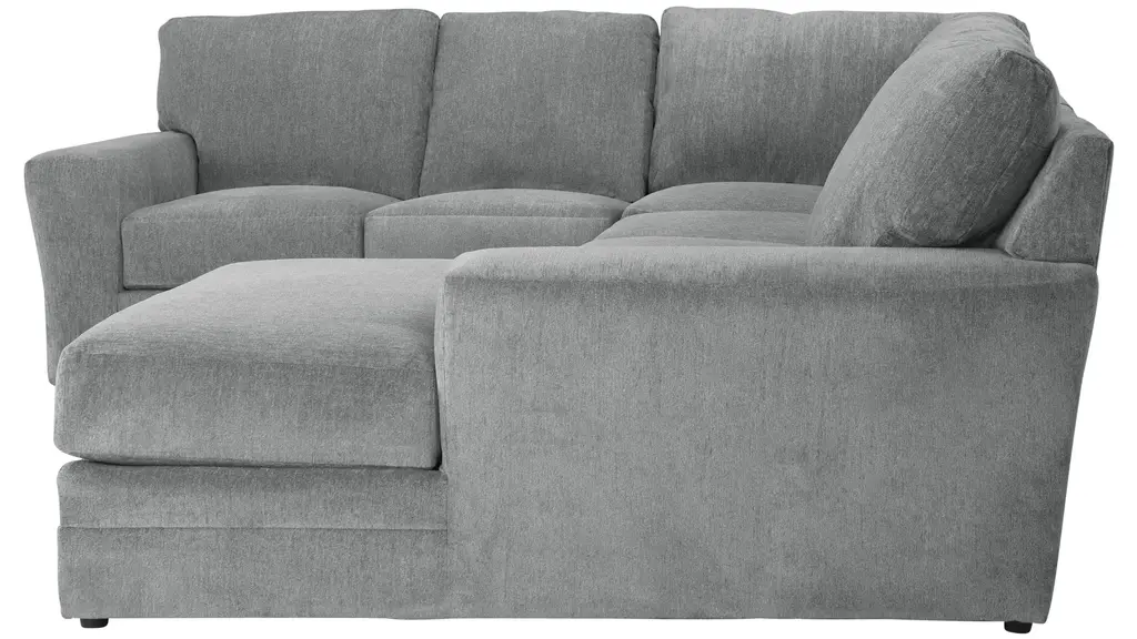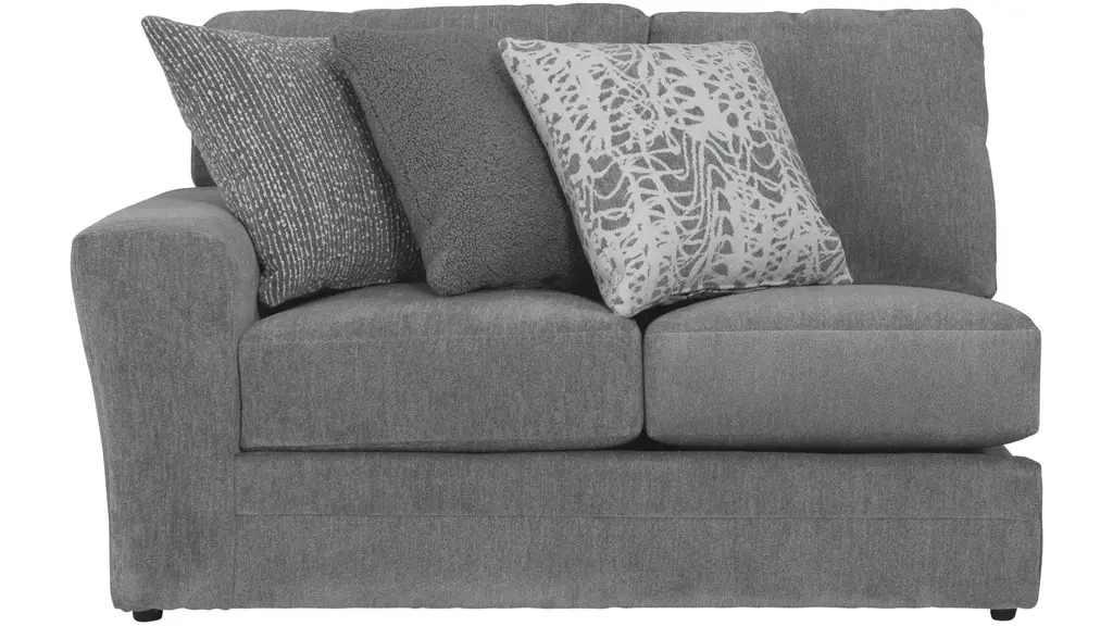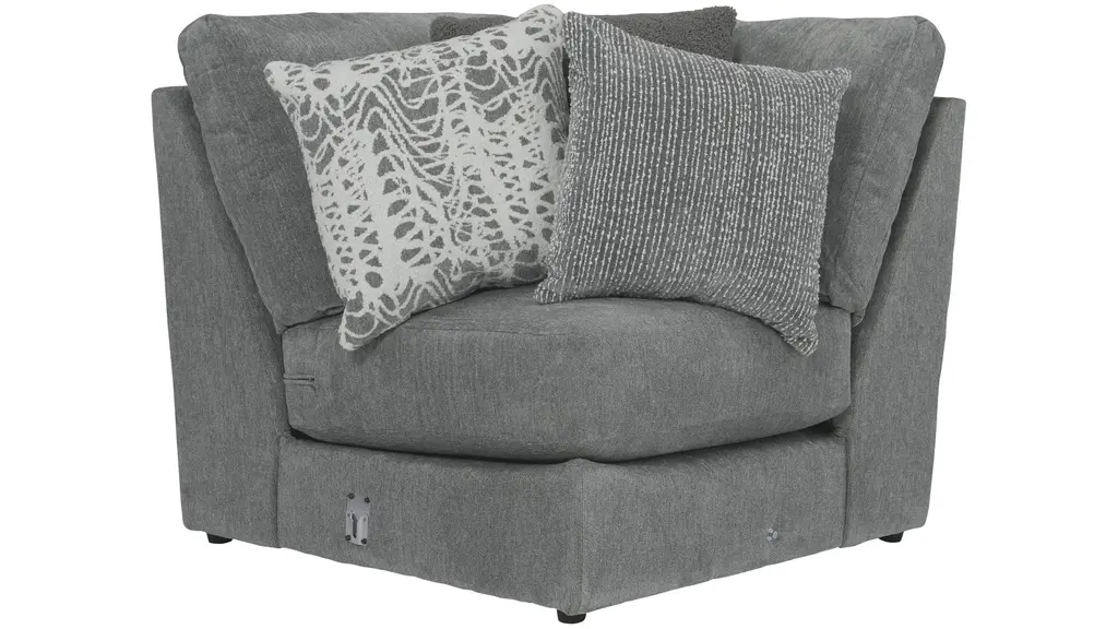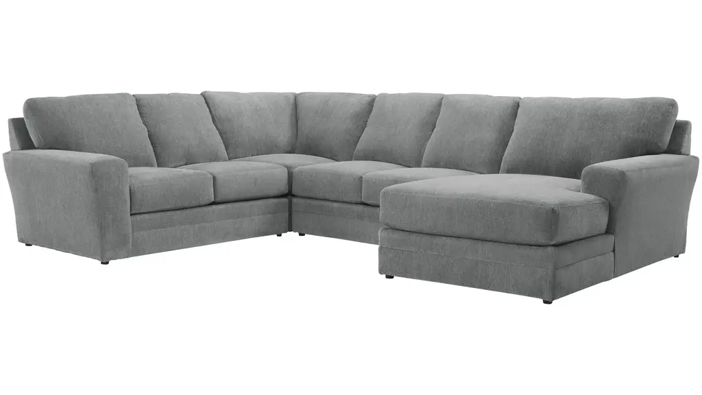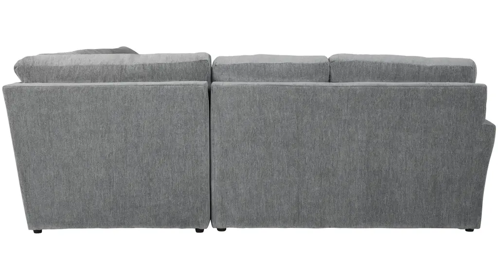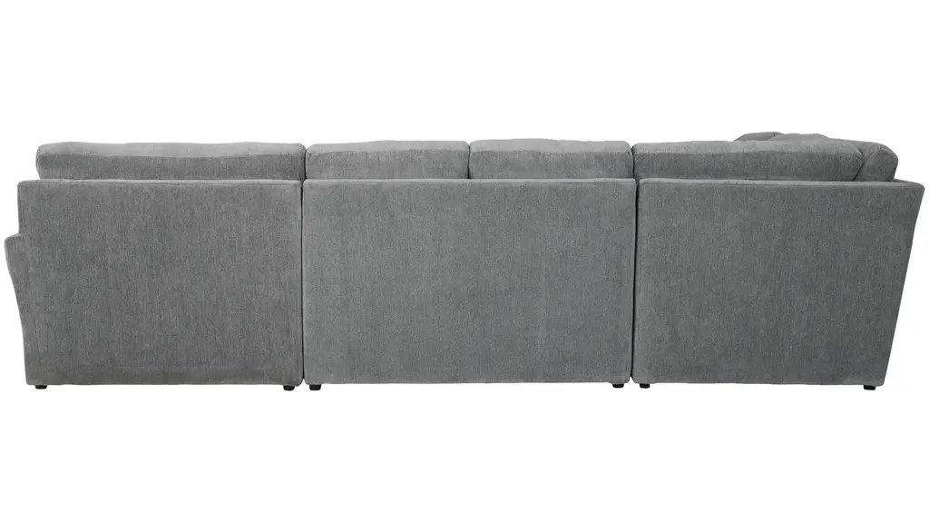 Gather, relax, and sink into comfort with the ultra-plush Kristoff 4-pc. sectional. Upholstered in a soft slate-gray fabric, it's designed for modern lounging with deep seats, supportive cushions, and a wraparound silhouette that invites everyone in. A mix of textured and patterned throw pillows in shades of light gray and ice blue adds visual interest and cozy layers. Whether you're hosting movie night or stretching out solo, this sectional turns your living space into a premium comfort zone. Includes left arm facing loveseat, corner, armless loveseat, right arm facing chaise.