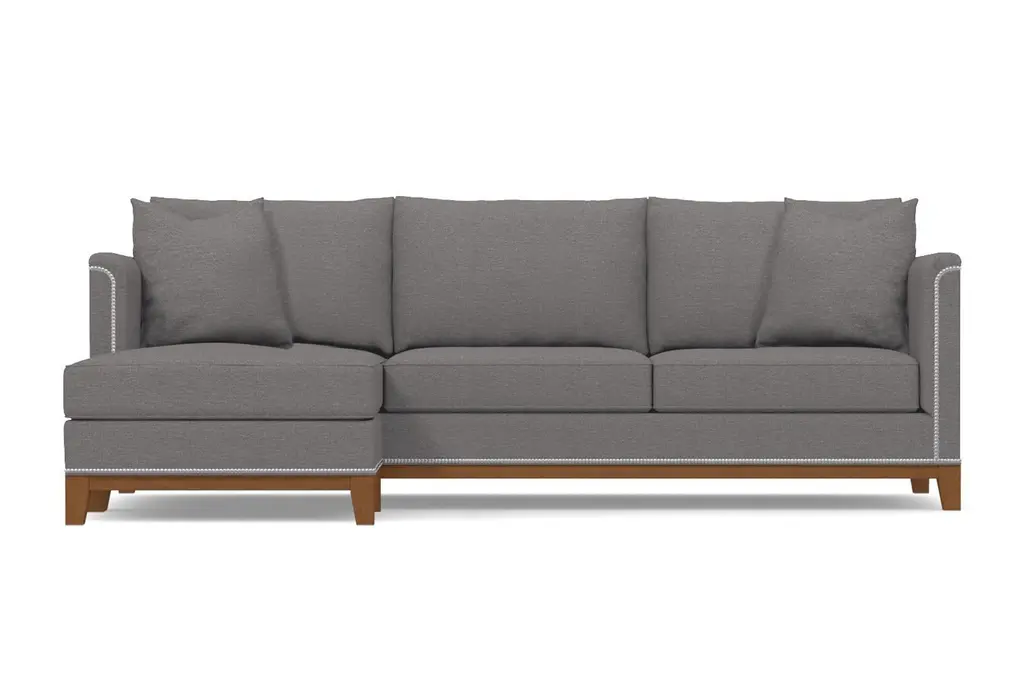 La Brea may be Spanish for "the tar", but there's nothing dark and sticky about the La Brea Studded 2-Piece Sectional. On the contrary, this is for everyone who wants to add elegance to their home that they've never experienced. We have framed each La Brea sectional with silver nailheads straight out of the old world. Originally a way to secure upholstery, this style adds the allure you've been seeking. Add in the modern shabby chic cushions, curved armrests and deep seats, and you have something that marries exquisiteness from all ages. Apt2B makes it easy to order a nailhead sectional with chaise that will class up any home. Just select your fabric color, leg finish and configuration below, and we will get to work building your sectional right here in the U.S. We use the finest hypoallergenic fabrics, solid wood and supportive high-density foam for maximum comfort. Our eco-friendly construction has a limited lifetime warranty - so it should last about as long as the tar pits do. We are dedicated to offering world-class service, so if you need fabric swatches, are having trouble ordering or want to know more about the La Brea collection, just let us know!