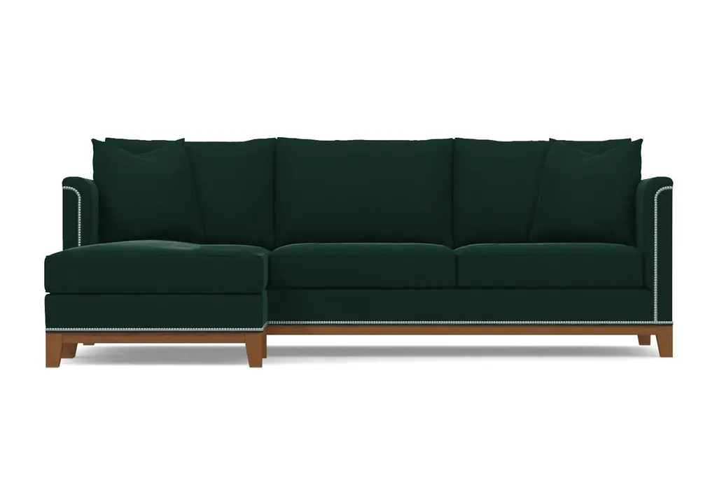 La Brea may be Spanish for "the tar", but there's nothing dark and sticky about the La Brea Studded 2-Piece Sectional. On the contrary, this is for everyone who wants to add elegance to their home that they've never experienced. We have framed each La Brea sectional with silver nailheads straight out of the old world. Originally a way to secure upholstery, this style adds the allure you've been seeking. Add in the modern shabby chic cushions, curved armrests and deep seats, and you have something that marries exquisiteness from all ages. Apt2B makes it easy to order a nailhead sectional with chaise that will class up any home. Just select your fabric color, leg finish and configuration below, and we will get to work building your sectional right here in the U.S. We use the finest hypoallergenic fabrics, solid wood and supportive high-density foam for maximum comfort. Our eco-friendly construction has a limited lifetime warranty - so it should last about as long as the tar pits do. We are dedicated to offering world-class service, so if you need fabric swatches, are having trouble ordering or want to know more about the La Brea collection, just let us know!