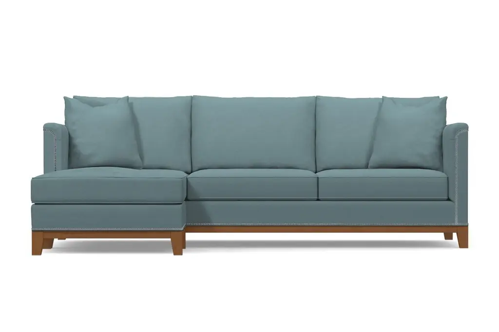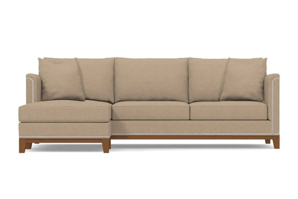 La Brea may be Spanish for "the tar", but there's nothing dark and sticky about the La Brea Studded 2-Piece Sectional. On the contrary, this is for everyone who wants to add elegance to their home that they've never experienced. We have framed each La Brea sectional with silver nailheads straight out of the old world. Originally a way to secure upholstery, this style adds the allure you've been seeking. Add in the modern shabby chic cushions, curved armrests and deep seats, and you have something that marries exquisiteness from all ages. Apt2B makes it easy to order a nailhead sectional with chaise that will class up any home. Just select your fabric color, leg finish and configuration below, and we will get to work building your sectional right here in the U.S. We use the finest hypoallergenic fabrics, solid wood and supportive high-density foam for maximum comfort. Our eco-friendly construction has a limited lifetime warranty - so it should last about as long as the tar pits do. We are dedicated to offering world-class service, so if you need fabric swatches, are having trouble ordering or want to know more about the La Brea collection, just let us know!