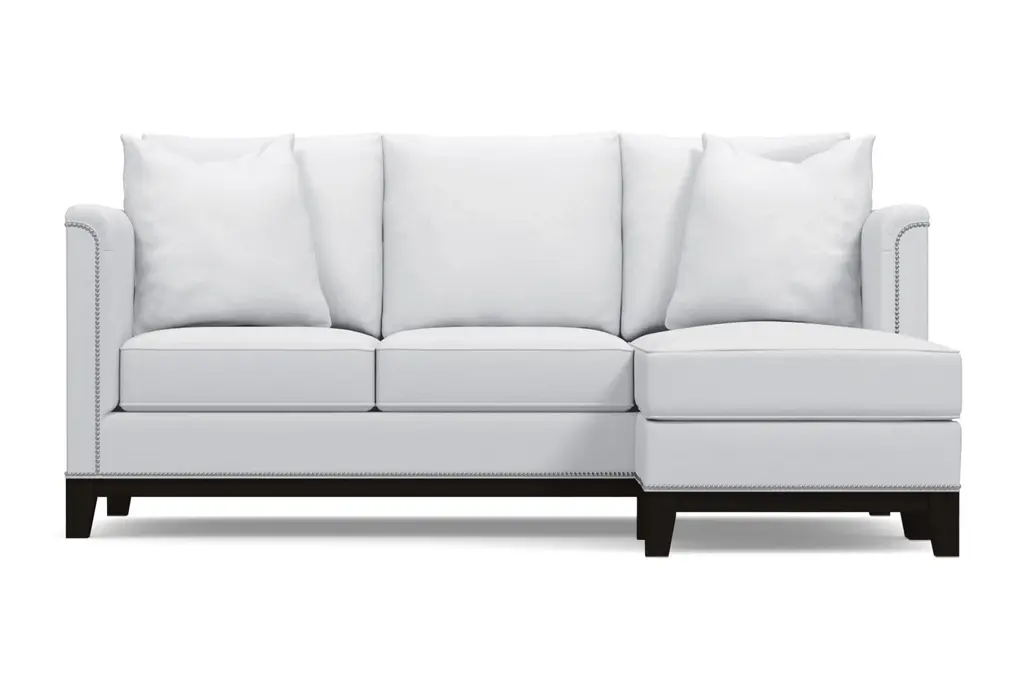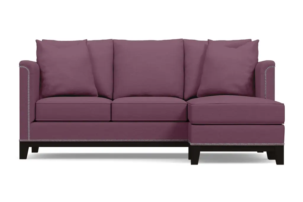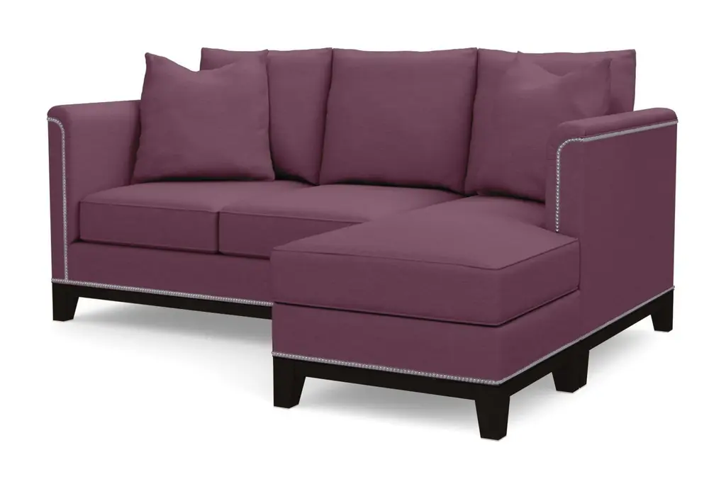If you're looking for a versatile sofa that exudes elegance and luxurious comfort, the La Brea Reversible Chaise Sofa is for you. It looks like it belongs in a villa on the Italian countryside, but we'd much rather see it in your living room. The best part? The chaise works on either side of the couch, giving you more flexibility when designing your space. Its plush oversized pillows beckon you to relax while the visible silver nail head studs and rich espresso base brings unmatched style to your home or apartment. Available in your choice of fabrics and colors, the La Brea was made in the United States and comes with a limited lifetime warranty. The La Brea Sofa Collection combines old world style with new world modern elegance. Framed by silver nail head studs and a rich espresso wooden base, the La Brea will make your room look like a million bucks.
