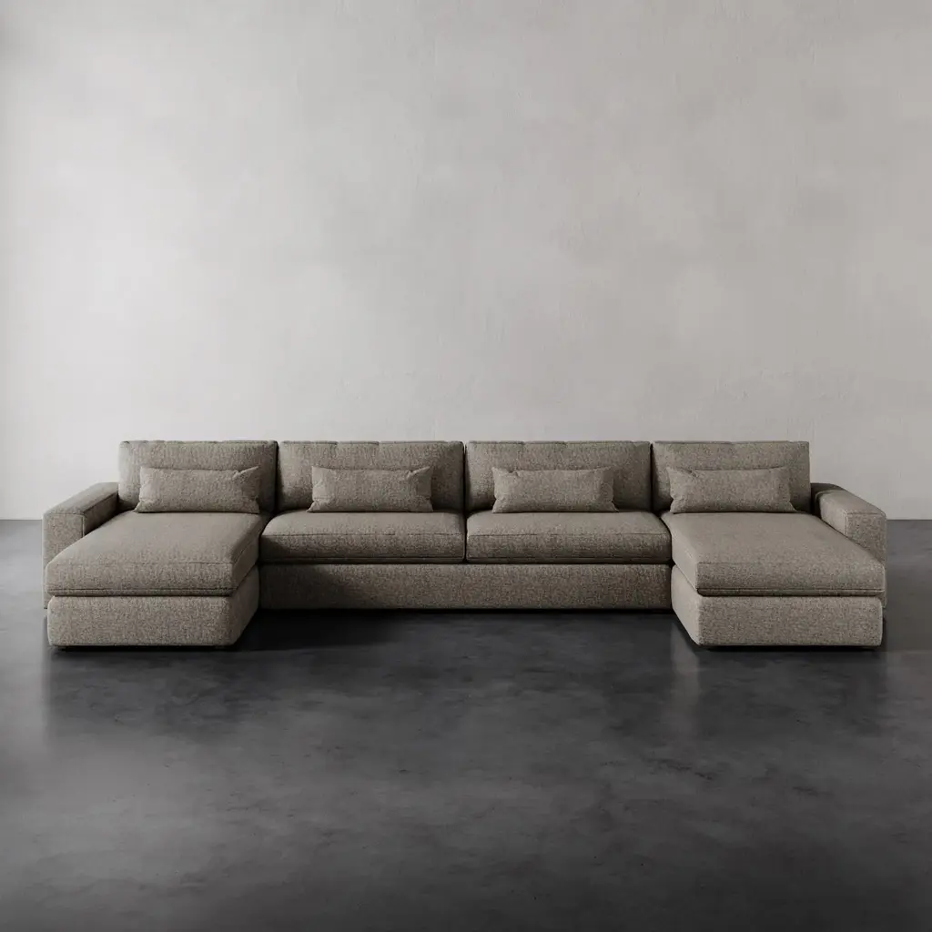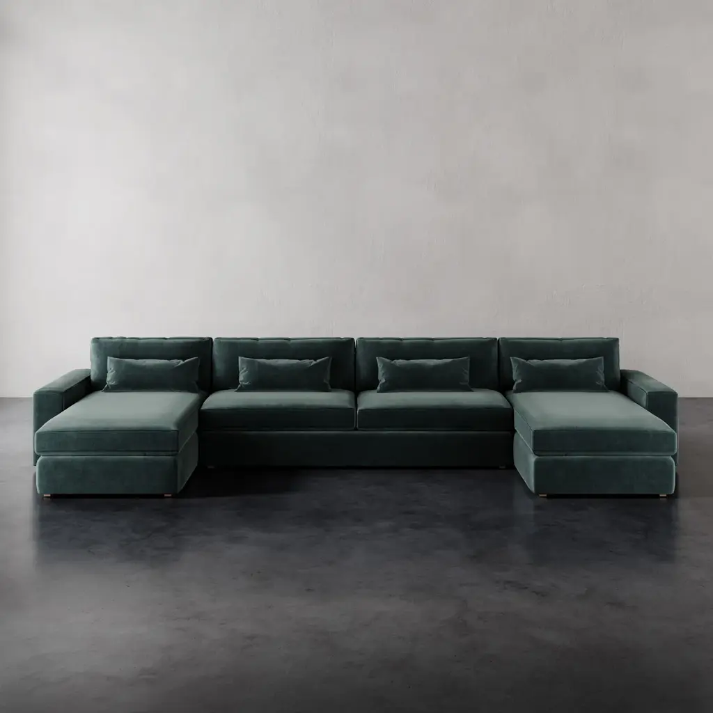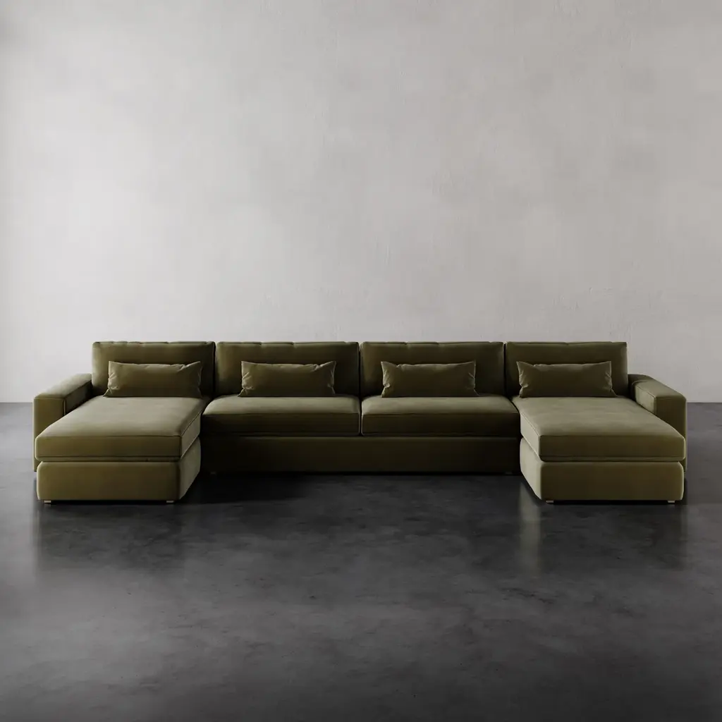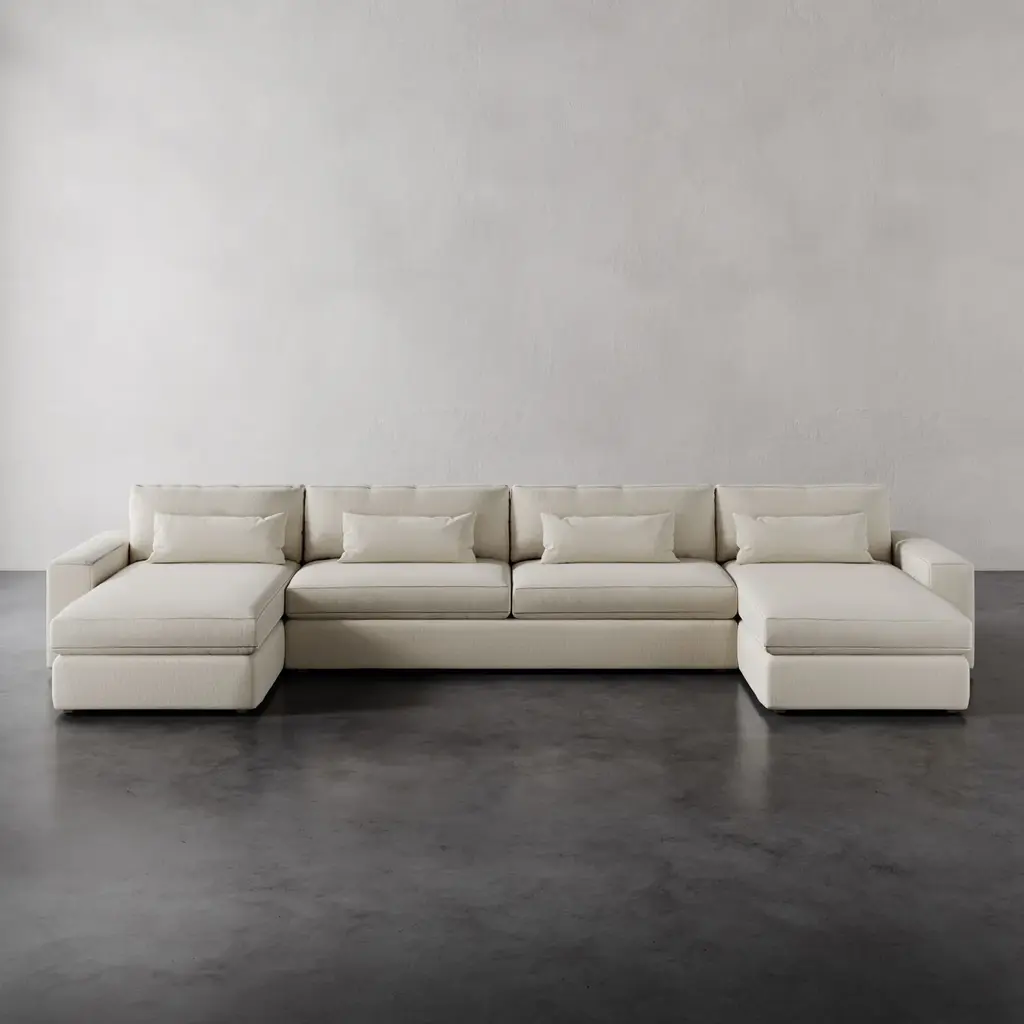 The Lacroix Collection from Lemieux et Cie is a modular masterpiece that brings timeless form and modern comfort into perfect balance. Inspired by the iconic geometry of Jean-Michel Frank, each piece is defined by clean rectilinear lines and deep, generous proportions. Designed for versatility, the collection includes multiple modular components that can be configured to create custom sectional sofas of any size or scale. With sink-into comfort and sculptural simplicity, the Lacroix Collection offers a tailored foundation for contemporary living. Bolster pillows included.The Lacroix Sofa Chaise & A Half U-Sectional is handmade by skilled artisans in North Carolina.
