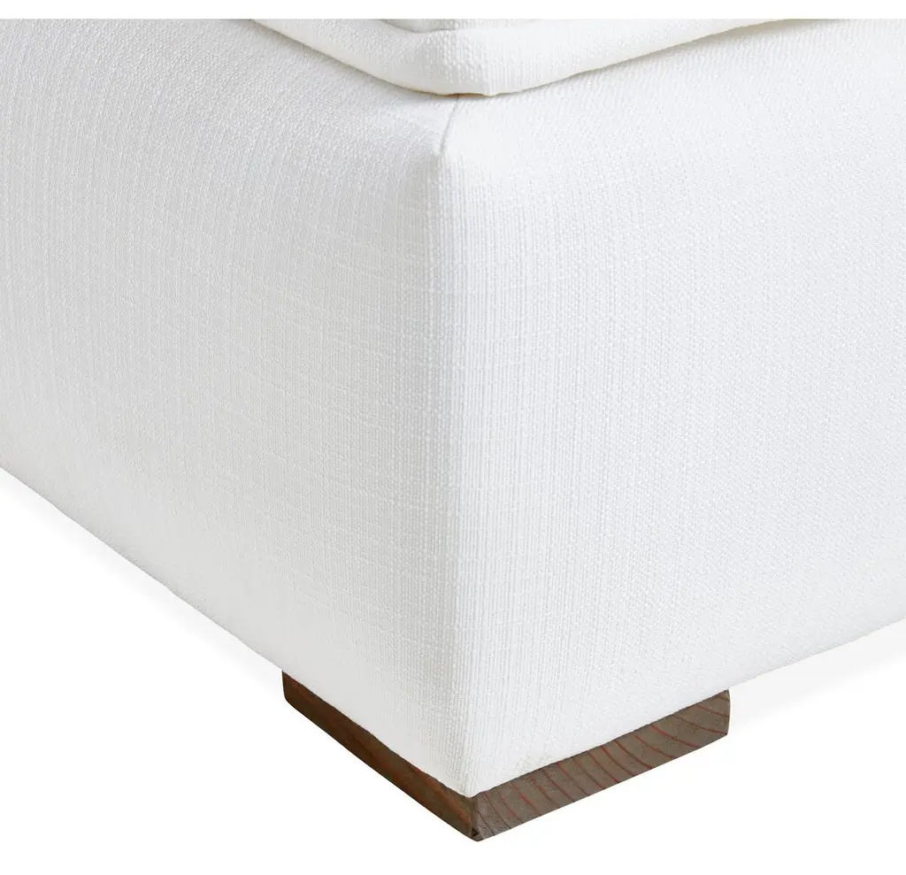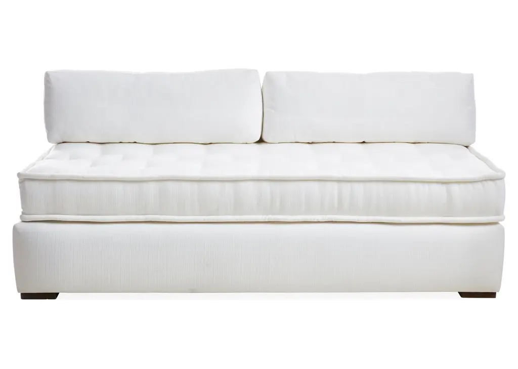 Designed by us and available only at One Kings Lane: Boasting a clean-lined, armless silhouette, this sofa is framed in reclaimed alder and set on block feet. Stylish on its own or as a module in a sectional, its fully upholstered body and tufted box-style seat cushion are covered in a durable woven fabric that mimics the look and feel of linen, while an ample fill of foam wrapped with Dacron and Trillium ensures long-lasting comfort. Two rectangular back cushions complete this design.