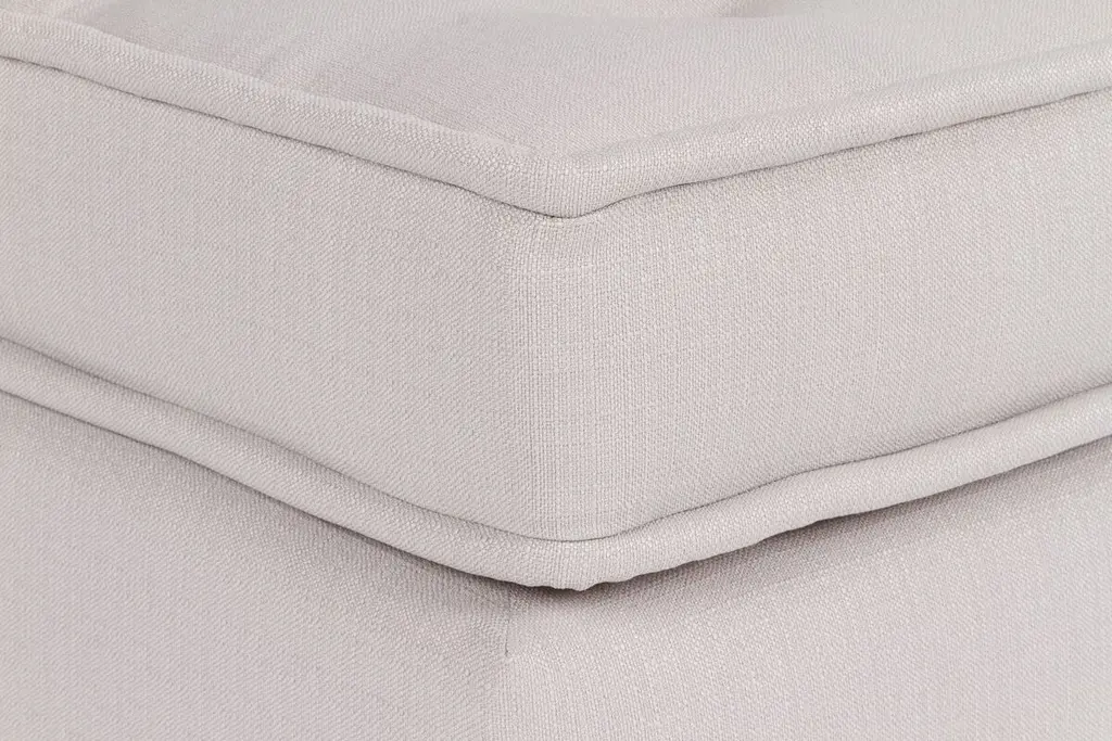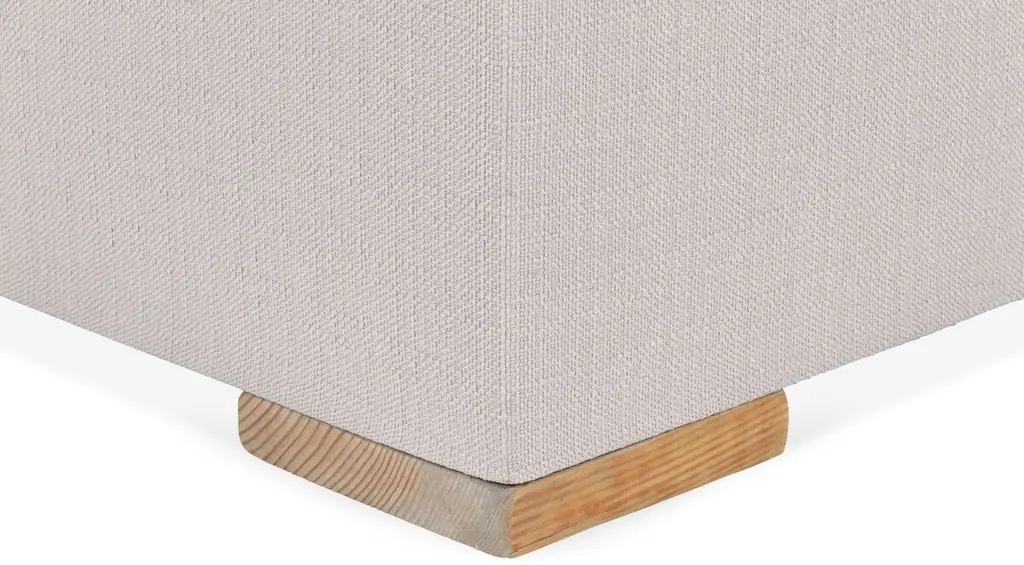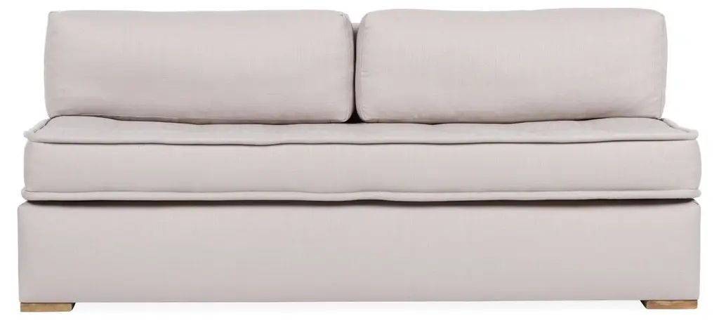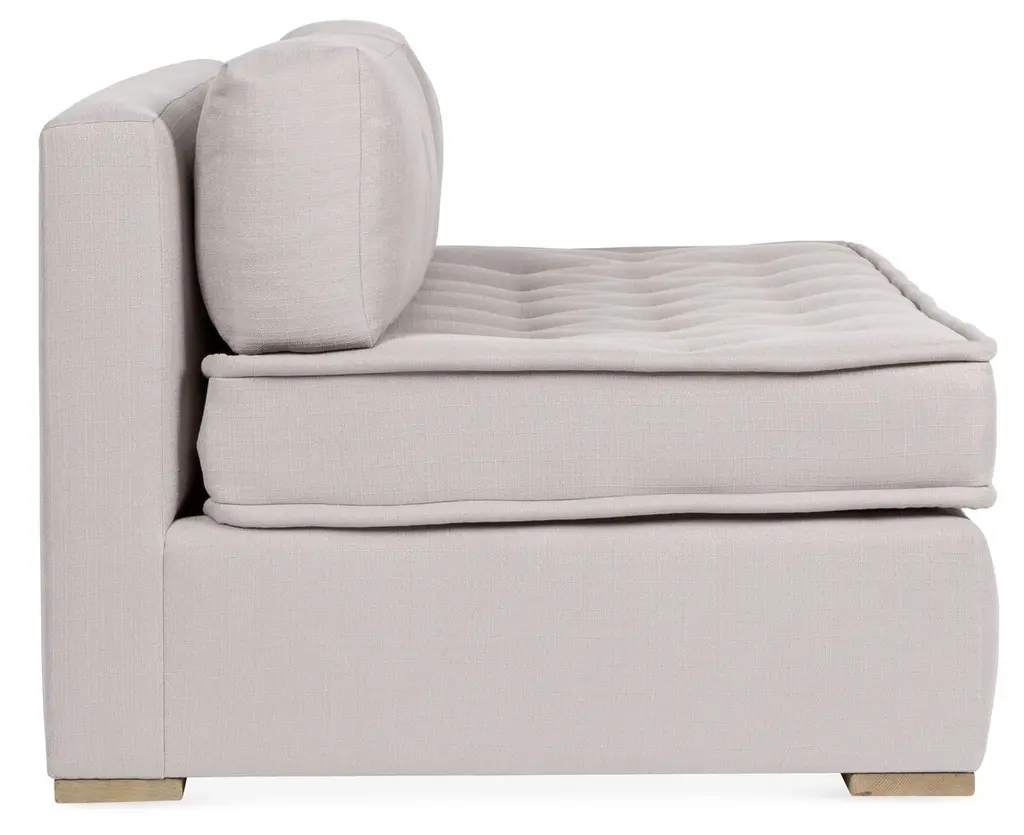 Designed by us and available only at One Kings Lane: Boasting a clean-lined, armless silhouette, this sofa is framed in reclaimed alder and set on block feet. Stylish on its own or as a module in a sectional, its fully upholstered body and tufted box-style seat cushion are covered in a durable woven fabric that mimics the look and feel of linen, while an ample fill of foam wrapped with Dacron and Trillium ensures long-lasting comfort. Two rectangular back cushions complete this design.