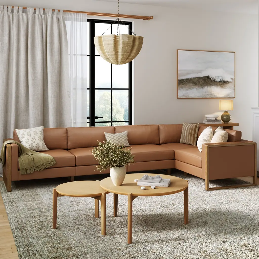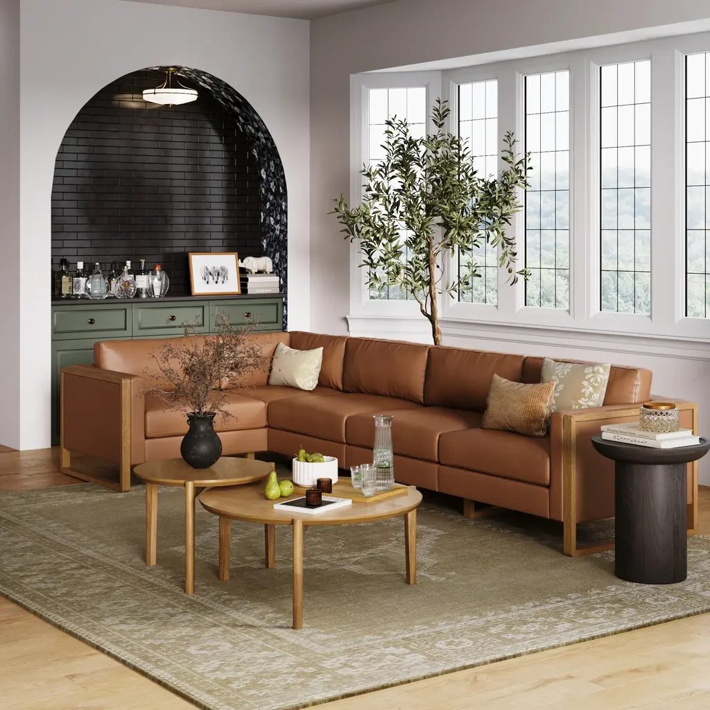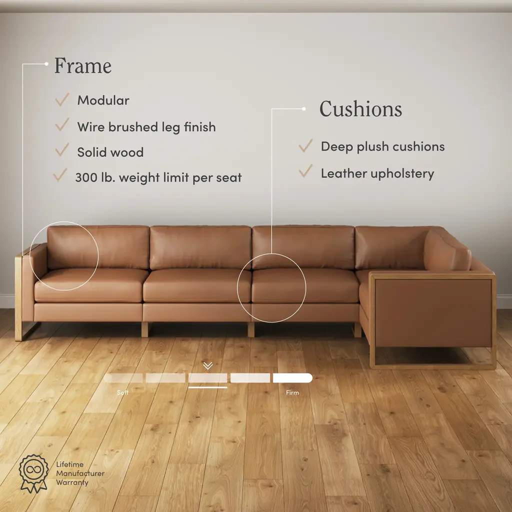 Elevate your living space with the Madison modular sofa collection. With multiple sofa sizes and configurations to choose from, you have the flexibility to customize your perfect arrangement, whether you prefer a cozy loveseat or a spacious sectional. The collection's leather upholstery finish and wood accents lend a touch of sophistication, while its 300 lb. weight capacity makes it practical for movie nights for the whole family. Plus, its plush back cushions are designed for the ultimate Netflix experience. So, go ahead and sink into the softness without a care in the world, because these sofas are all about long-lasting comfort and durability.