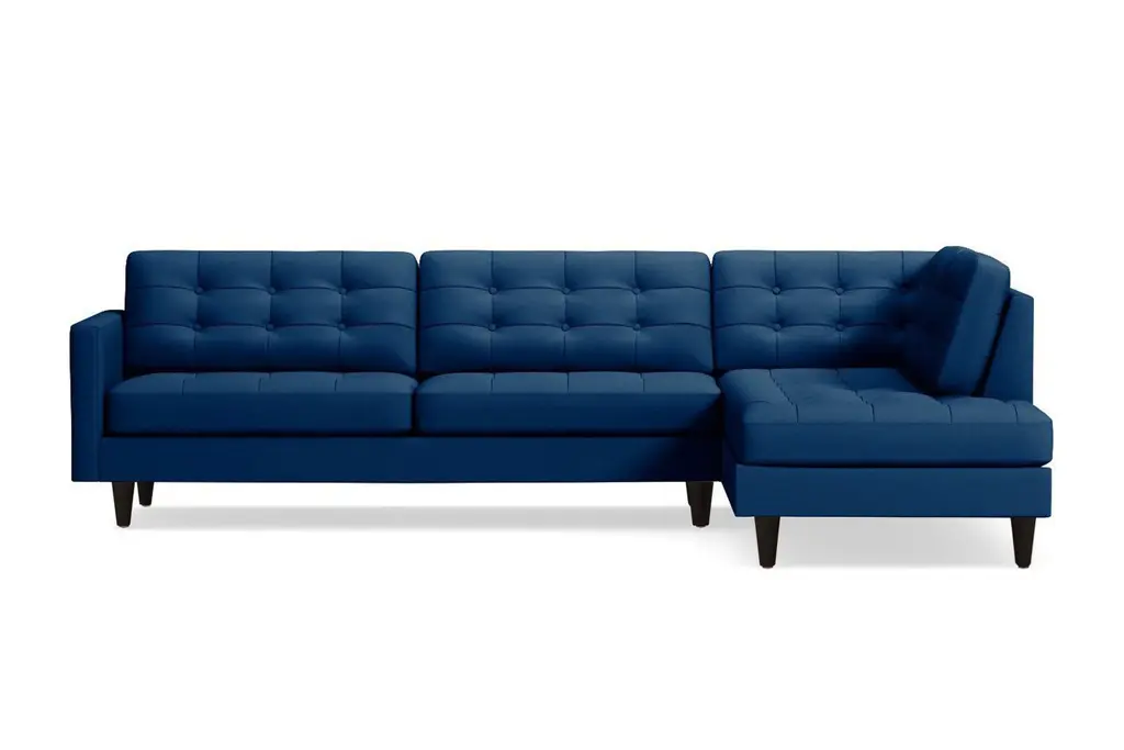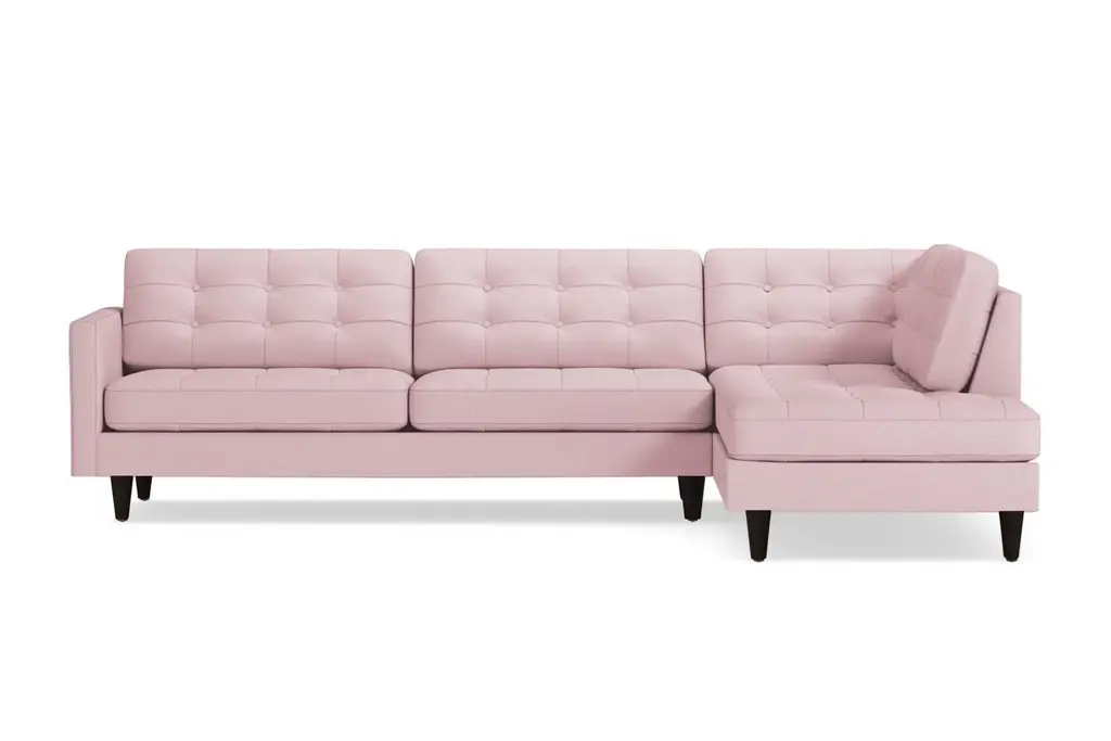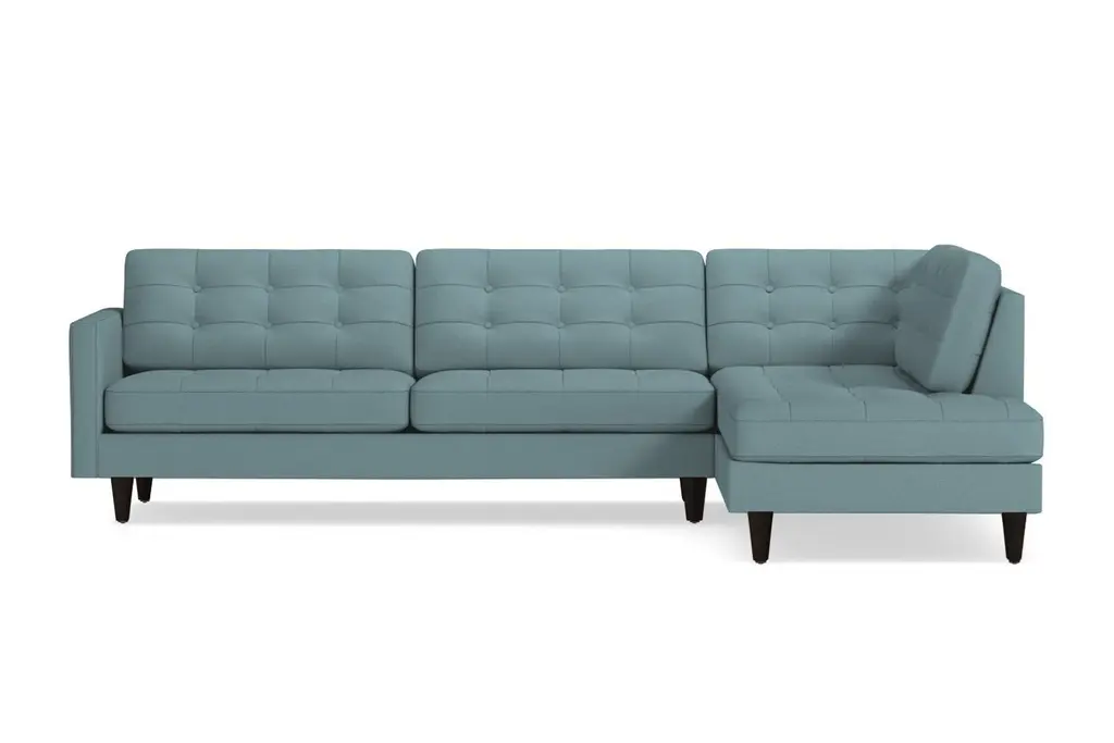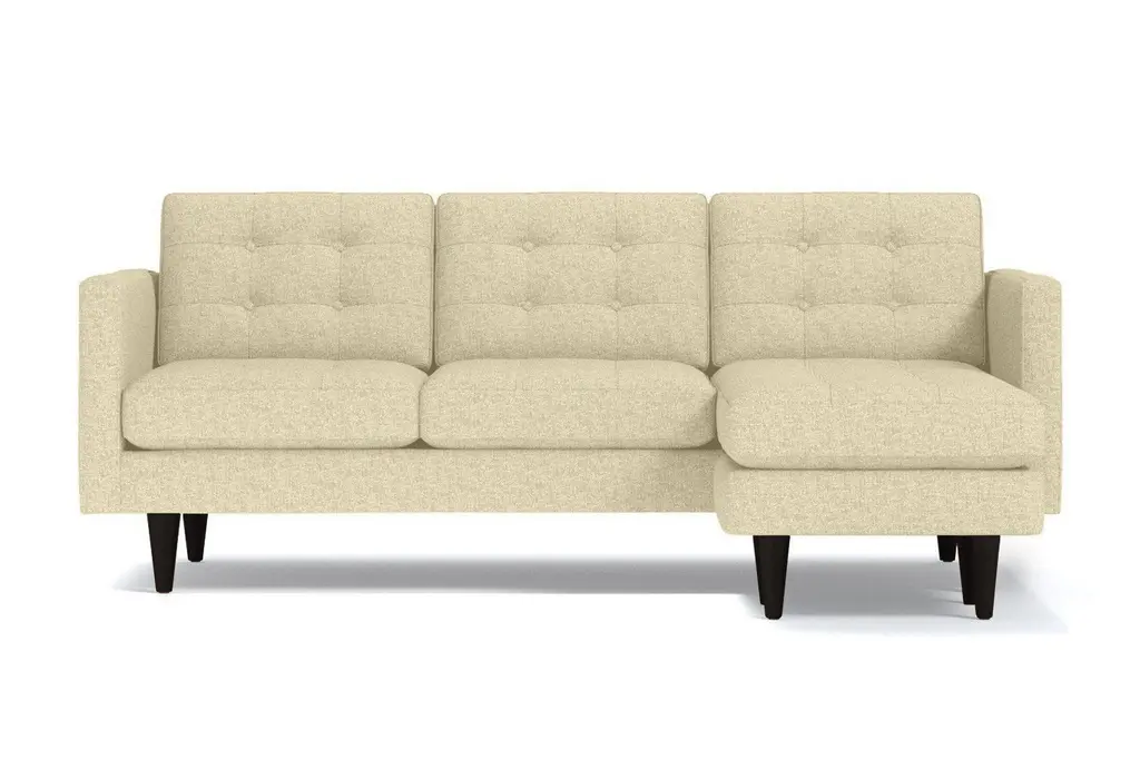 Looking for the perfect combination of comfort and style? Thanks to the Lexington Two-Piece Sectional Sofa, the search is over. The plush, button-tufted cushions are so inviting yet chic and the tapered dark wooden legs add to the midcentury modern mystique. This sofa is available in a selection of colors and fabrics, so whether you're looking for an easy-to-clean poly-nylon blend or a resilient ultra-tight weave (pictured), you'll find the perfect upholstery and color to suit your taste. And if you can't decide, we're more than happy to send you complimentary swatches. This sectional was made in the United States and features a limited lifetime warranty. We offer a 100-percent satisfaction guarantee. Totally hip and mod, the Lexington Collection is a fantastically stylish, contemporary take on a classic design. The button tufted cushioning and unique wooden legs give it a mid-century modern look.