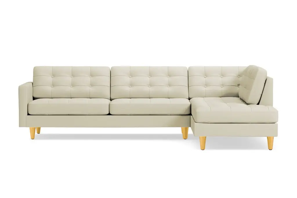 Looking for the perfect combination of comfort and style? Thanks to the Lexington Two-Piece Sectional Sofa, the search is over. The plush, button-tufted cushions are so inviting yet chic and the tapered dark wooden legs add to the midcentury modern mystique. This sofa is available in a selection of colors and fabrics, so whether you're looking for an easy-to-clean poly-nylon blend or a resilient ultra-tight weave (pictured), you'll find the perfect upholstery and color to suit your taste. And if you can't decide, we're more than happy to send you complimentary swatches. This sectional was made in the United States and features a limited lifetime warranty. We offer a 100-percent satisfaction guarantee. Totally hip and mod, the Lexington Collection is a fantastically stylish, contemporary take on a classic design. The button tufted cushioning and unique wooden legs give it a mid-century modern look.