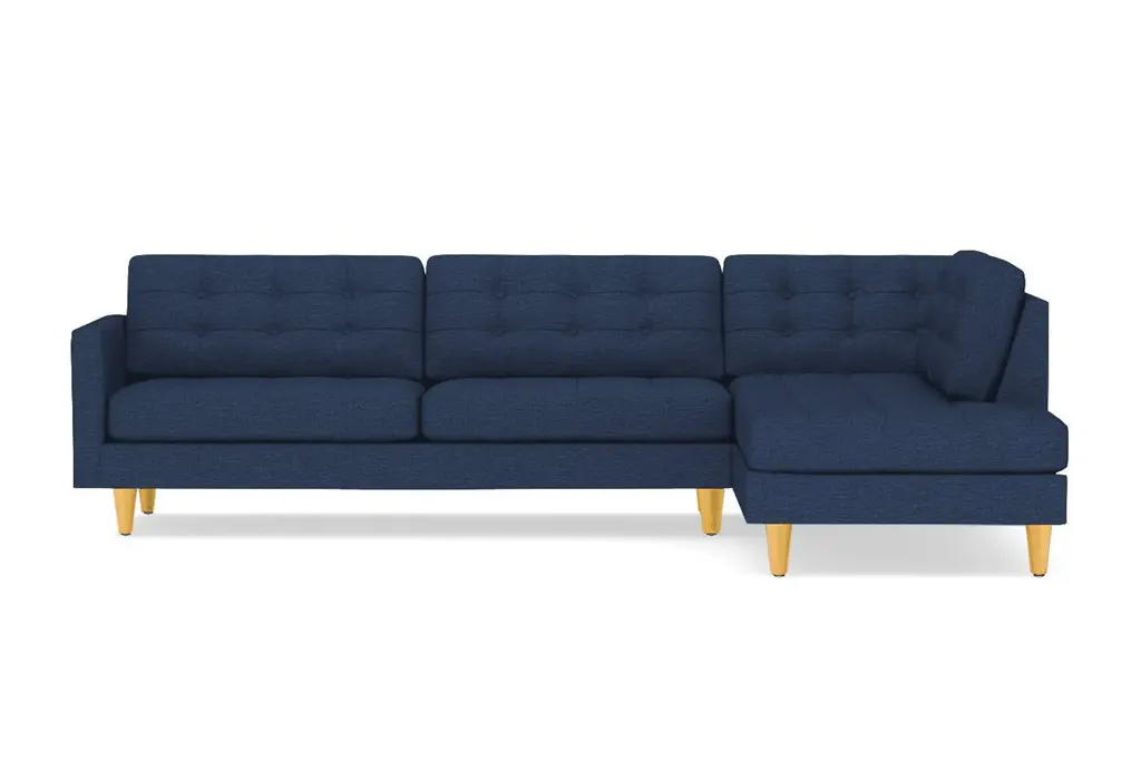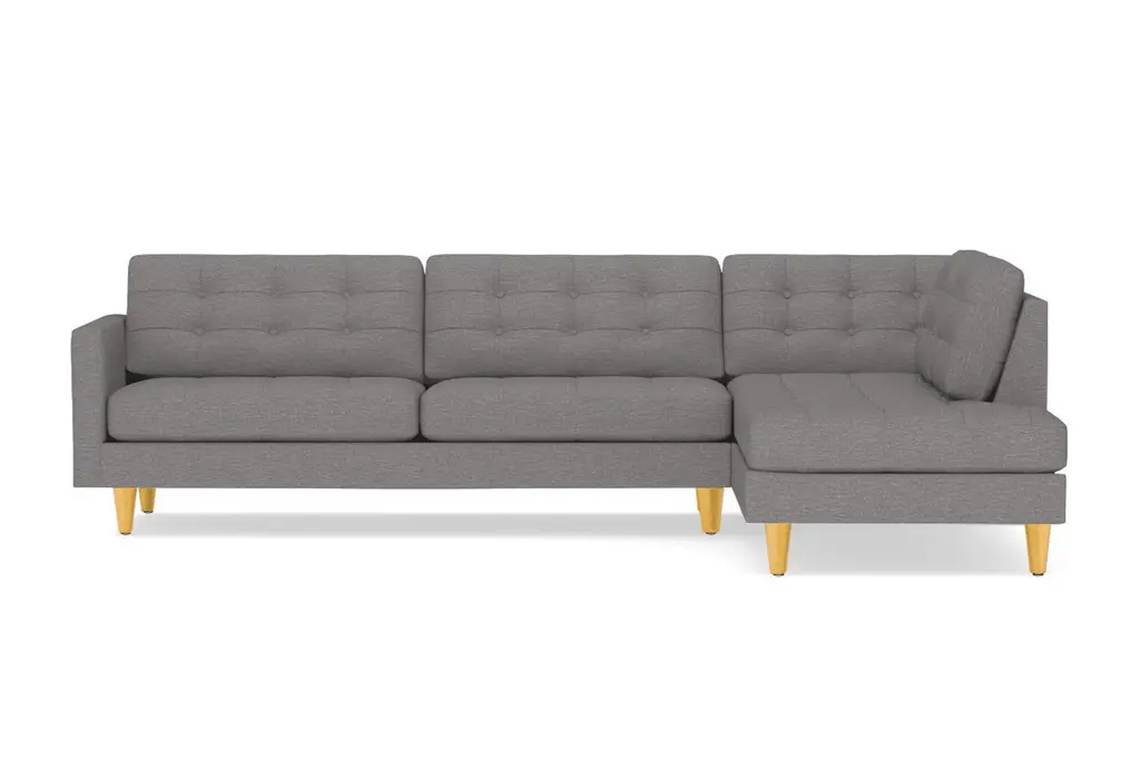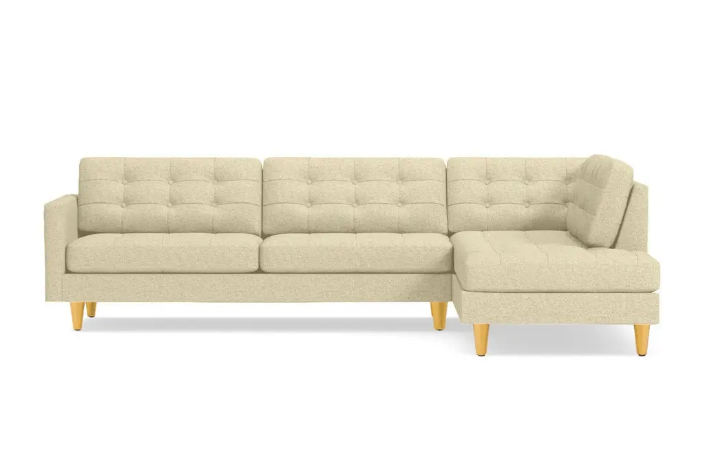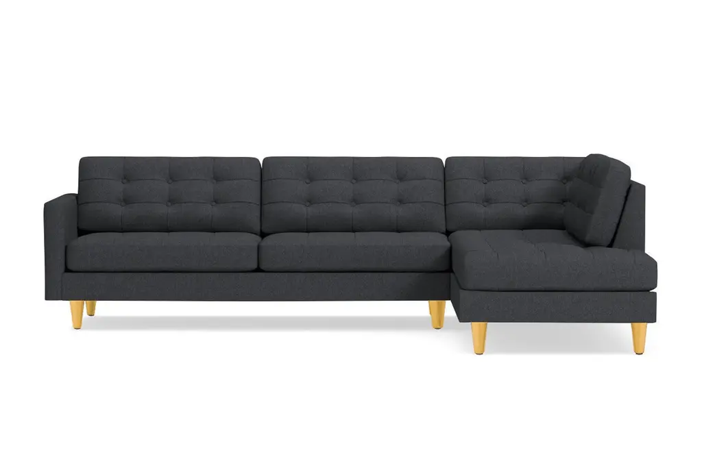 Looking for the perfect combination of comfort and style? Thanks to the Lexington Two-Piece Sectional Sofa, the search is over. The plush, button-tufted cushions are so inviting yet chic and the tapered dark wooden legs add to the midcentury modern mystique. This sofa is available in a selection of colors and fabrics, so whether you're looking for an easy-to-clean poly-nylon blend or a resilient ultra-tight weave (pictured), you'll find the perfect upholstery and color to suit your taste. And if you can't decide, we're more than happy to send you complimentary swatches. This sectional was made in the United States and features a limited lifetime warranty. We offer a 100-percent satisfaction guarantee. Totally hip and mod, the Lexington Collection is a fantastically stylish, contemporary take on a classic design. The button tufted cushioning and unique wooden legs give it a mid-century modern look.