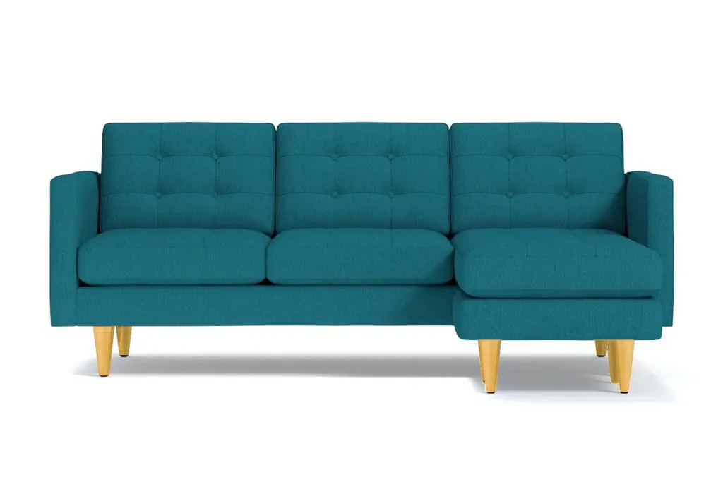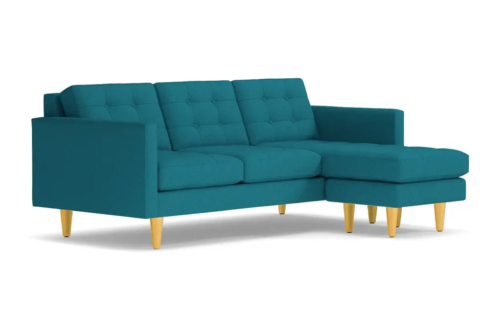Lexington is known for American Revolutionary War battles, horse racing, barbeque festivals, wait, those are three different Lexington's. But we can tell you the entire Lexington Collection is known for being the hippest modern furniture. This reversible chaise sofa has high arms, button tufted cushions and a unique base that's designed to be comfortable while keeping its shape. You can own this hypoallergenic sofa in one of 25 different fabrics, whether you want a woven beach, chromium or chicago blue chaise sofa. And set the ottoman up on either the right or left side - we don't judge. Each Lexington reversible chaise sectional is custom-made in the U.S. with a limited lifetime warranty, so you can enjoy fantastic mid-century modern style whether you prefer lessons in war history or smoked brisket. Totally hip and mod, the Lexington Collection is a fantastically stylish, contemporary take on a classic design. The button tufted cushioning and unique wooden legs give it a mid-century modern look.