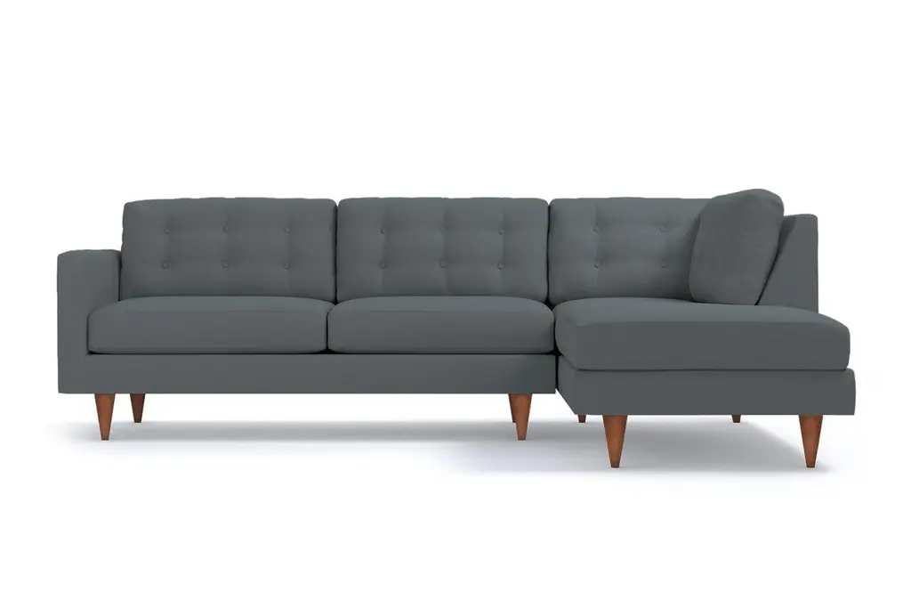 This sophisticated two-piece sectional evokes the style of old Hollywood glamour with its button-tufted back cushions and tapered wooden legs. Part of famed interior designer Kyle Schuneman's line and exclusively sold at Apt2B, the Logan is luxurious comfort at its very best. Perfect for entertaining guests or stretching out for a movie marathon, this versatile piece is both stylish and cozy. The Logan is fully customizable with your choice of colors and fabrics, so whether you're looking for smooth microfiber or a high-piled upholstery, you'll find it at Apt2B. If you're not sure about the color or fabric, just ask and we'll send you a few swatches to help you decide. This sofa is made in the United States and comes with a lifetime guarantee. What are you waiting for? Looking for a two-piece sectional that radiates modern style? The Logan from Kyle Schuneman is the perfect choice. With classic button-tufted back cushions and an oversized chaise for optimum relaxation, it not only looks great in your living room, it's comfortable too! We offer an array of color choices so you can customize the Logan to match your existing decor. Whether you're looking for a blue sectional sofa or a delicate shade of seafoam, you'll find it. Apt2B specializes and apartment furniture that embodies the modern style. We love the Logan because it's made right here in the United States and it comes with a limited lifetime warranty. Our furniture comes with a 100-percent satisfaction guarantee.