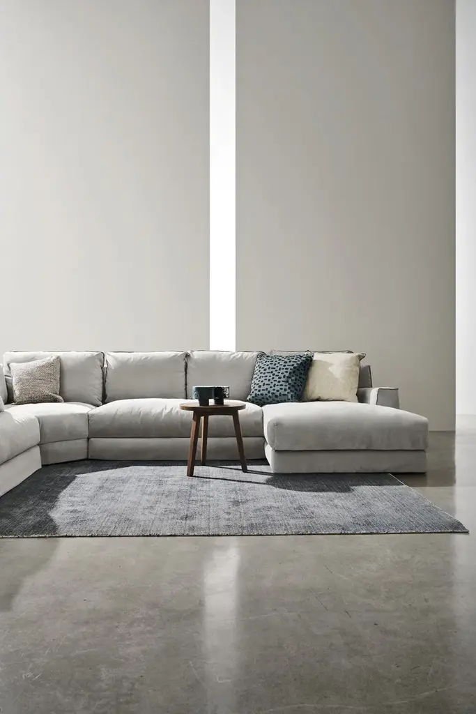 Modules of different shapes and particular corner elements of the LOLL sofa family allow you to create ever new configurations. A proposal that tells a story of contemporary comfort, made special by the attention to detail, the quality of the materials and the uniqueness of the craftsmanship, such as the profile of the sofas underlined by the characteristic sew/cut seam which, like a light line drawn by hand, follows the essential geometries and soft lines of the collection. The solid wood structure with polyurethane foam shell is combined with large seat and back cushions made with a soft layer of channelled goose down, recovering the traditional technique of using pocket springs in the seat cushions for enhanced comfort. In all its versions, the covers of the LOLL collection are completely and easily removable.The new LOLL sectional sofa designed by Paola Navone invites you to relax. A project in which comfort and functionality are perfectly expressed through the creation of ever-new compositions, depending on requirements, thanks to modules with different shapes and special corner elements that allow for unusual compositions which bestow an architectural presence upon this sofa in the interior. The LOLL sectional sofa completes the LOLL family of sofas available in three sizes: 200 cm, 240 cm – also in a 140 cm deep version – and 280 cm, as well as an armchair, upholstered small armchair and chaise-longue. It is a model that exudes contemporary comfort, rendered truly special by its attention to detail, high-quality materials and unique craftsmanship, such as the profile of the sofas accentuated by the characteristic cut⁄stitching which, like a delicate stroke drawn freehand, follows the collection’s minimal geometry and soft lines. The solid wood structure supports a comfortable polyurethane foam shell covered with a special hypoallergenic and antibacterial elastic fibre. To make the upholstered parts extremely comfortable and nest-like, a soft layer of channelled goose down has been used, reviving the traditional technique of using pocketed springs in the seat cushions. In all its versions, the LOLL collection has covers that can be completely and easily removed.