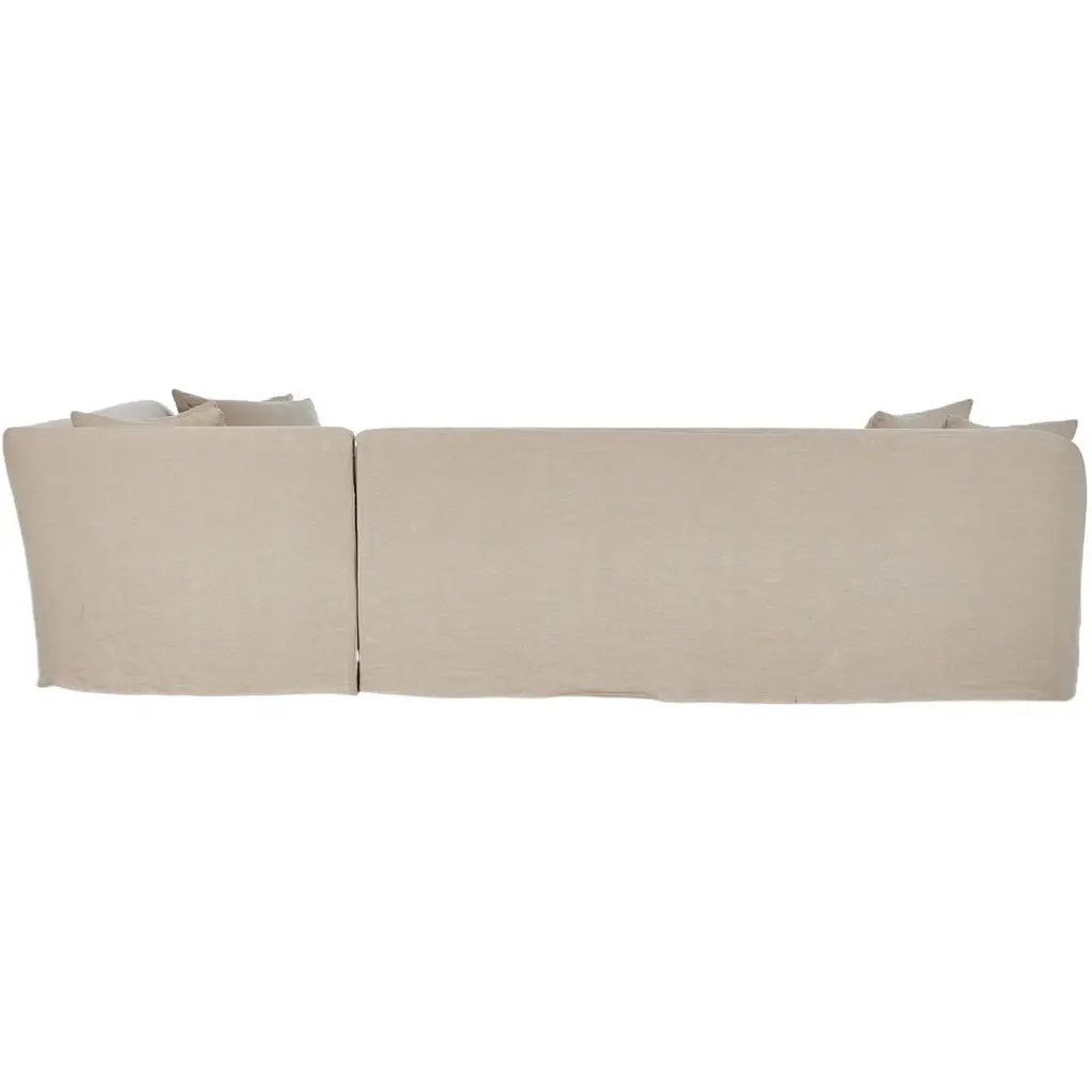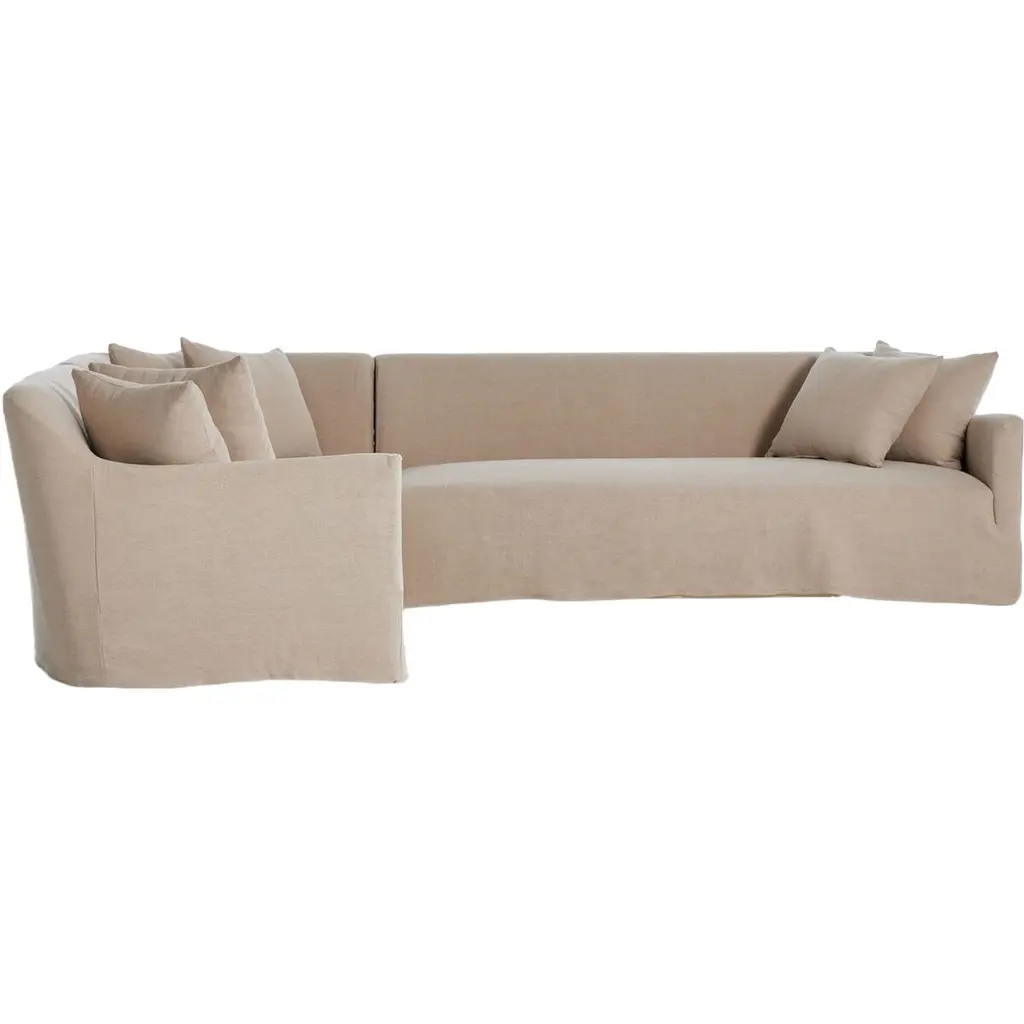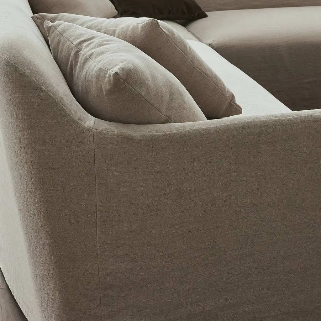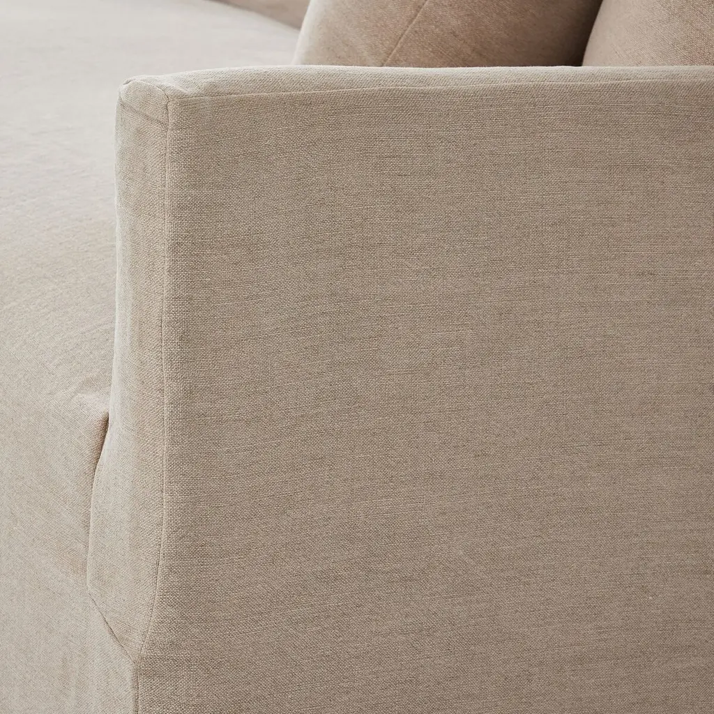 A simple modern design covered in a removable 100% linen slipcover with a tightly tailored look. The sectional is designed with subtle slopes all around and fixed seating with S-spring construction. A design collaboration by Amber Lewis and Four Hands.