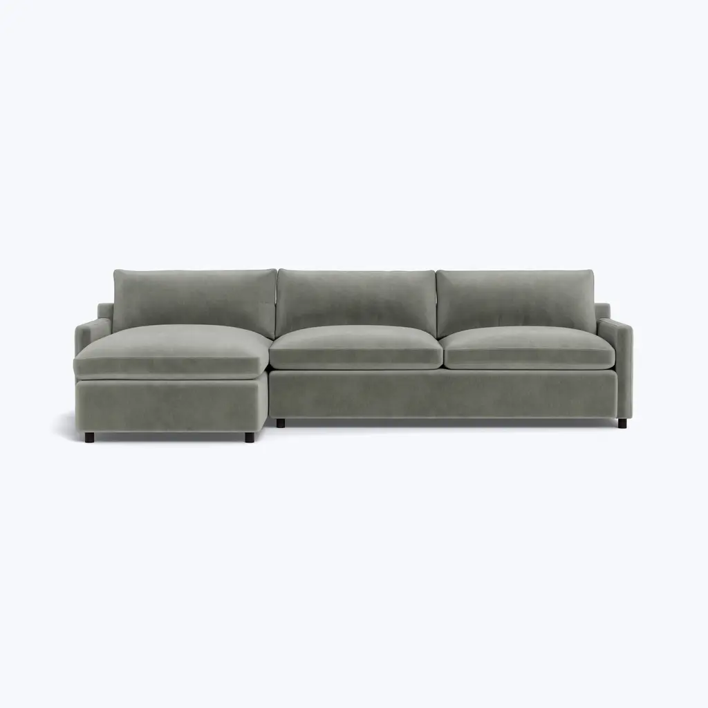 Inspired by the relaxed charm of Brooklyn’s Cobble Hill neighborhood, the Lucali Sectional is perfect for those cozy nights in—whether you're sharing pizza with friends or settling in for a movie marathon. Measuring 121 inches, this two-piece sectional offers generous seating for family rooms, casual living spaces, or dens, making it the ideal choice for those who love to lounge in style. With sleek track arms and a modern floating base, the Lucali Sectional adds a contemporary edge to any room, while its plush blend-down cushions provide the comfort you crave. The Lucali Sectional is crafted for ultimate relaxation and versatility. Its spacious seating is perfect for stretching out on your own or hosting family and friends for casual get-togethers. Whether it's a quiet evening or a lively gathering, the Lucali Sectional offers a cozy and stylish centerpiece for any occasion. Built with a sustainably sourced Goodwood frame, the Lucali Sectional marries eco-conscious materials with high-quality craftsmanship. The blend-down cushions, made from a luxurious mix of feather and down, are carefully washed to meet hypoallergenic standards, ensuring a soft yet supportive seating experience that makes every moment feel like a retreat. Handcrafted in the USA, the Lucali Sectional can be customized to suit your style and space. Choose from over 80 fabric options, including sumptuous velvets, soft linens, and durable performance textiles, to create a sectional that perfectly reflects your personal aesthetic. With so many options available, it’s easy to make the Lucali Sectional your own, adding both style and comfort to your home. Whether you place it in a family room for everyday lounging or in a living room as the focal point for entertaining, the Lucali Sectional balances style, comfort, and practicality. Its modern design, eco-conscious construction, and customizable options make it an essential piece for creating a cozy yet stylish atmosphere, perfect for making lasting memories with loved ones.