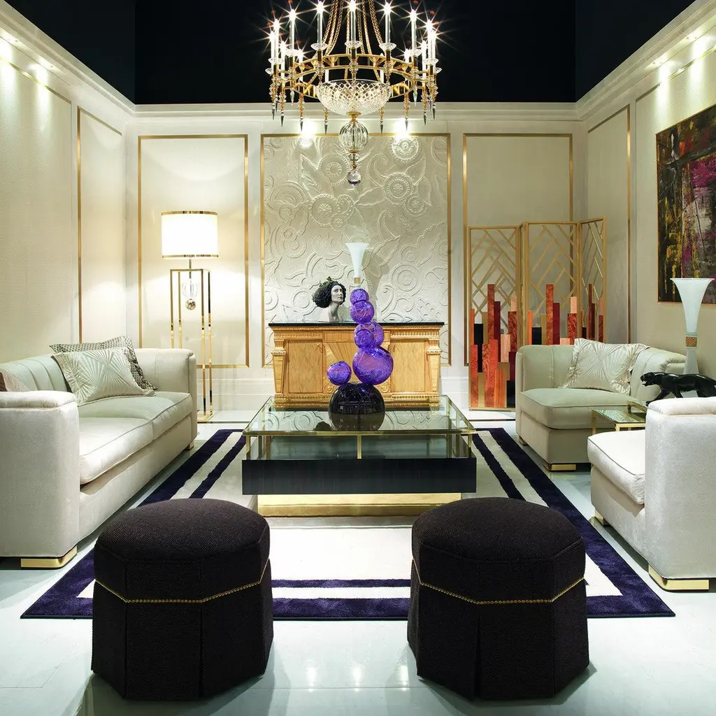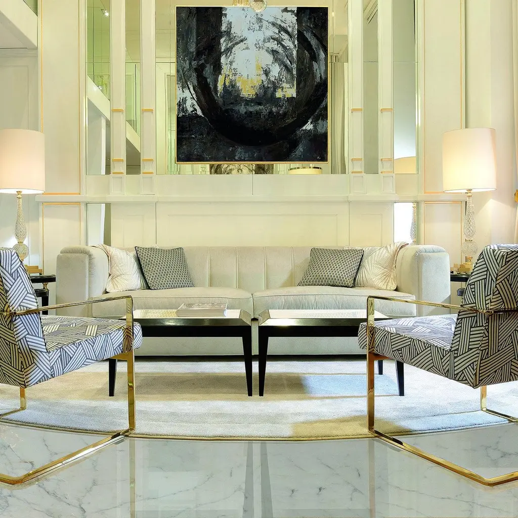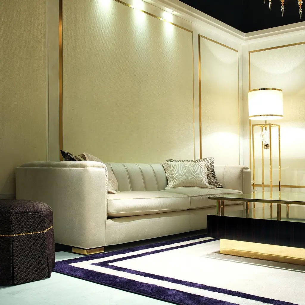 The Magritte Sofa is a timeless classic with a modern twist and strong aesthetic appeal. Upholstered in a velvety, light-taupe hued fabric, this sofa features block feet in gold-finished wood and two seat cushions filled with goose down. The embracing back and armrests recall the tub-shaped silhouette, here reinterpreted with angular corners, accentuated by double vertical embroideries that create a high-impact visual effect. Available also as 2-seater, armchair with a double or single arm, pouf, and sectional sofa with several modular pieces.