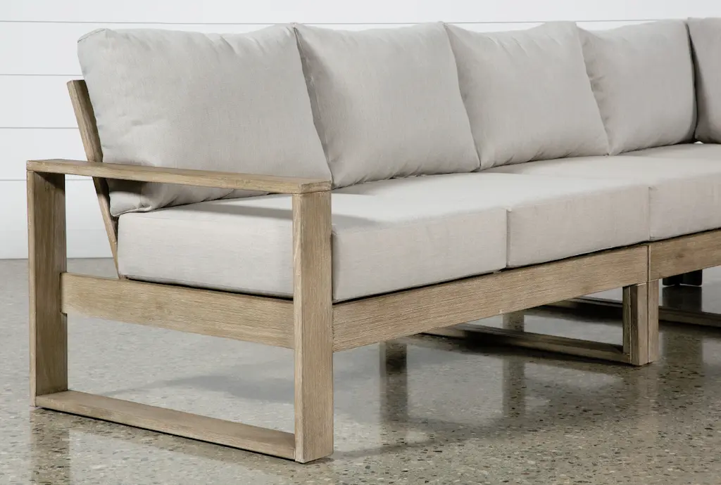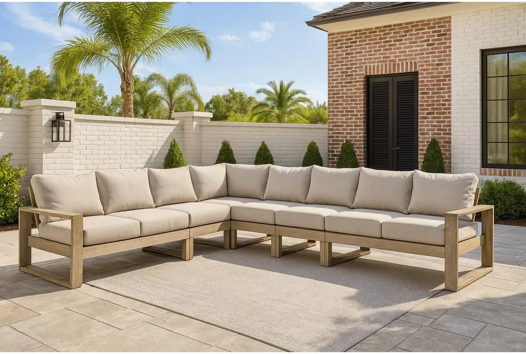 Experience the perfect blend of comfort and style with the Malaga Beige Natural Outdoor 6 Piece 140" Sectional. This modern modular sectional is designed to enhance your outdoor living space with its track arms and loose reversible back cushions. The distressed grey eucalyptus wood frame provides durability and a natural aesthetic, making it a standout addition to your patio or deck.