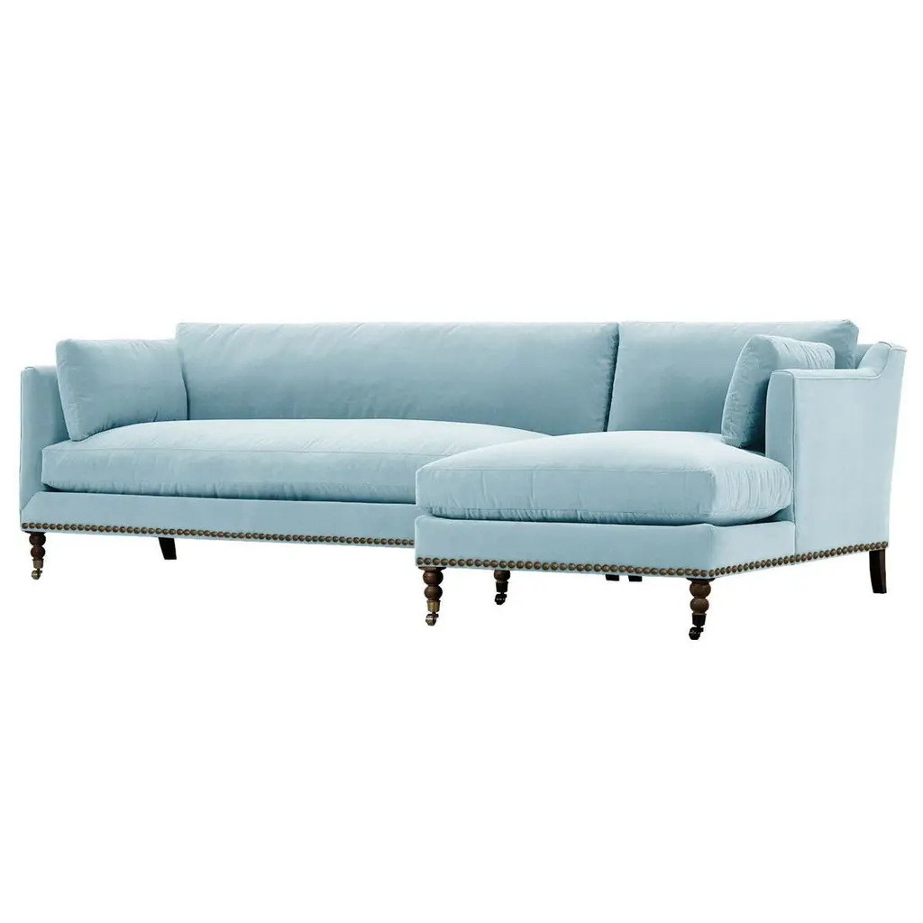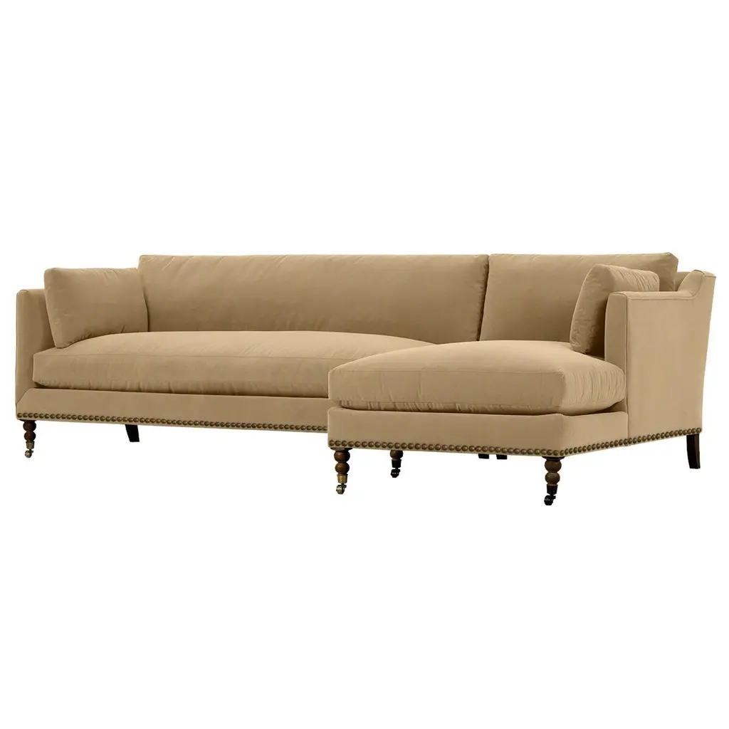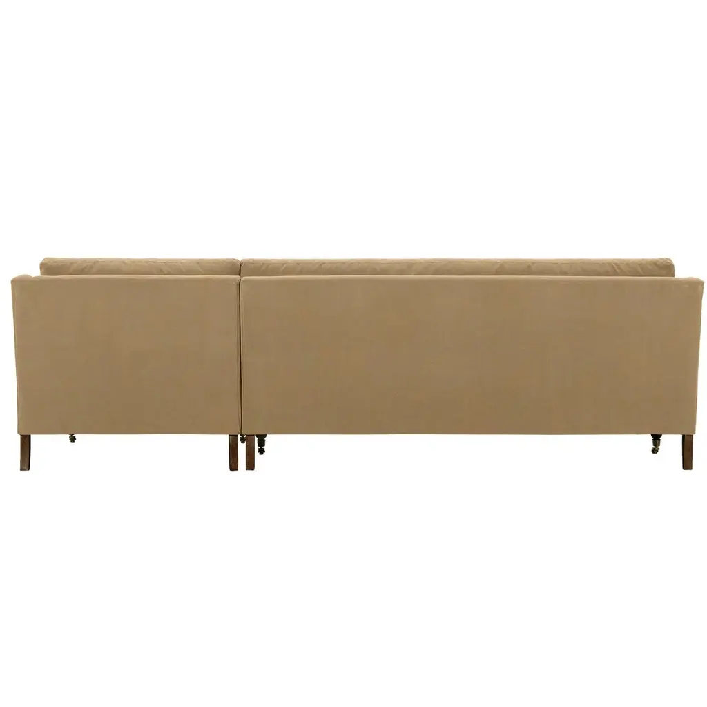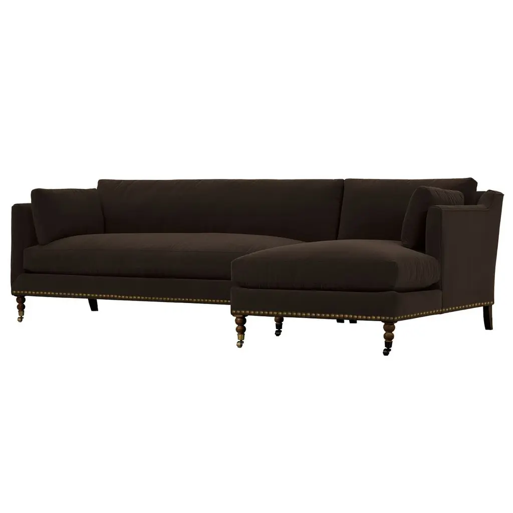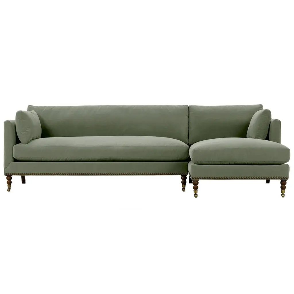 Exclusive to One Kings Lane: The Margot Velvet Sectional Chaise offers a luxurious blend of style and comfort, featuring sumptuous velvet upholstery, boxy track arms, and a chic chaise extension available in left or right-facing configurations. With generous feather-and-down cushioning, this sectional chaise invites relaxation and provides long-lasting support, making it the perfect addition to your living space. Also of note:• Brass casters on the front legs enhance the design and allow for easy movement without scratching your floors.• Frame: crafted from solid kiln-dried hardwood for exceptional durability.• Cushion Fill: cloud cushion with a high-resiliency foam core wrapped in a super soft foam layer, enclosed in a channel-quilted casing filled with a blend of 50% fiber, 5% down, and 45% feather.• Seat Construction: sinuous-springs system featuring heavy-gauge steel springs placed 4” - 5” apart for uniform comfort, reinforced on each end to withstand everyday use.• Seat Comfort: plush yet supportive, requiring regular fluffing and rotation to maintain the cushions' shape.