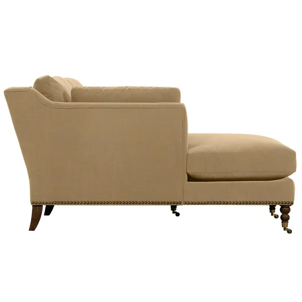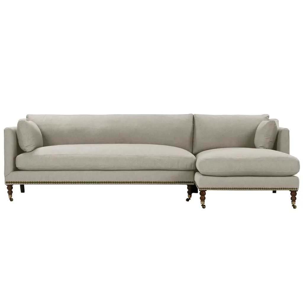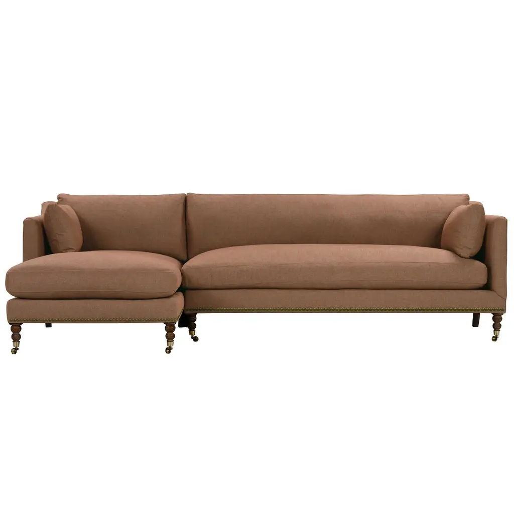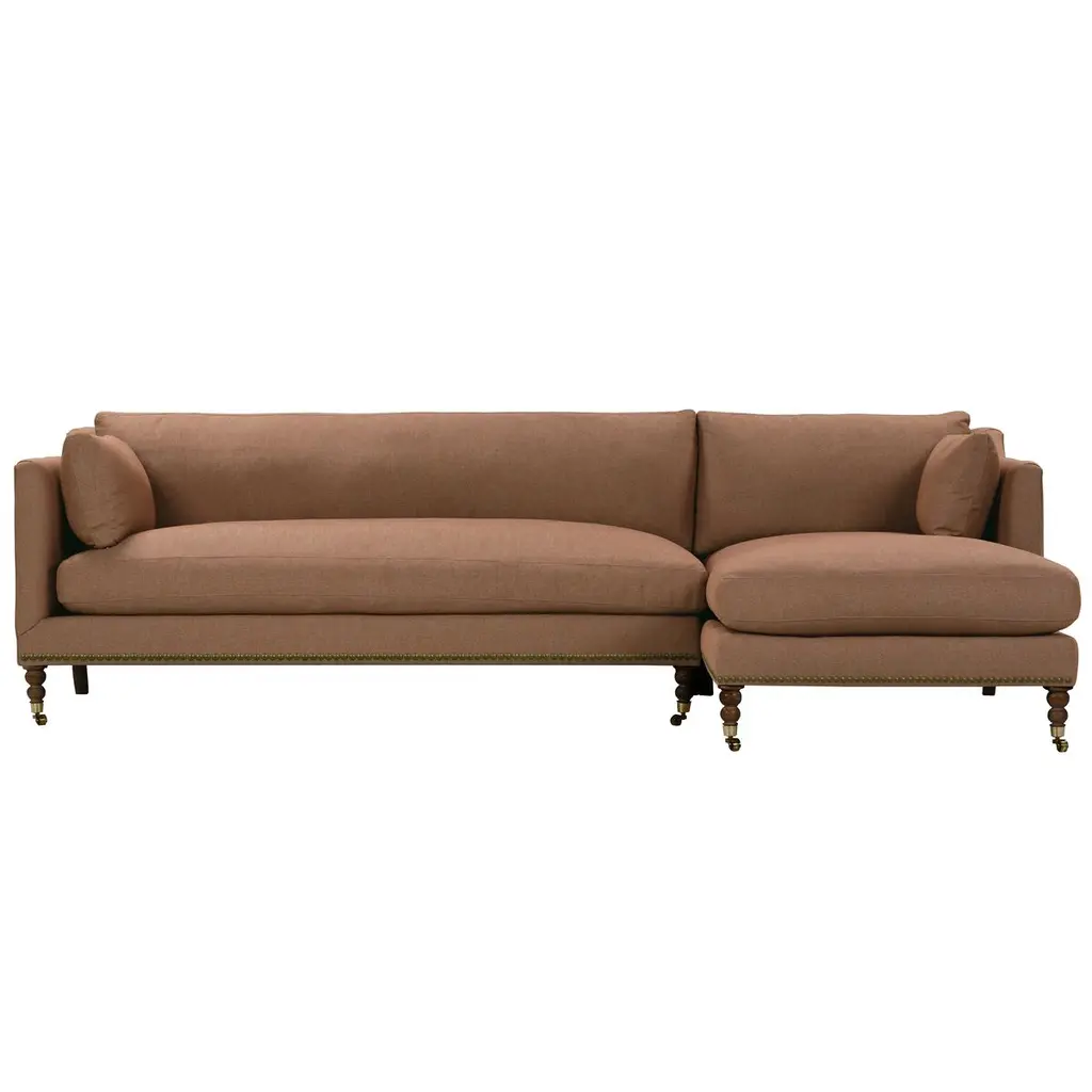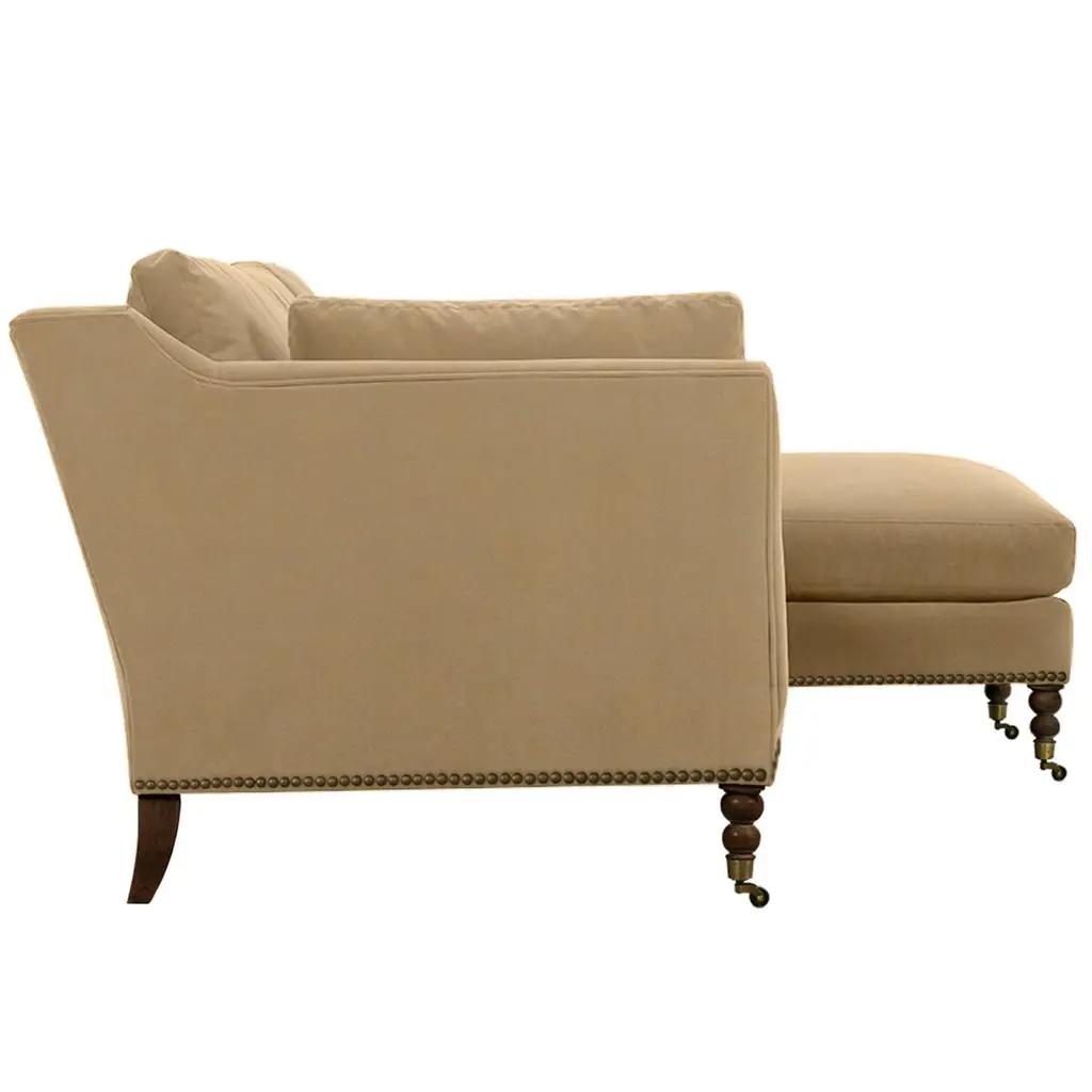 Exclusive to One Kings Lane: The Margot Velvet Sectional Chaise offers a luxurious blend of style and comfort, featuring sumptuous velvet upholstery, boxy track arms, and a chic chaise extension available in left or right-facing configurations. With generous feather-and-down cushioning, this sectional chaise invites relaxation and provides long-lasting support, making it the perfect addition to your living space. Also of note:• Brass casters on the front legs enhance the design and allow for easy movement without scratching your floors.• Frame: crafted from solid kiln-dried hardwood for exceptional durability.• Cushion Fill: cloud cushion with a high-resiliency foam core wrapped in a super soft foam layer, enclosed in a channel-quilted casing filled with a blend of 50% fiber, 5% down, and 45% feather.• Seat Construction: sinuous-springs system featuring heavy-gauge steel springs placed 4” - 5” apart for uniform comfort, reinforced on each end to withstand everyday use.• Seat Comfort: plush yet supportive, requiring regular fluffing and rotation to maintain the cushions' shape.