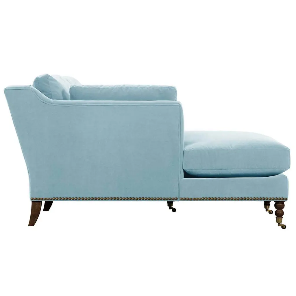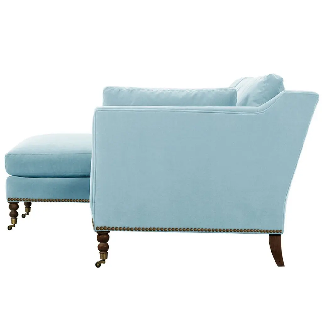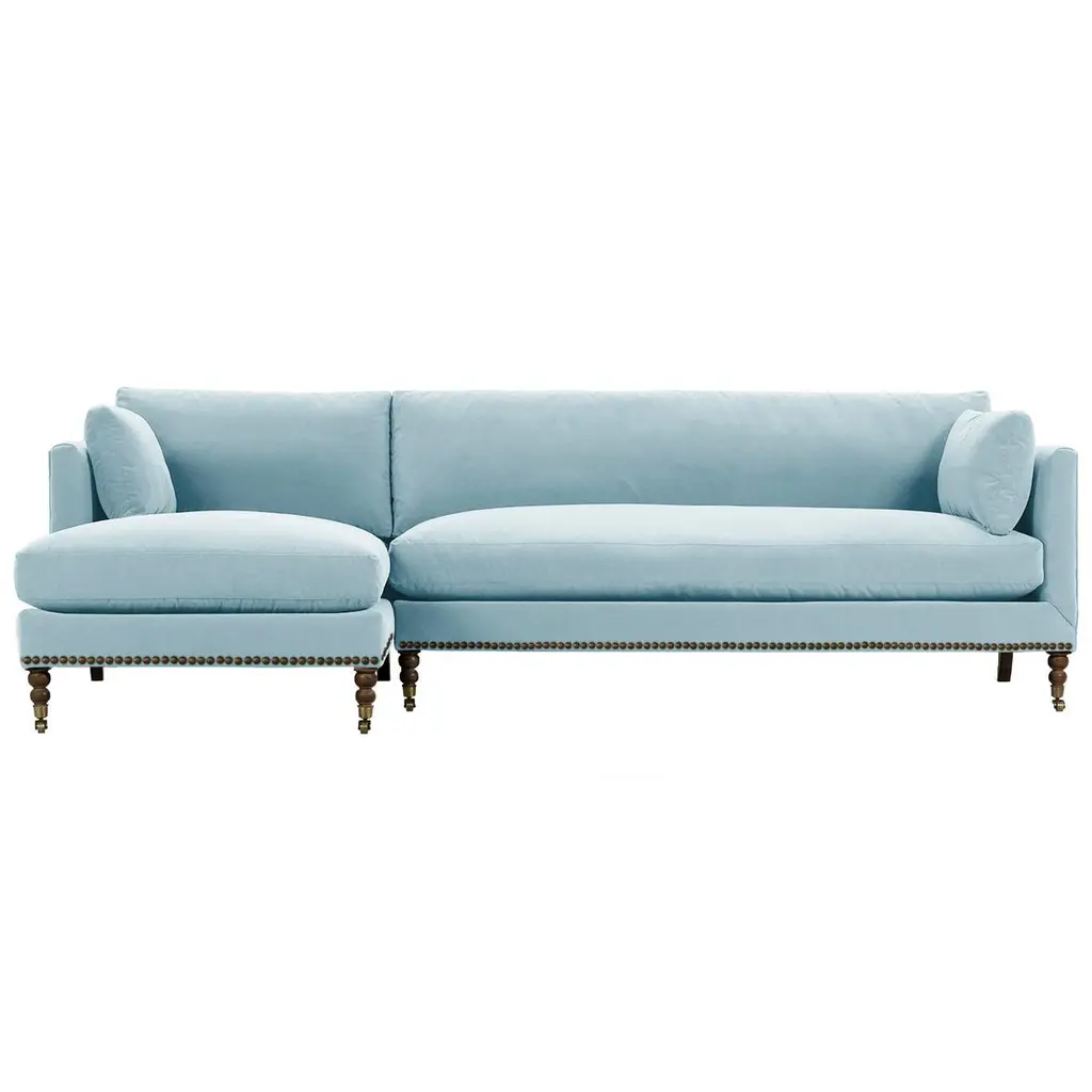 Exclusive to One Kings Lane: The Margot Velvet Sectional Chaise offers a luxurious blend of style and comfort, featuring sumptuous velvet upholstery, boxy track arms, and a chic chaise extension available in left or right-facing configurations. With generous feather-and-down cushioning, this sectional chaise invites relaxation and provides long-lasting support, making it the perfect addition to your living space. Also of note:• Brass casters on the front legs enhance the design and allow for easy movement without scratching your floors.• Frame: crafted from solid kiln-dried hardwood for exceptional durability.• Cushion Fill: cloud cushion with a high-resiliency foam core wrapped in a super soft foam layer, enclosed in a channel-quilted casing filled with a blend of 50% fiber, 5% down, and 45% feather.• Seat Construction: sinuous-springs system featuring heavy-gauge steel springs placed 4” - 5” apart for uniform comfort, reinforced on each end to withstand everyday use.• Seat Comfort: plush yet supportive, requiring regular fluffing and rotation to maintain the cushions' shape.